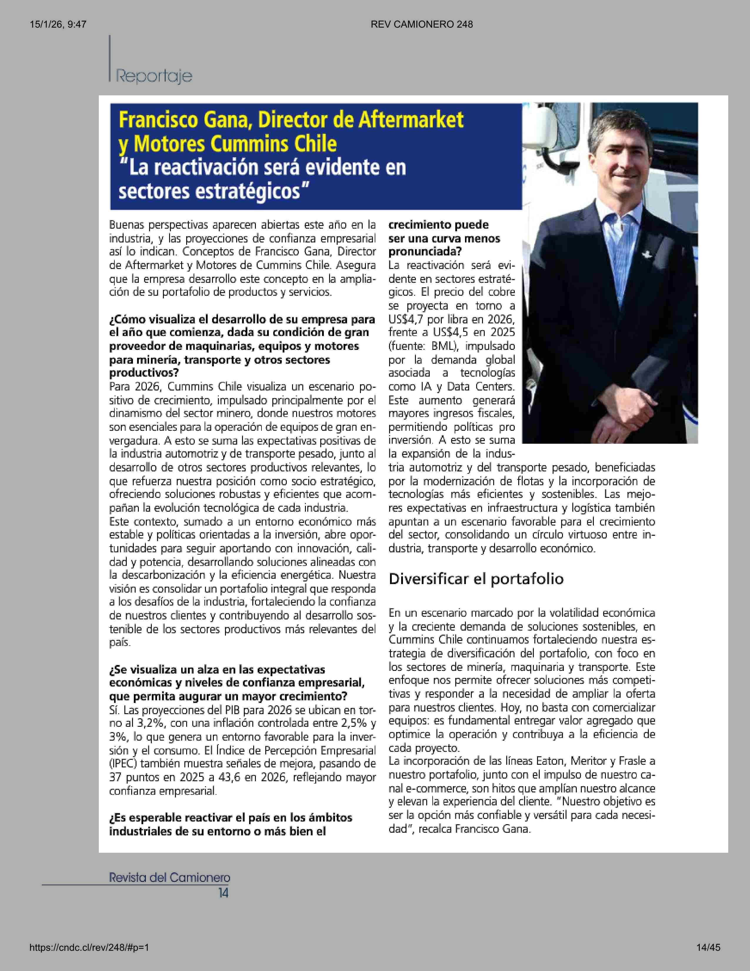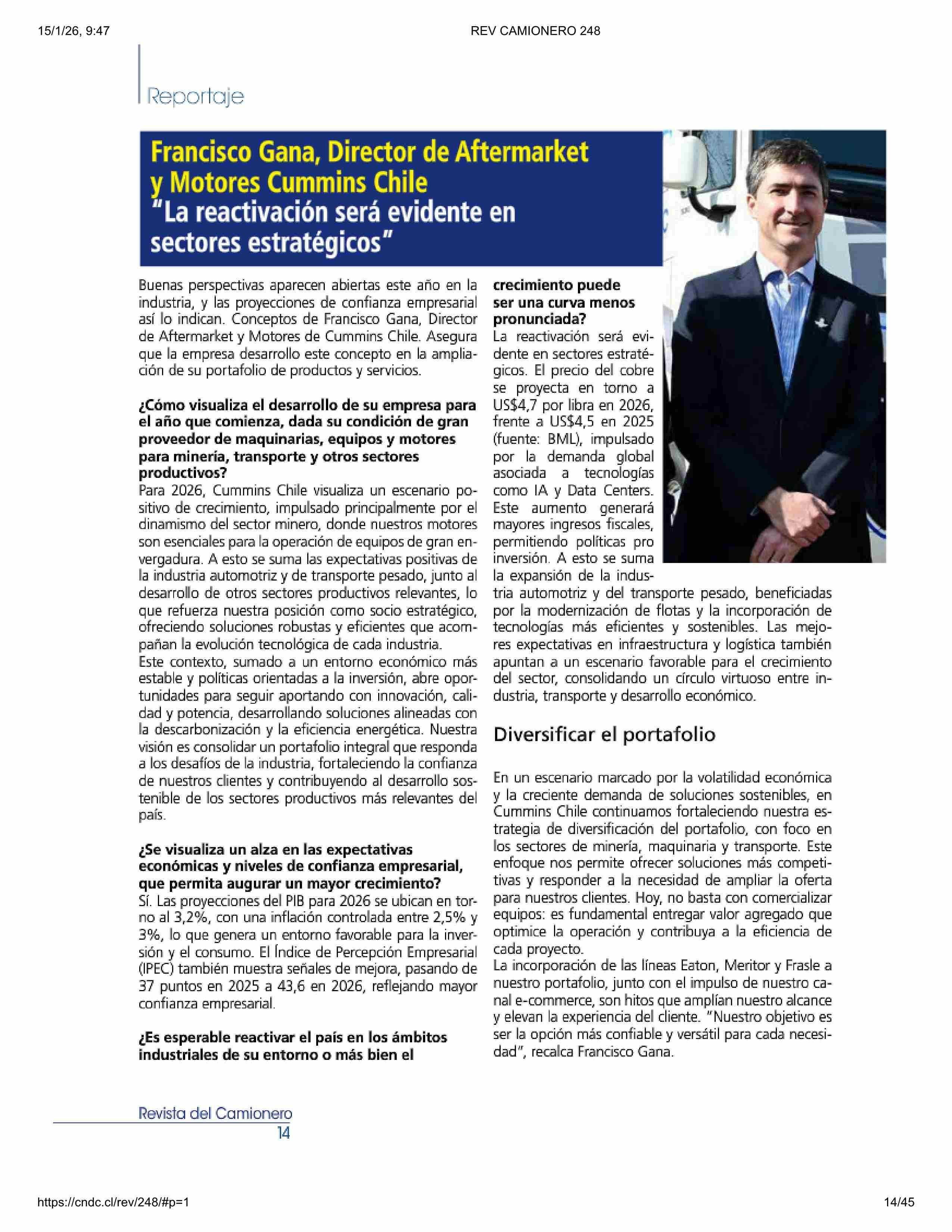 Francisco Gana, Director de Aftermarket y Motores Cummins Chile “La reactivación será evidente en sectores estratégicos” 15-01-2026 Revista Del Camionero |