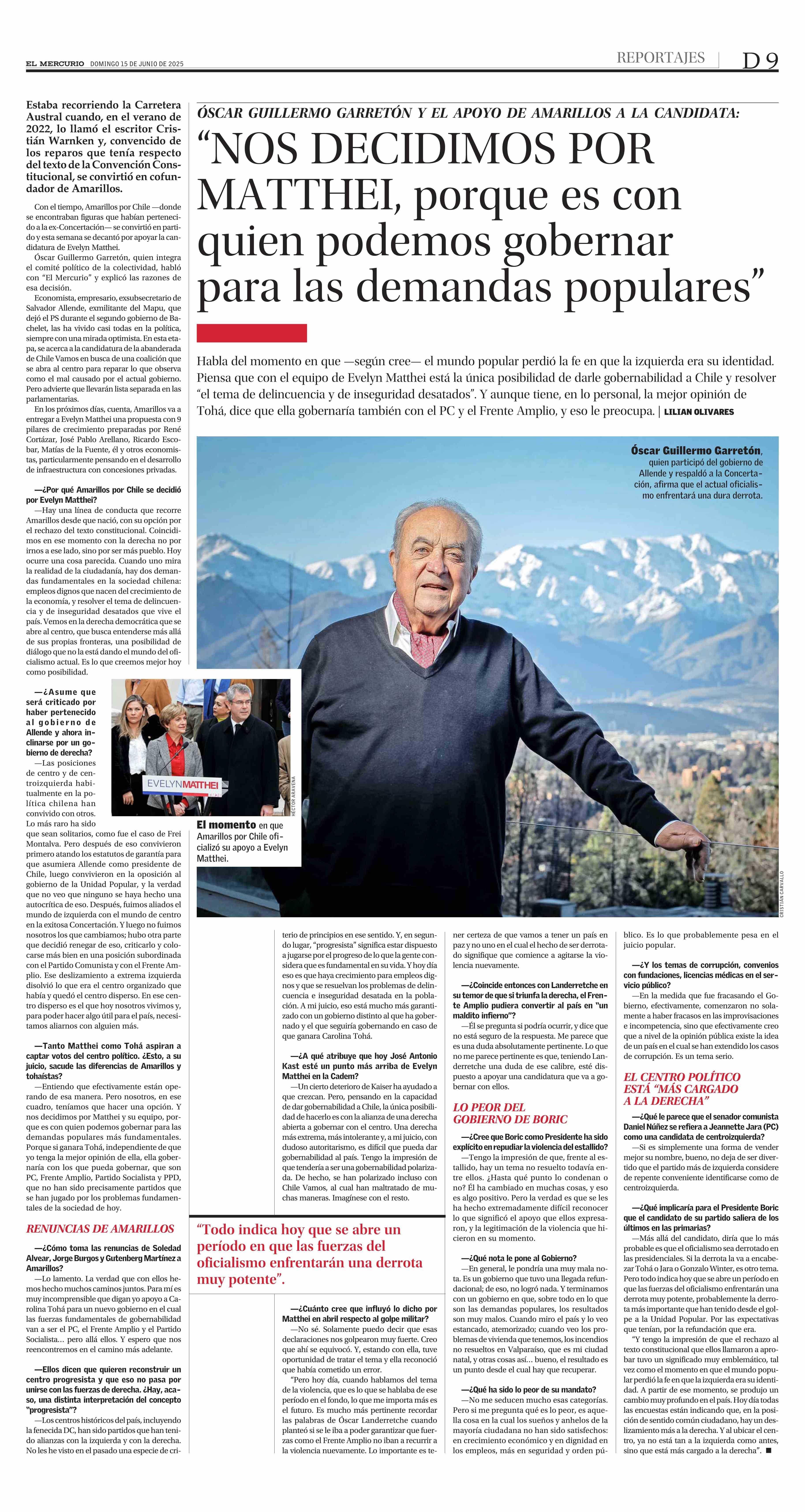 "NOS DECIDIMOS POR MATTHEI, porque es con quien podemos gobernar para las demandas populares" 15-06-2025 El Mercurio |