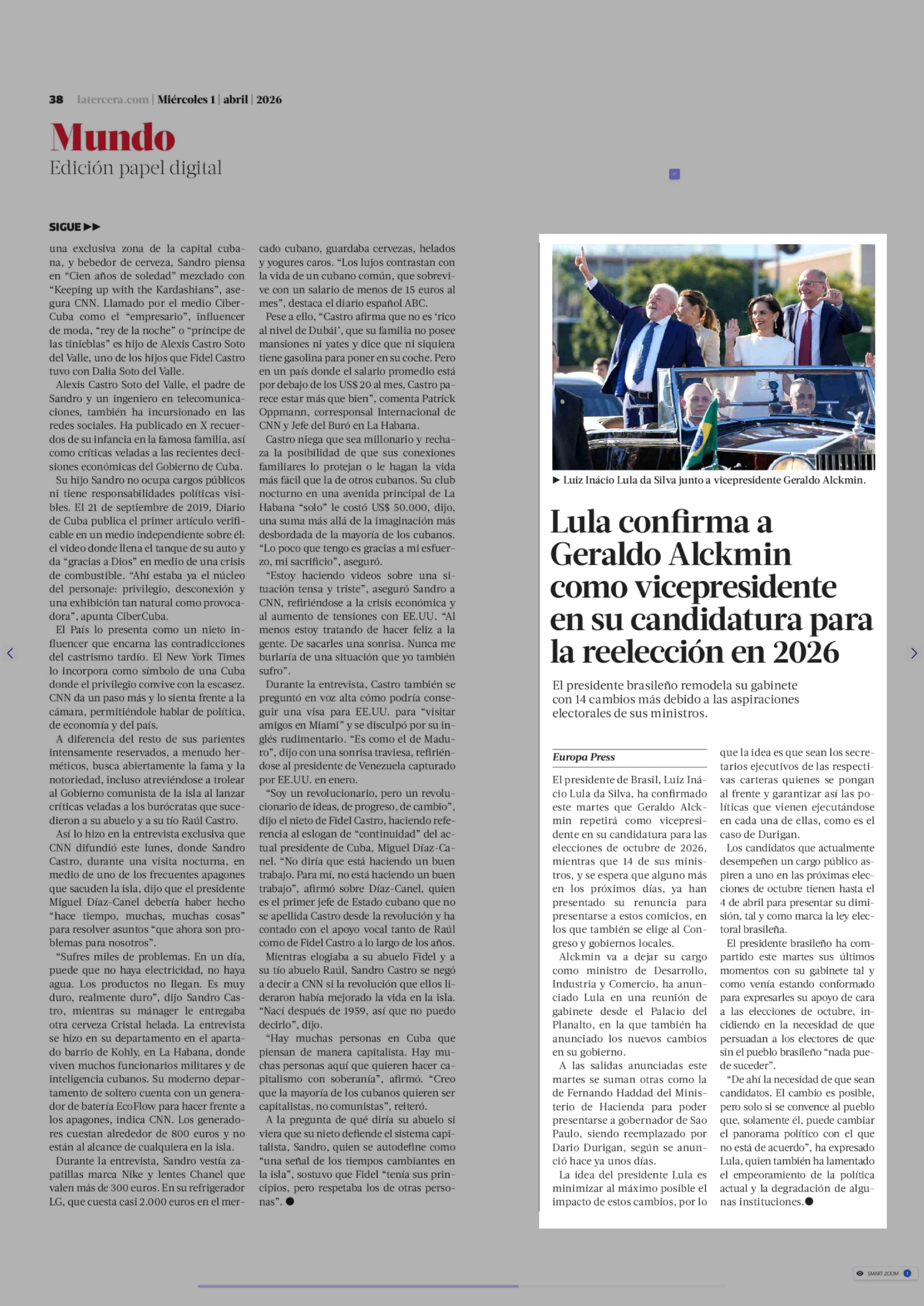 Lula confirma a Geraldo Alckmin como vicepresidente en su candidatura para la reelección en 2026 01-04-2026 La Tercera |