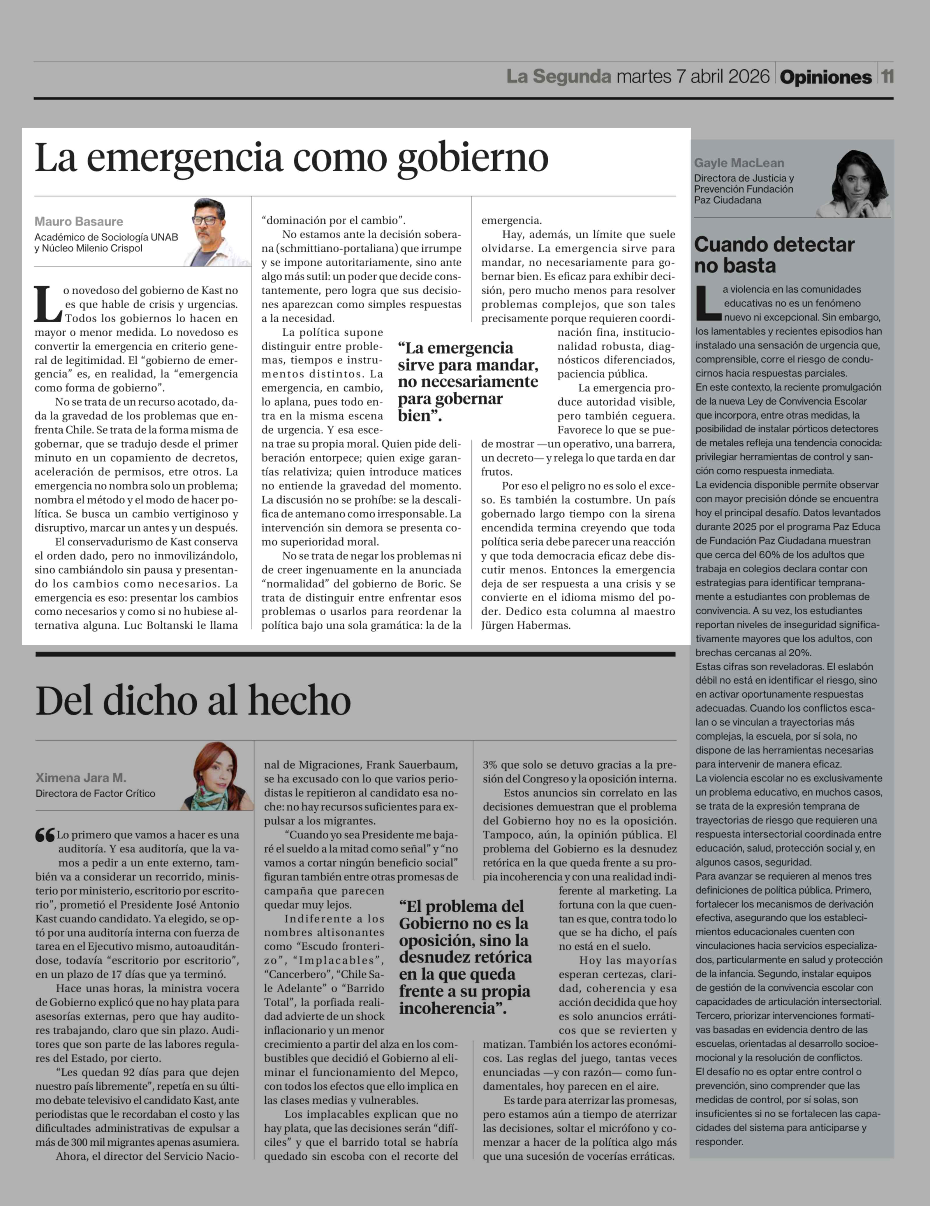 Columnas de Opinión: La emergencia como gobierno 07-04-2026 La Segunda |