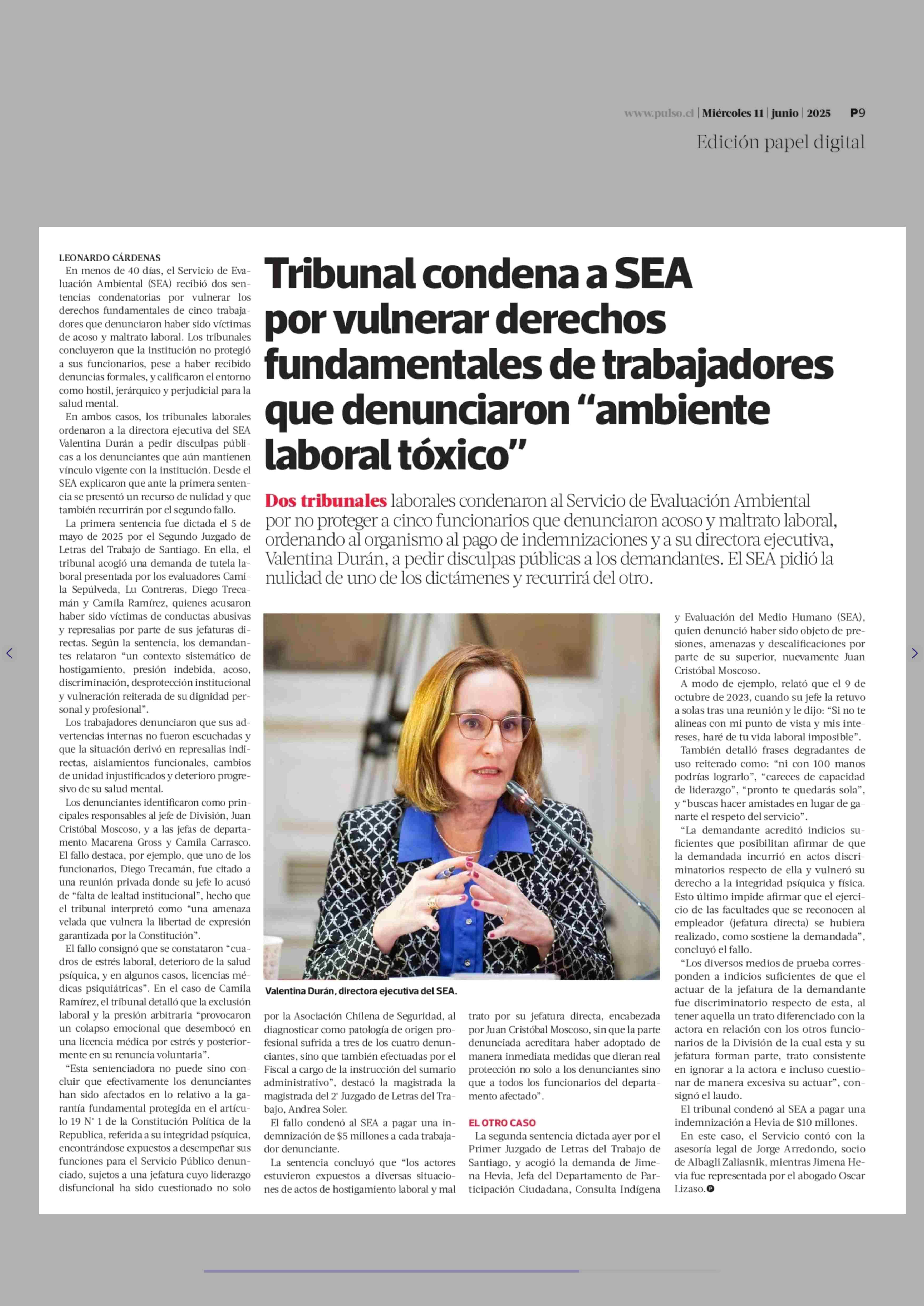 Tribunal condena a SEA por vulnerar derechos fundamentales de trabajadores que denunciaron “ambiente laboral tóxico” 11-06-2025 La Tercera |