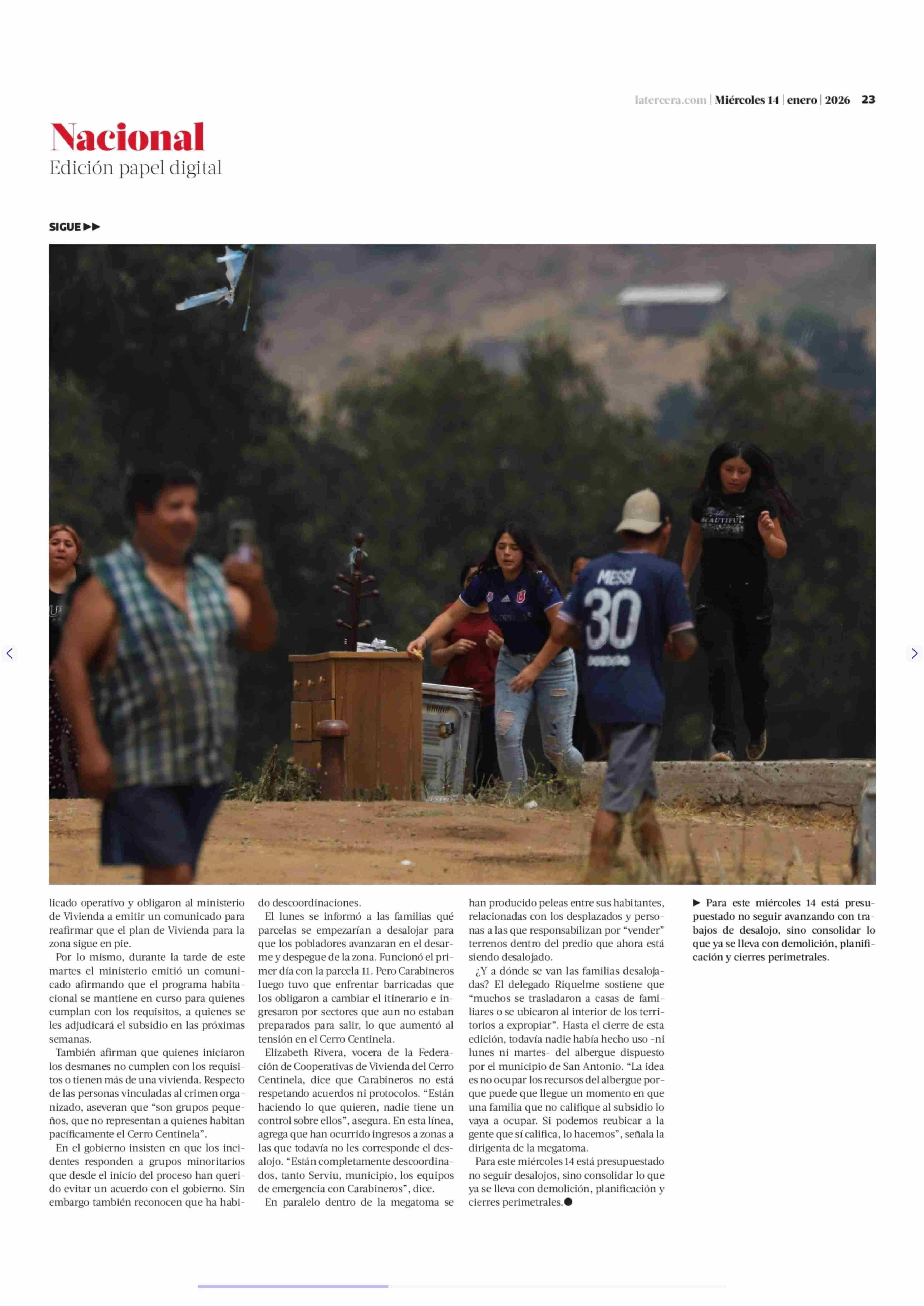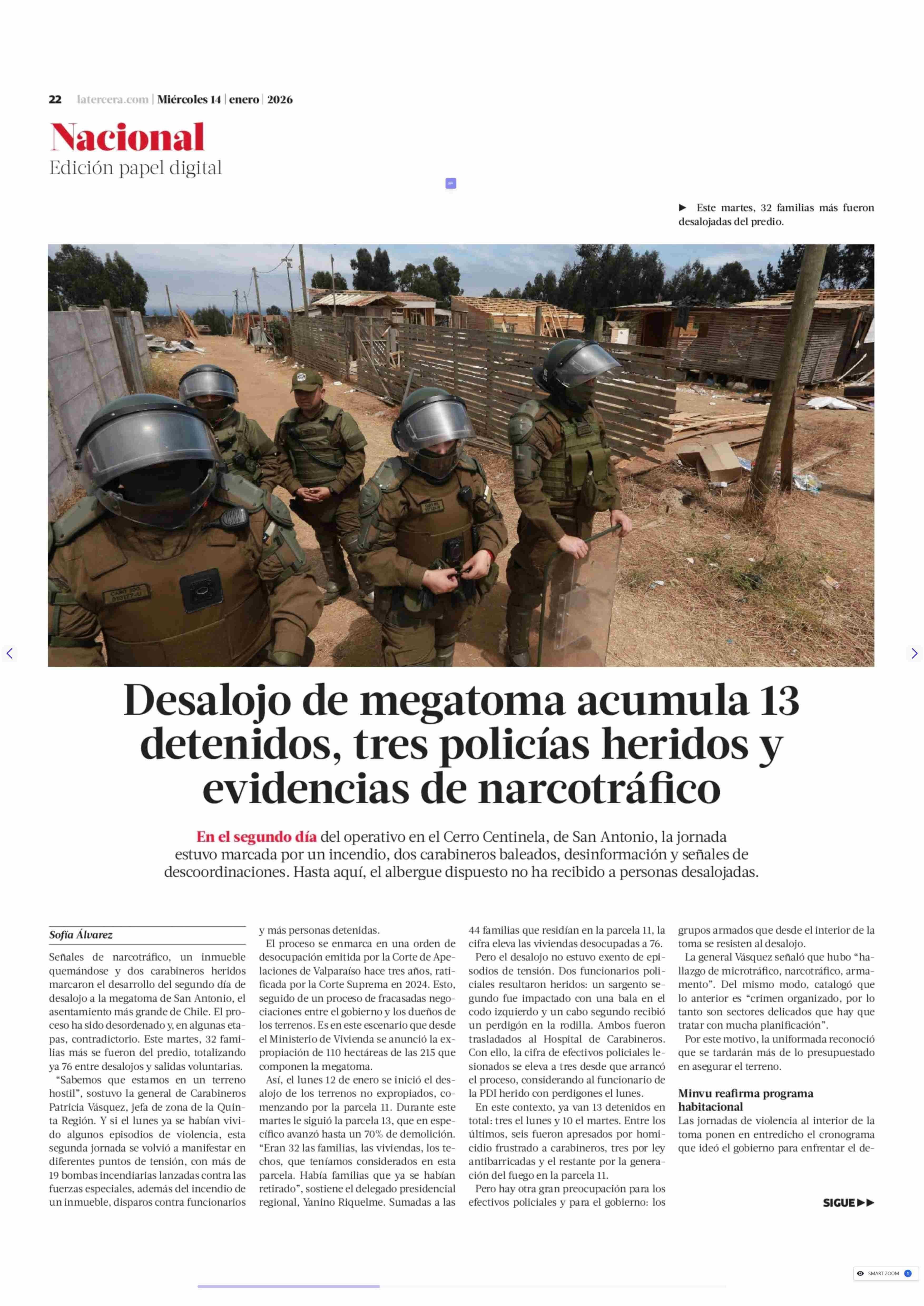 Desalojo de megatoma acumula 13 detenidos, tres policías heridos y evidencias de narcotráfico 14-01-2026 La Tercera |