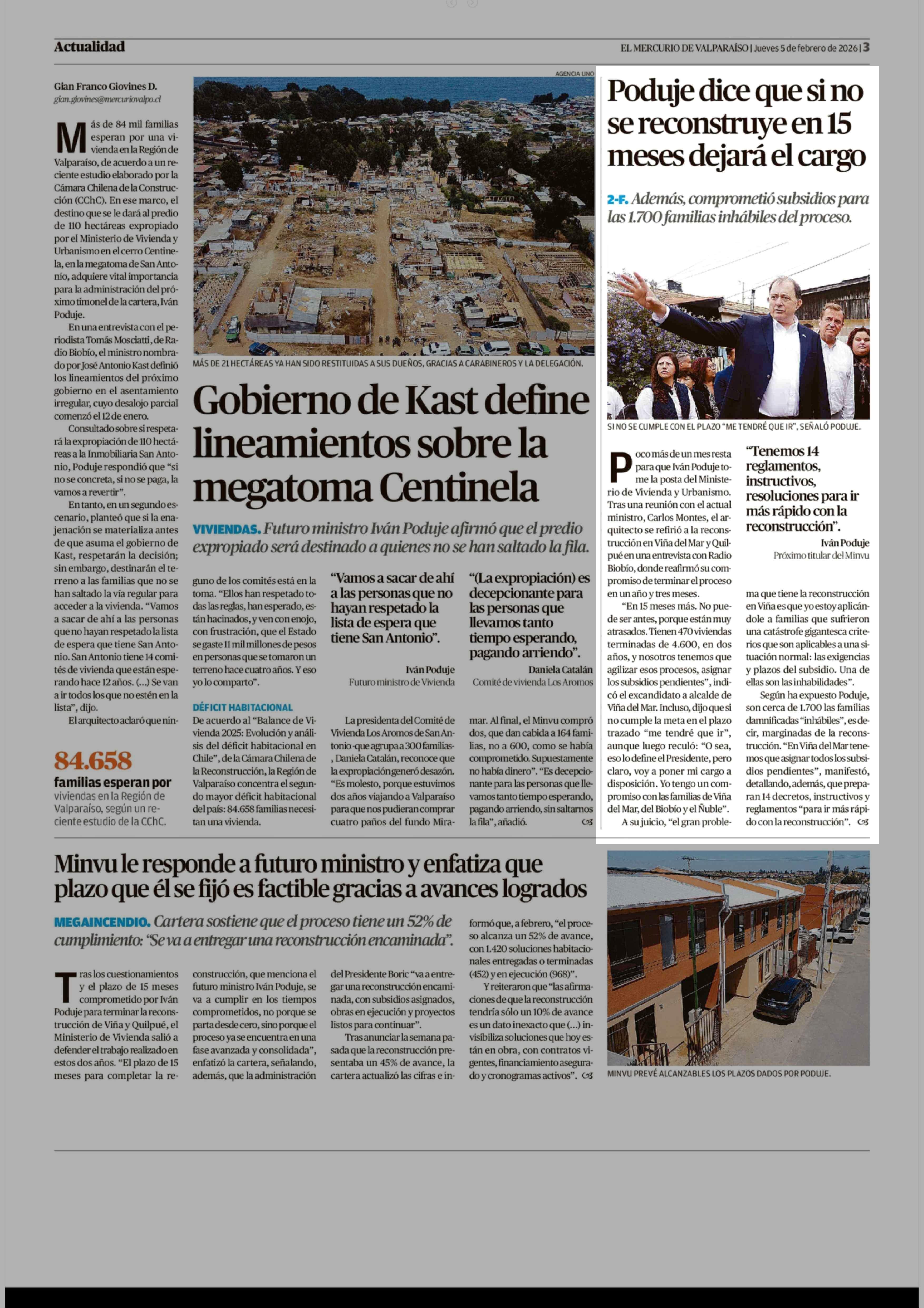 Poduje dice que si no se reconstruye en 15 meses dejará el cargo 05-02-2026 El Mercurio de Valparaíso |