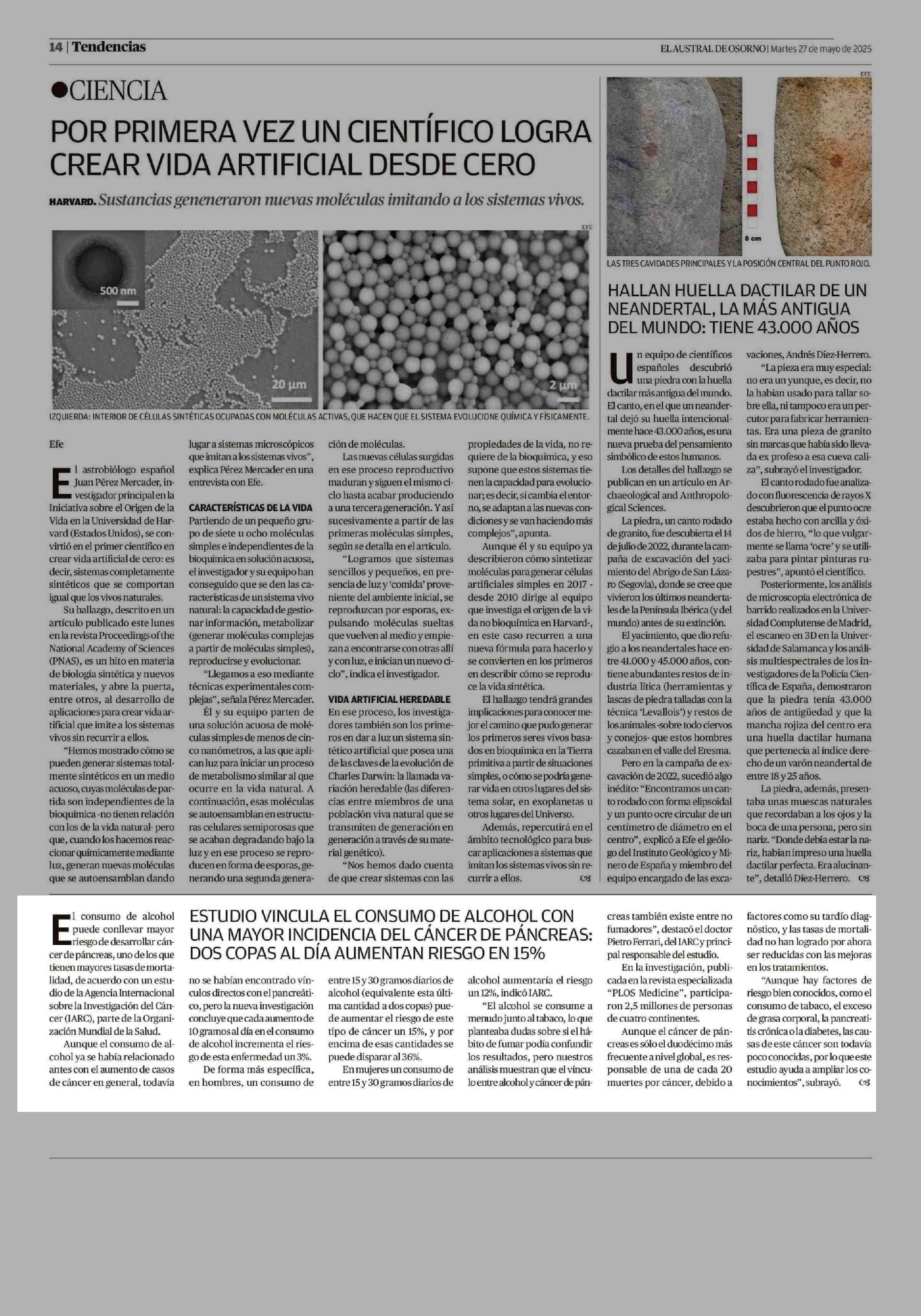 ESTUDIO VINCULA EL CONSUMO DE ALCOHOL CON UNA MAYOR INCIDENCIA DEL CÁNCER DE PÁNCREAS: DOS COPAS AL DÍA AUMENTAN RIESGO EN 15% 27-05-2025 El Austral de Osorno |