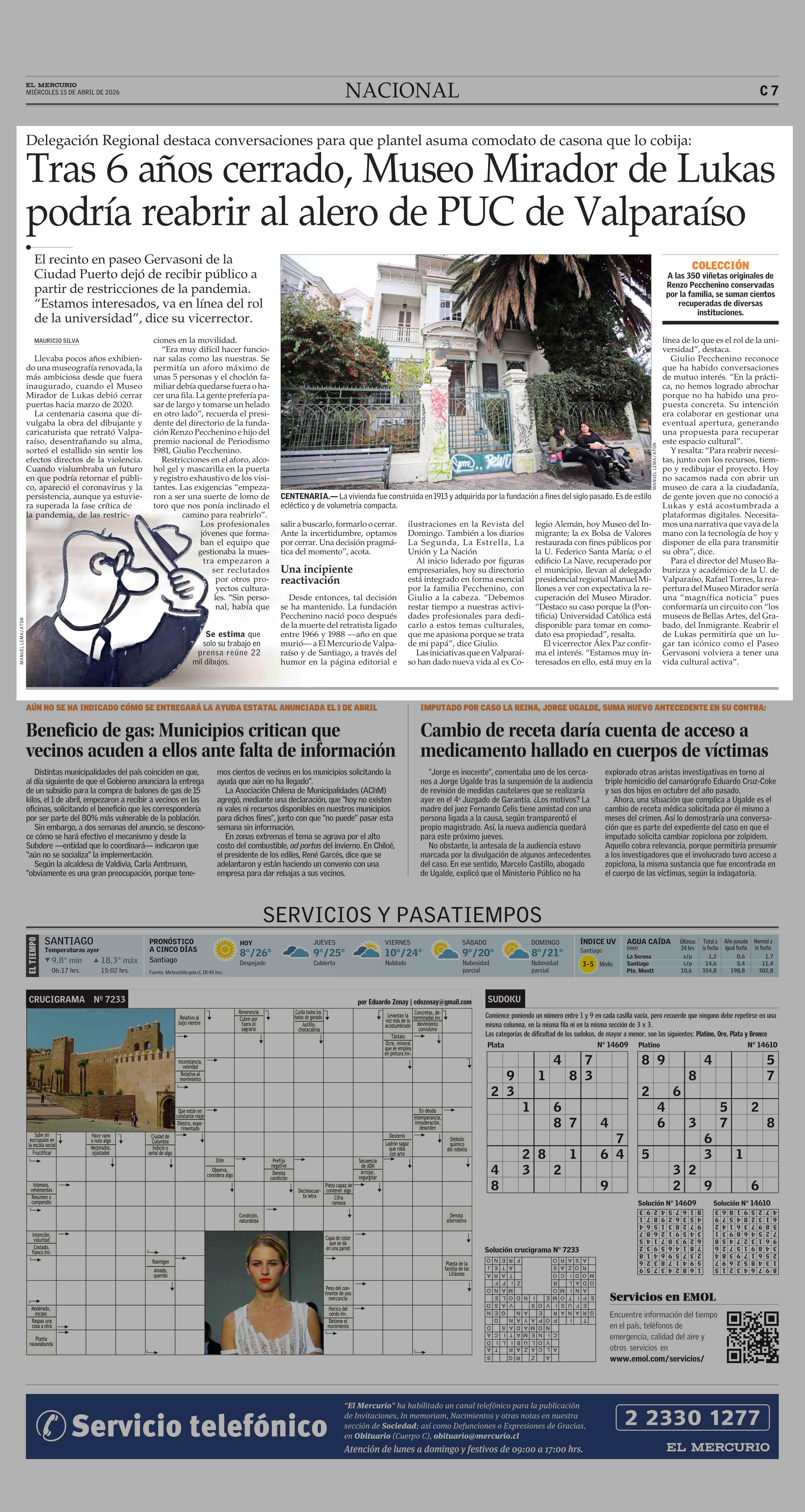 Tras 6 años cerrado, Museo Mirador de Lukas podría reabrir al alero de PUC de Valparaíso 15-04-2026 El Mercurio |