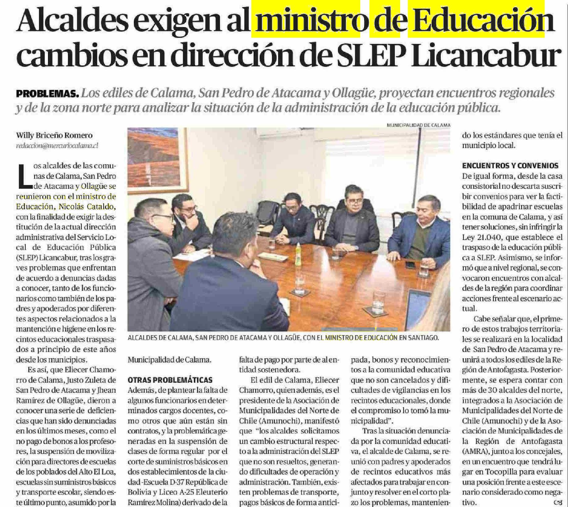 Alcaldes exigen al ministro de Educación cambios en dirección de SLEP Licancabur 17-06-2025 El Mercurio de Calama |
