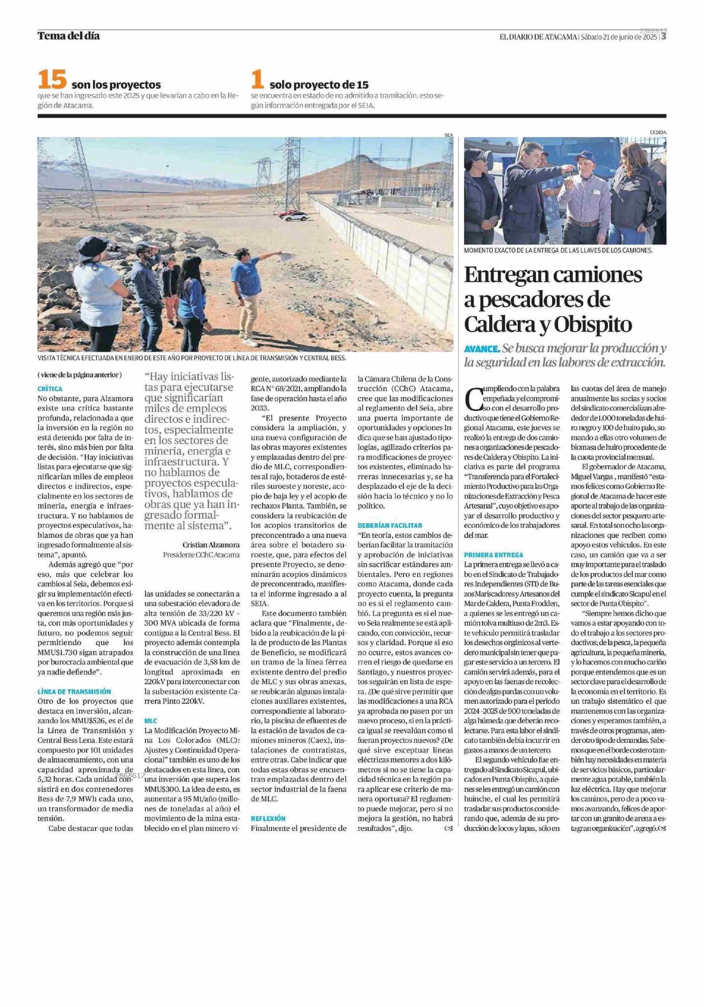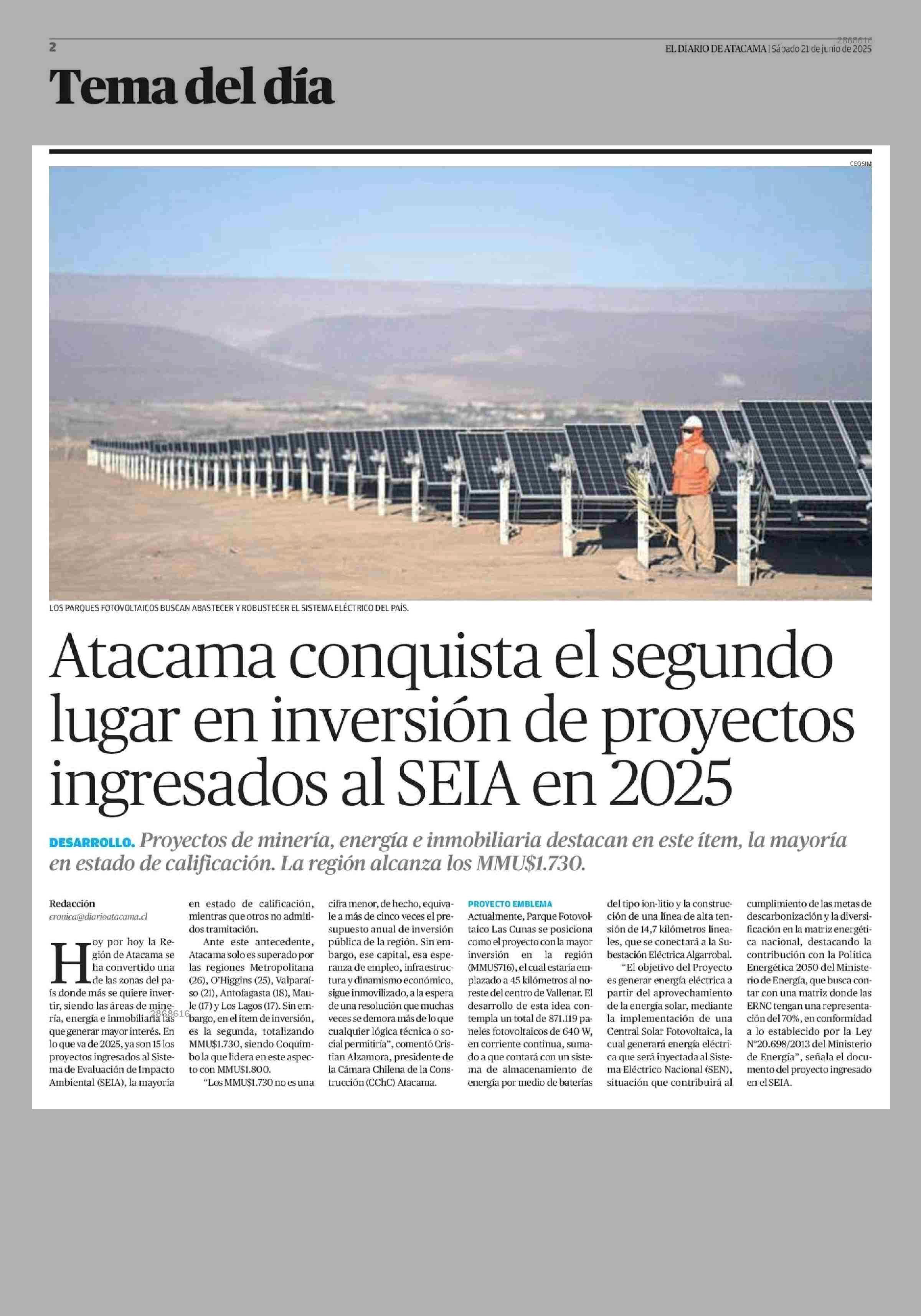 Atacama conquista el segundo lugar en inversión de proyectos ingresados al SEIA en 2025 21-06-2025 El Diario de Atacama |