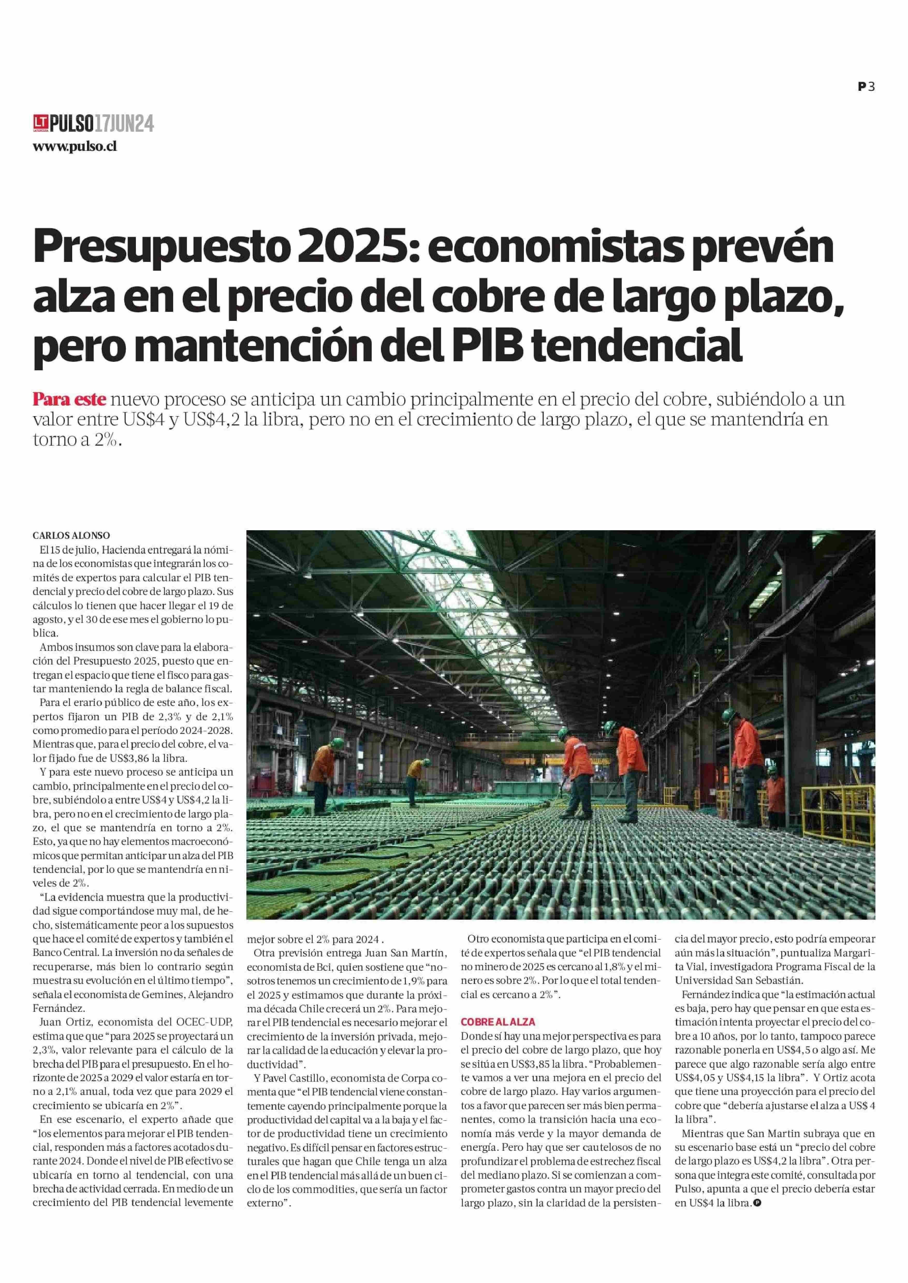 Presupuesto 2025: economistas prevén alza en el precio del cobre de largo plazo, pero mantención del PIB tendencial 17-06-2024 La Tercera |