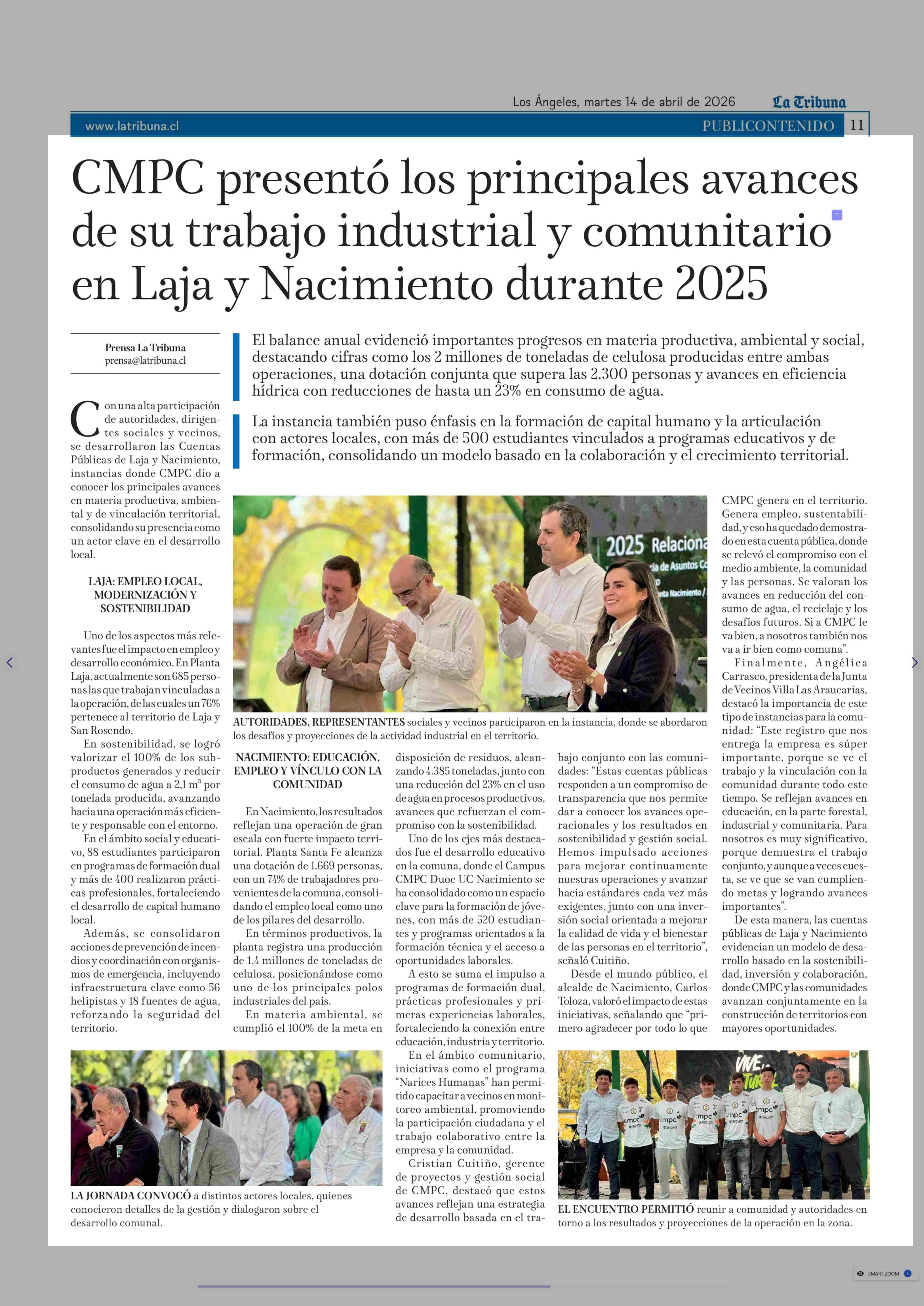 CMPC presentó los principales avances de su trabajo industrial y comunitario en Laja y Nacimiento durante 2026 14-04-2026 La Tribuna |