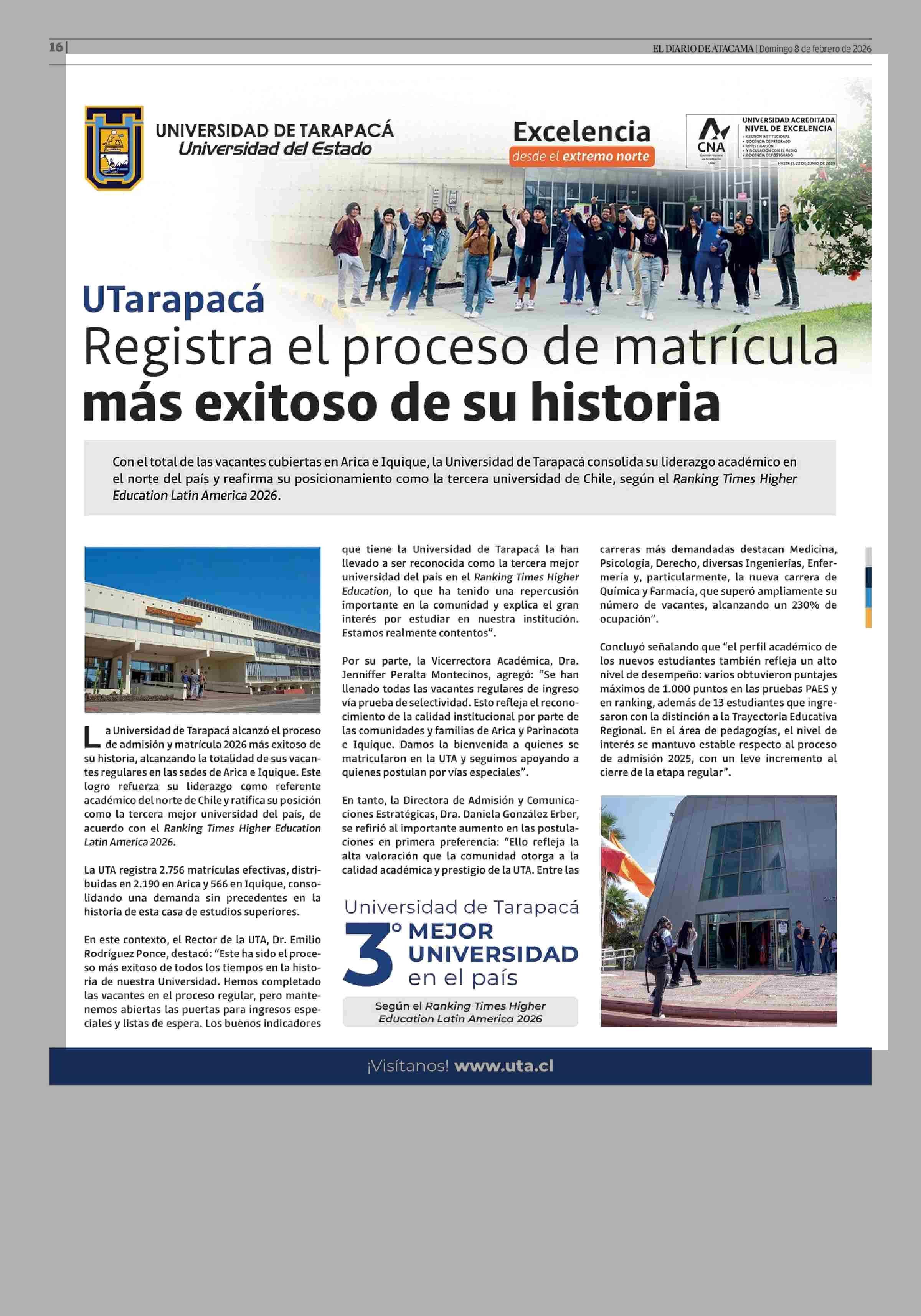 UTarapacá Registra el proceso de matrícula más exitoso de su historia 08-02-2026 El Diario de Atacama |