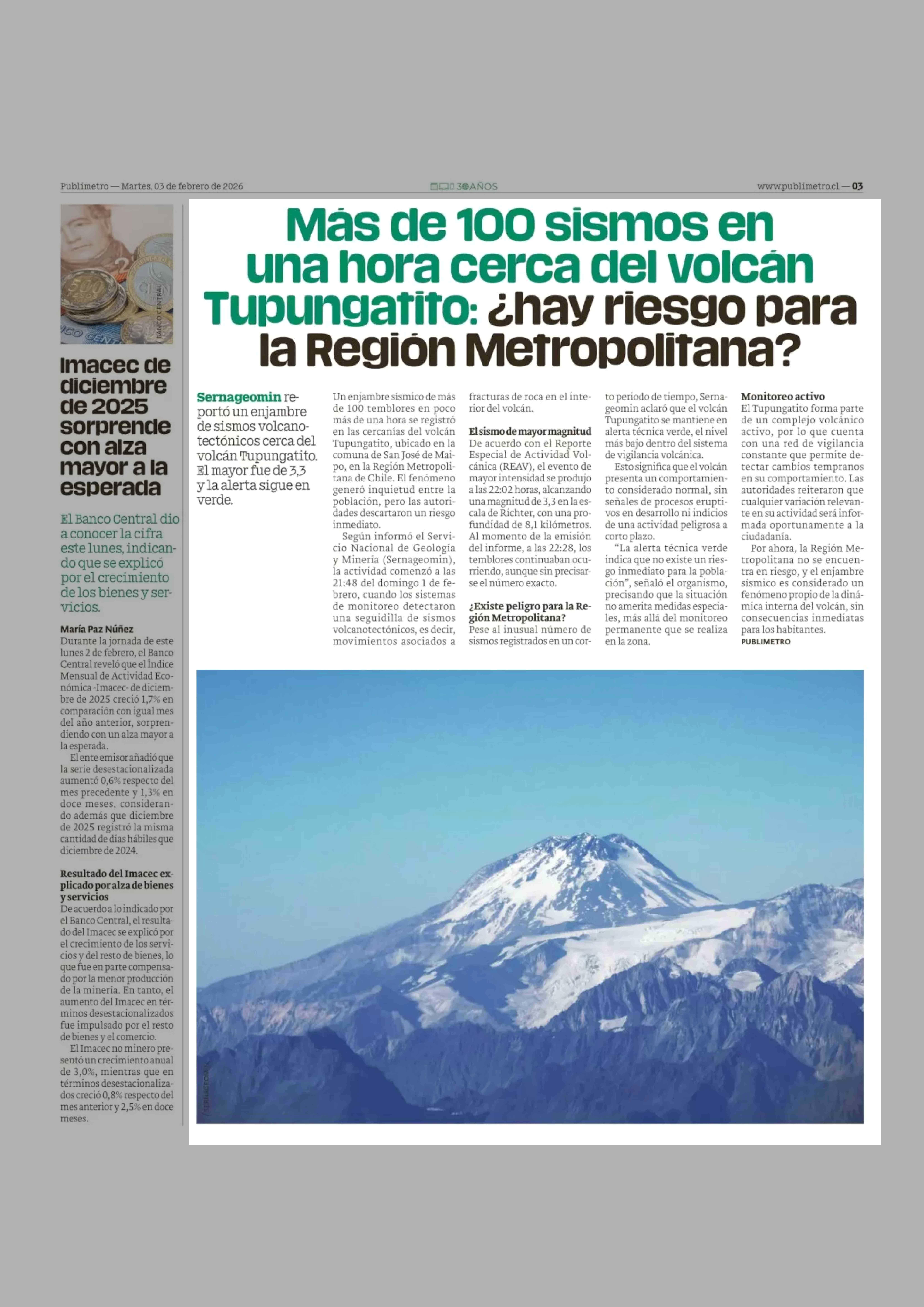 Mas de 100 sismos en una hora cerca del volcan Tupungatito: ¿ hay riesgo para la Region Metropolitana? 03-02-2026 Publimetro |