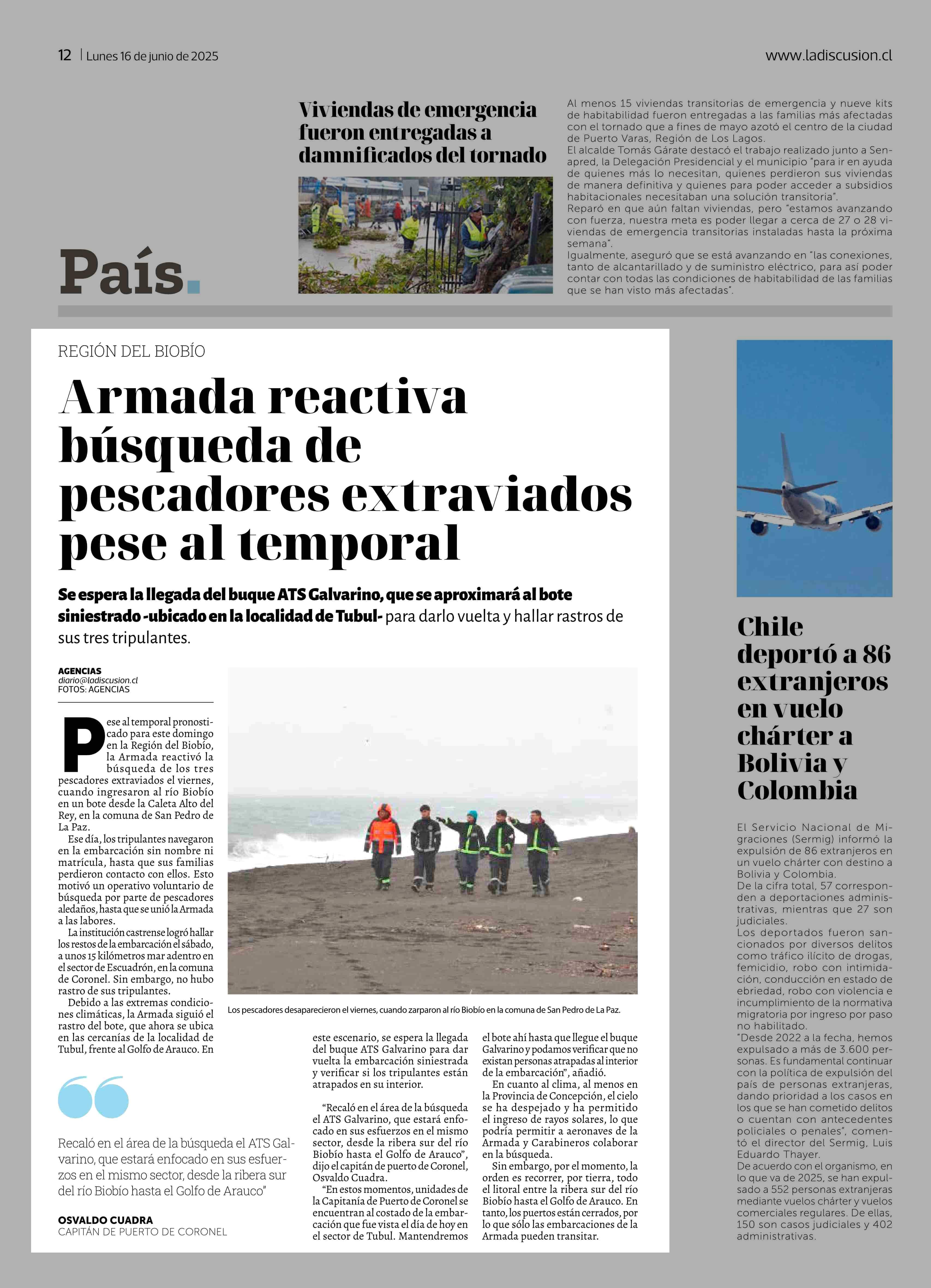 Armada reactiva búsqueda de pescadores extraviados pese al temporal 16-06-2025 La Discusión |