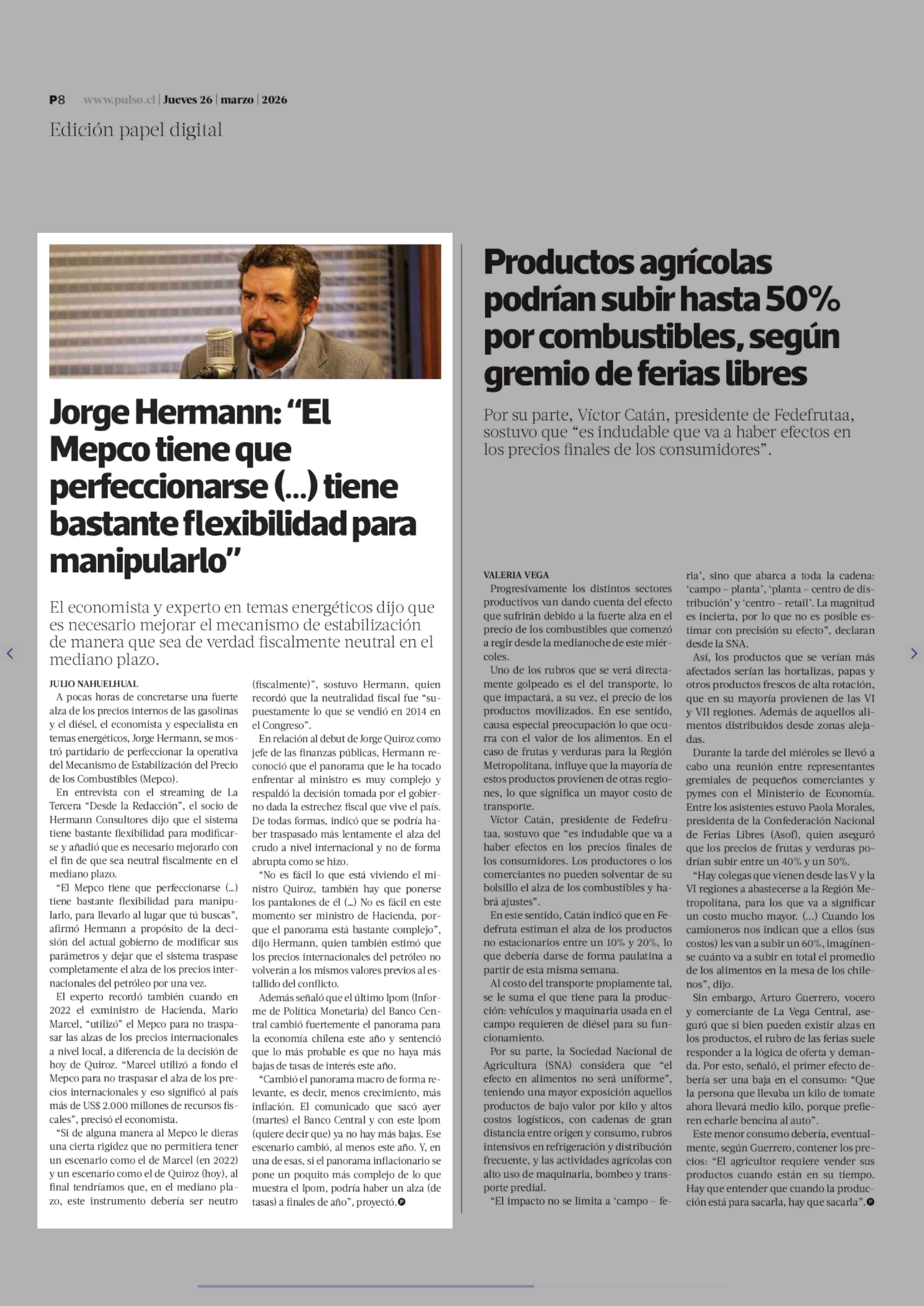 Jorge Hermann: "El Mepco tiene que perfeccionarse ( ... ) tiene bastante flexibilidad para manipularlo" 26-03-2026 La Tercera |