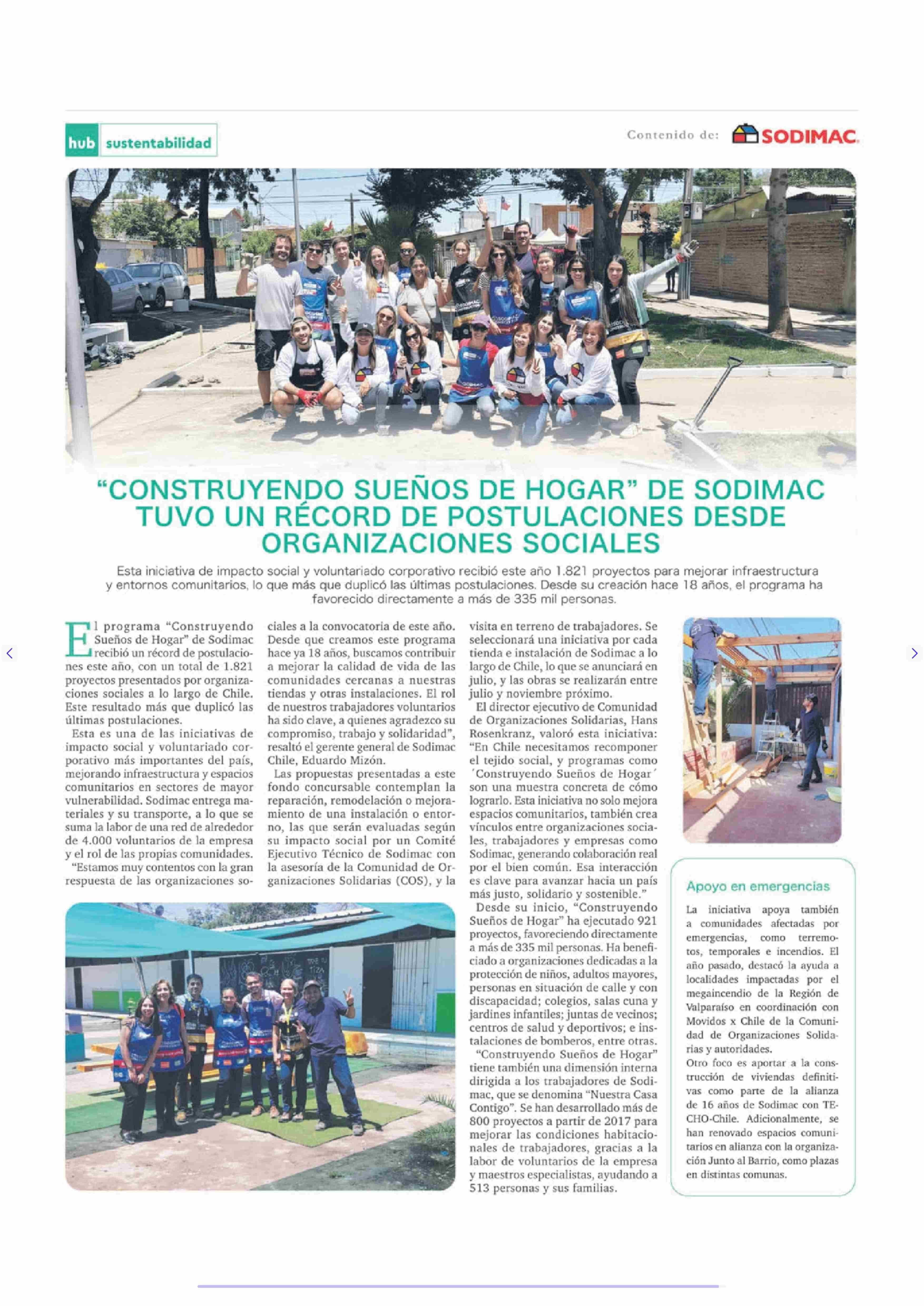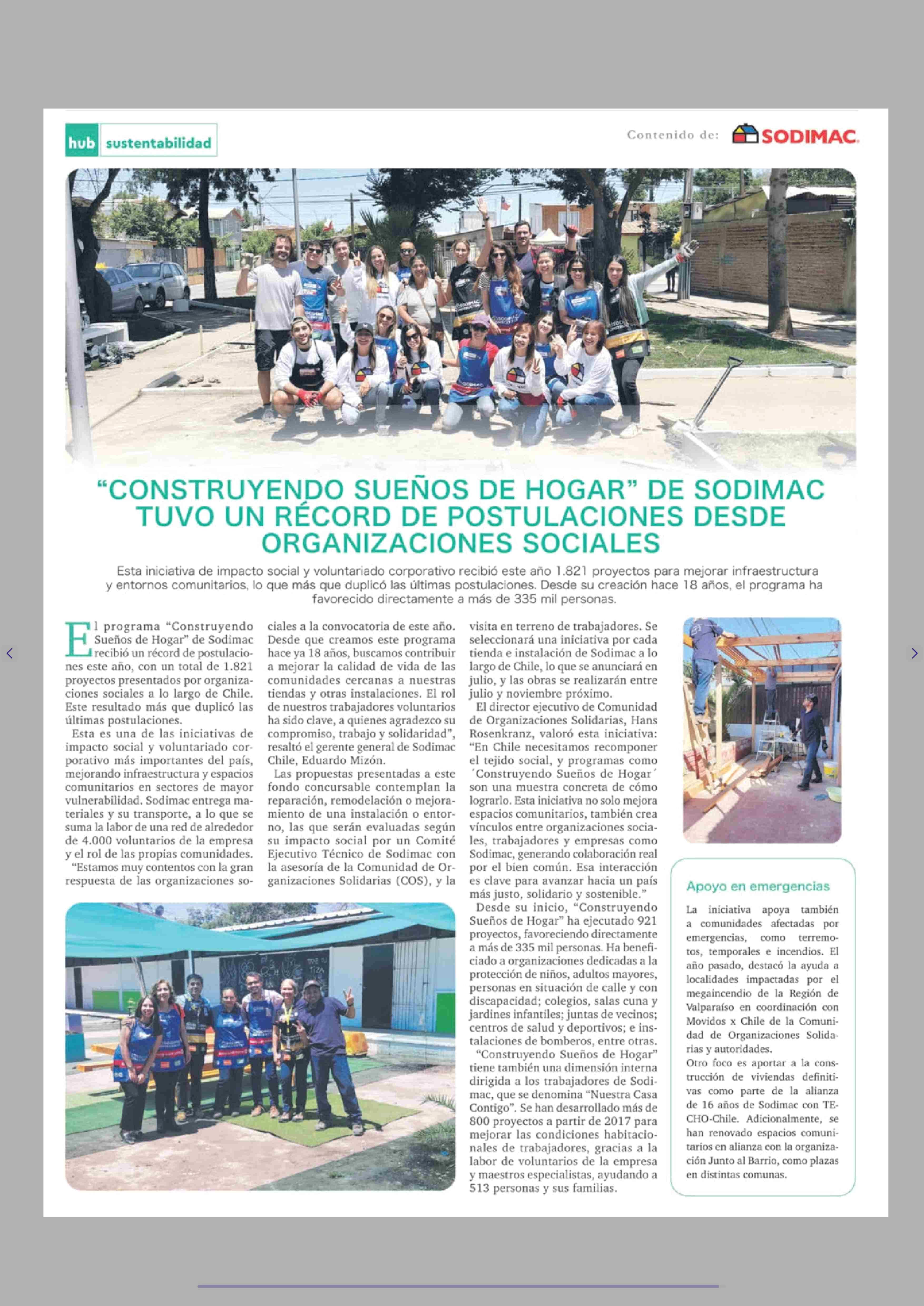 | Título: | “CONSTRUYENDO SUEÑOS DE HOGAR” DE SODIMAC TUVO UN RÉCORD DE POSTULACIONES DESDE ORGANIZACIONES SOCIALES |