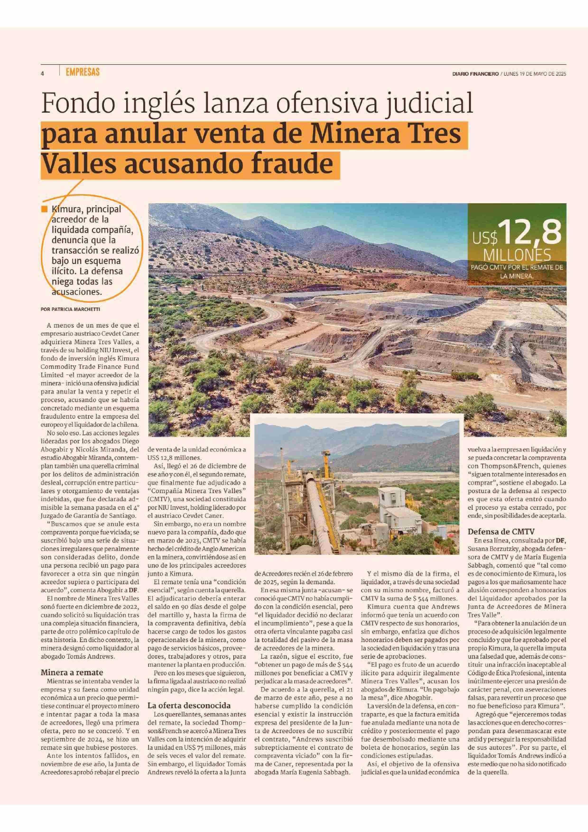 Fondo inglés lanza ofensiva judicial para anular venta de Minera Tres Valles acusando fraude 19-05-2025 Diario Financiero |