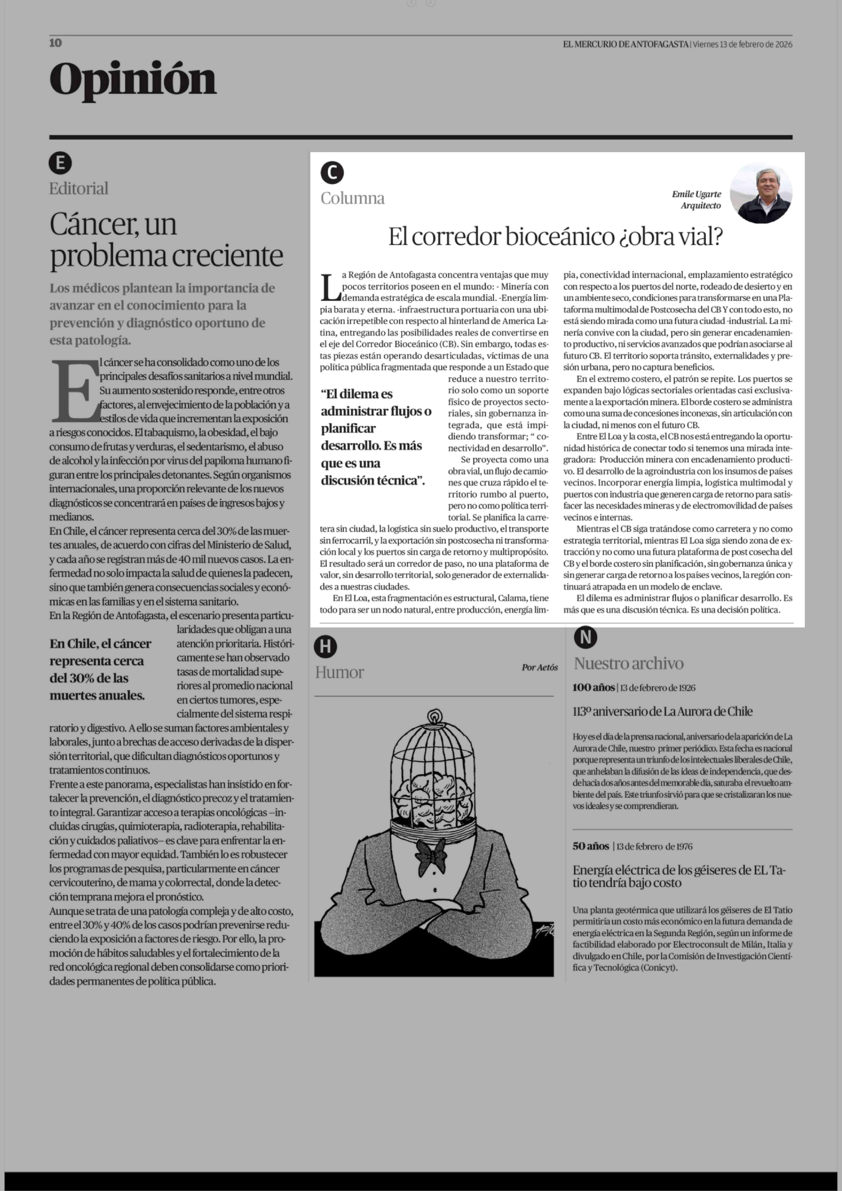 Columnas de Opinión: El corredor bioceánico ¿obra vial? 13-02-2026 El Mercurio de Antofagasta |