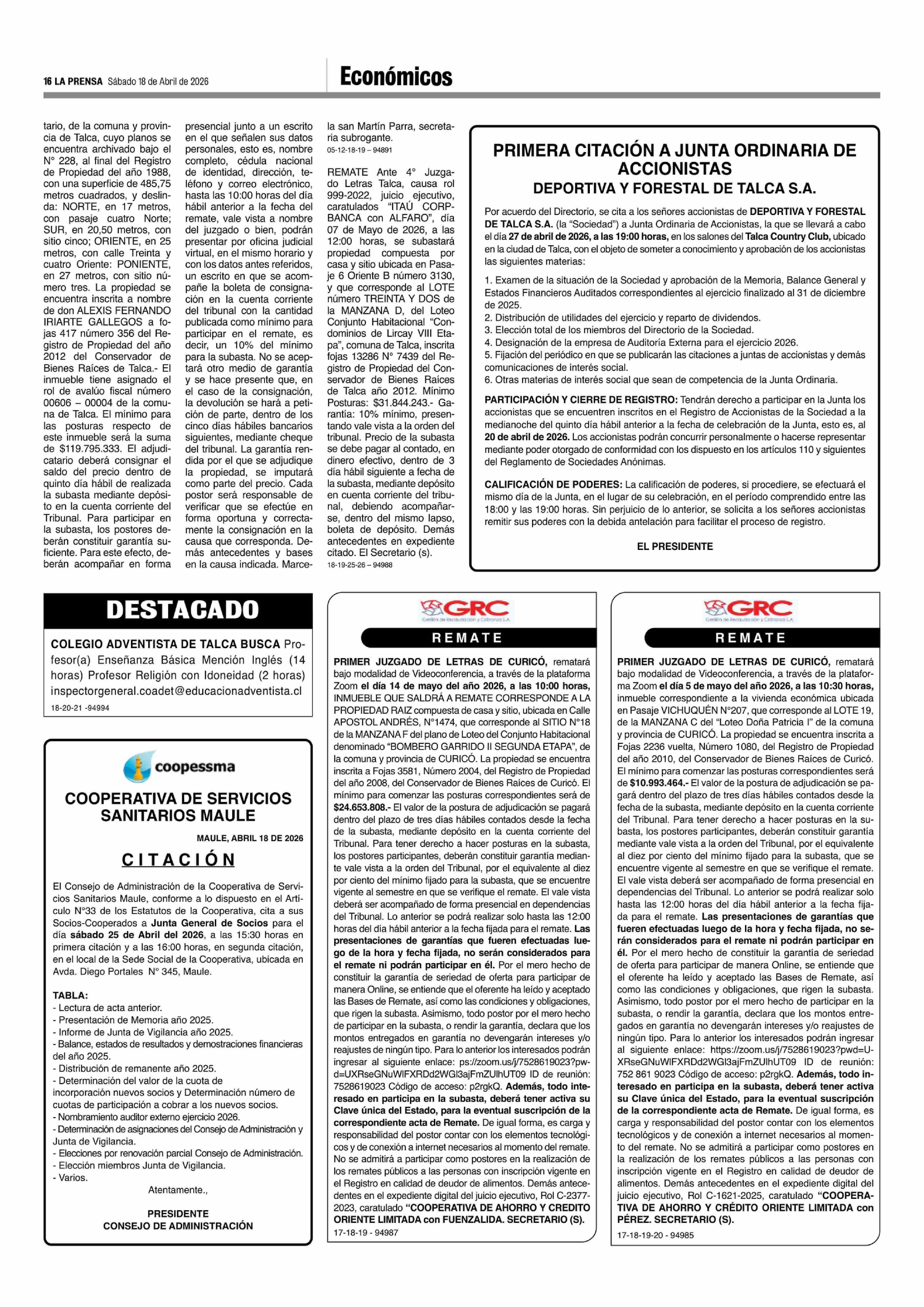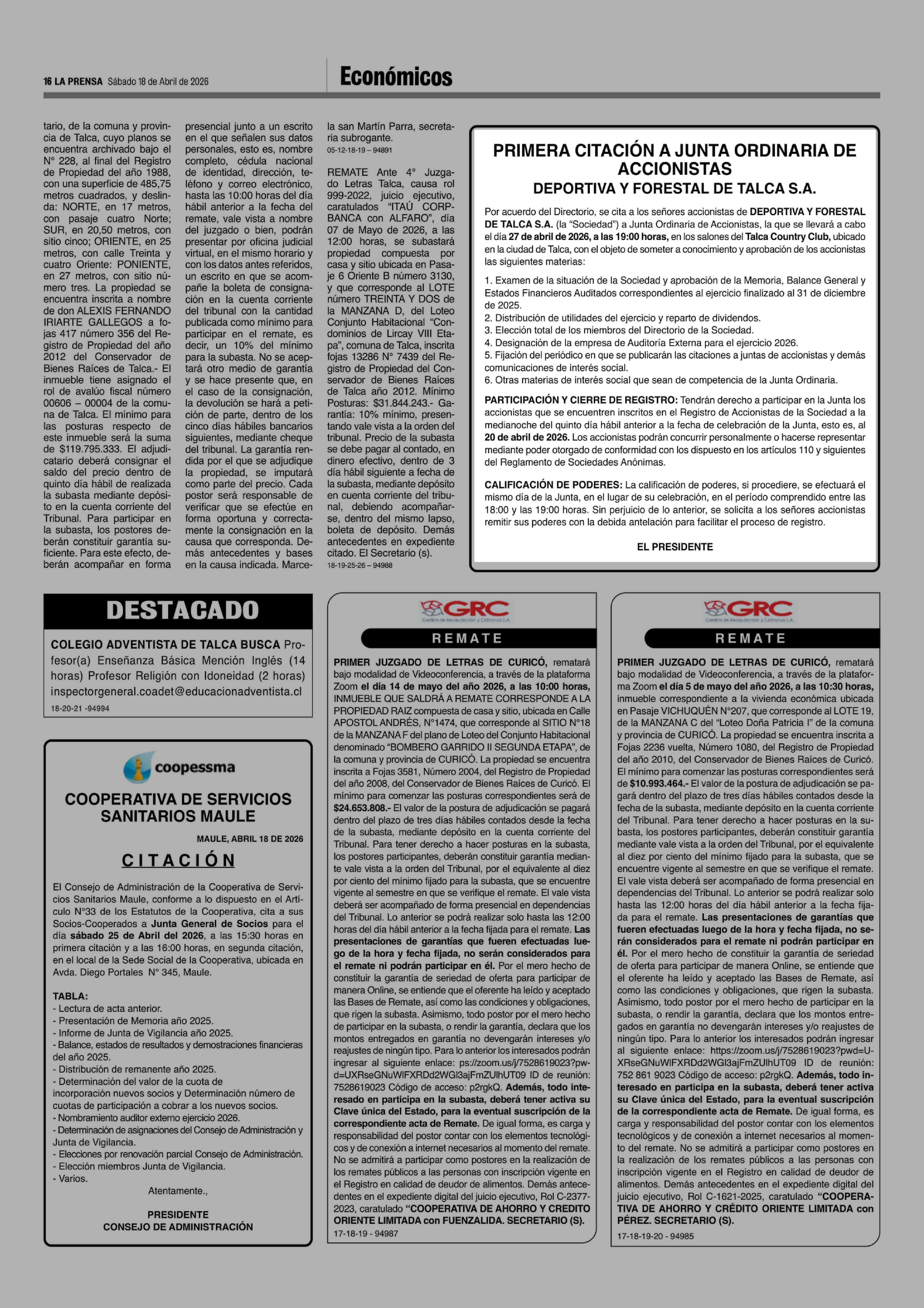 PRIMERA CITACIÓN A JUNTA ORDINARIA DE ACCIONISTAS 18-04-2026 La Prensa de Curicó |