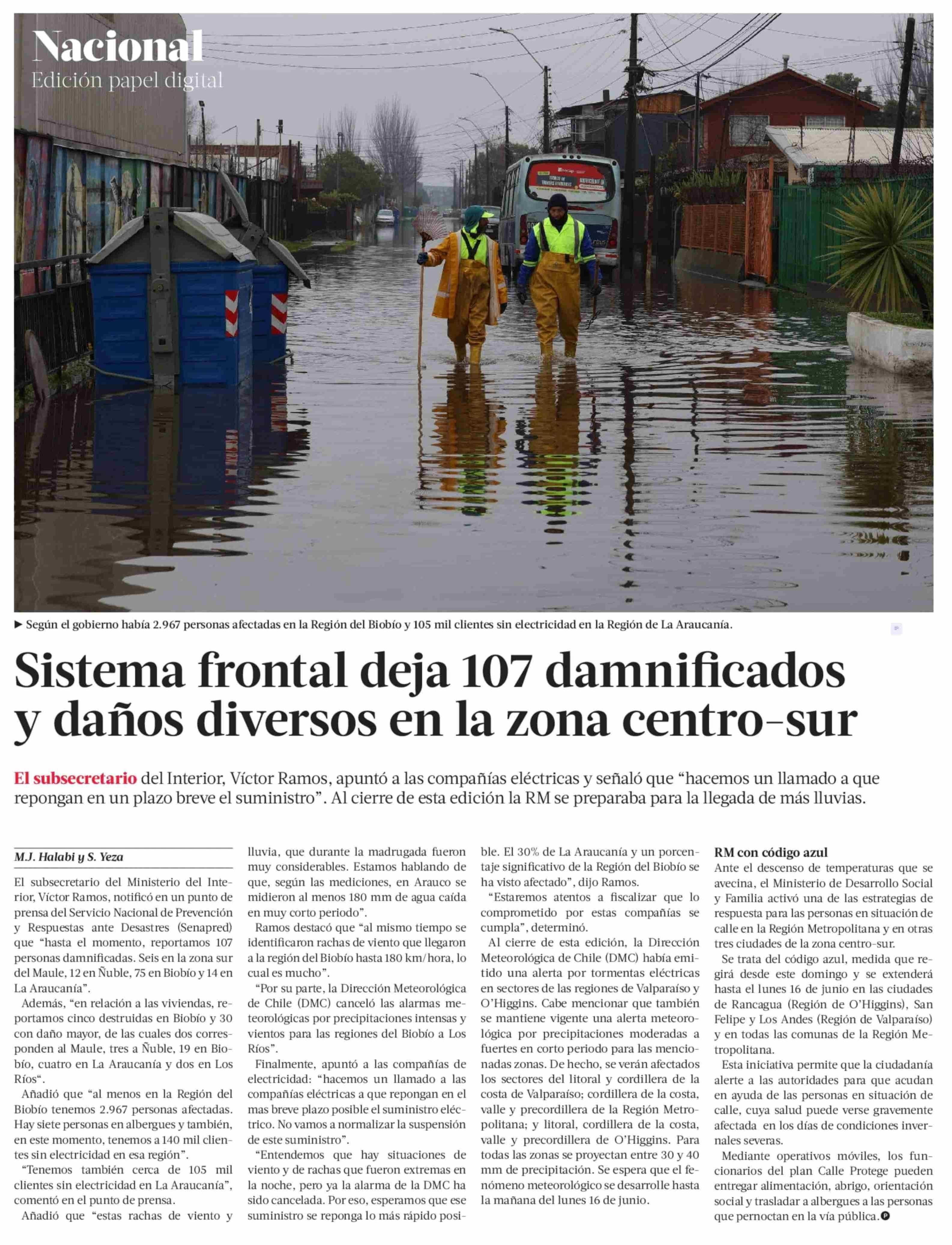 Sistema frontal deja 107 damnificados y daños diversos en la zona centro-sur 16-06-2025 La Tercera |
