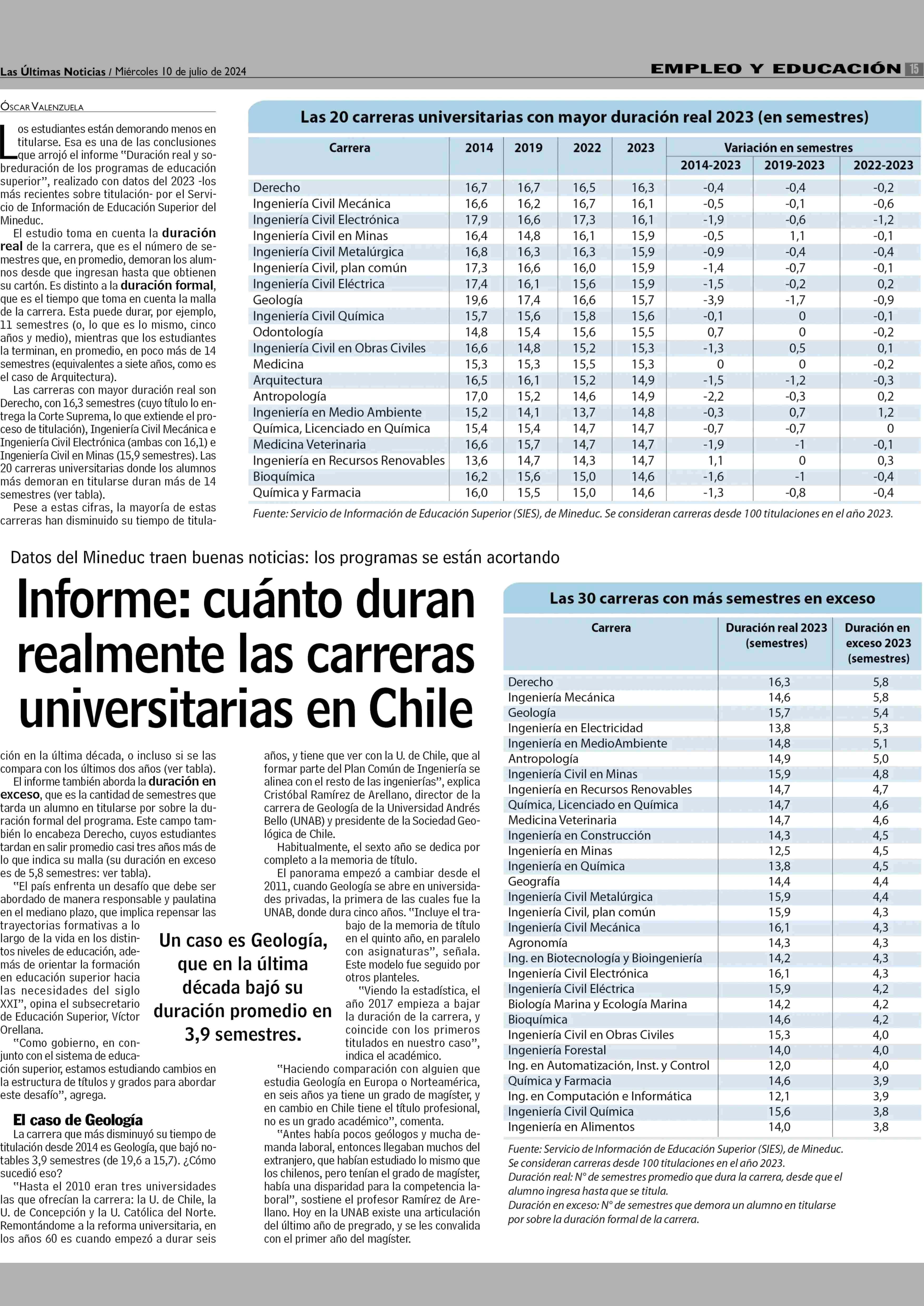 Informe: cuánto duran realmente las carreras universitarias en Chile 10-07-2024 Las Últimas Noticias |