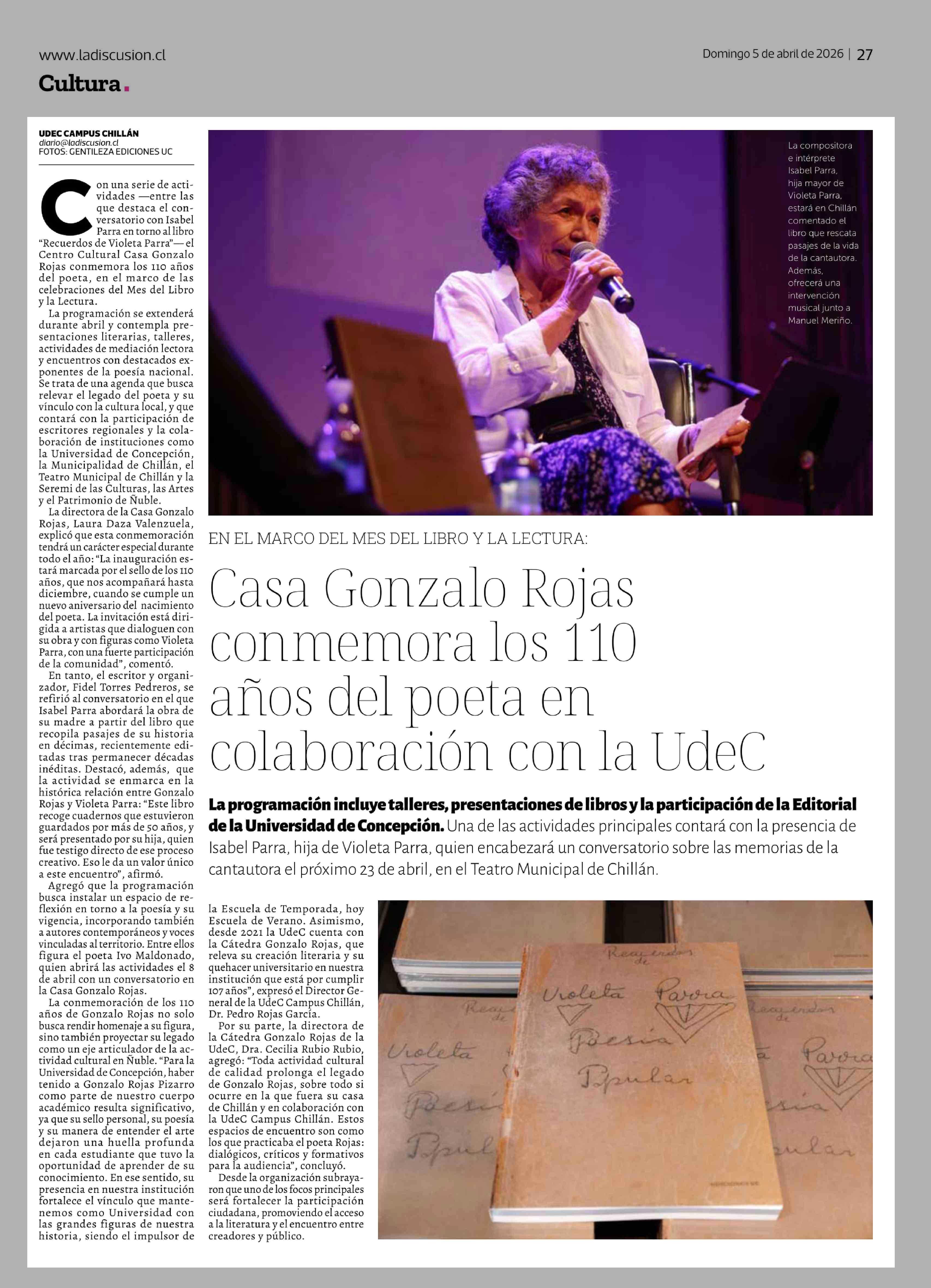Casa Gonzalo Rojas conmemora los 110 años del poeta en colaboración con la UdeC 05-04-2026 La Discusión |