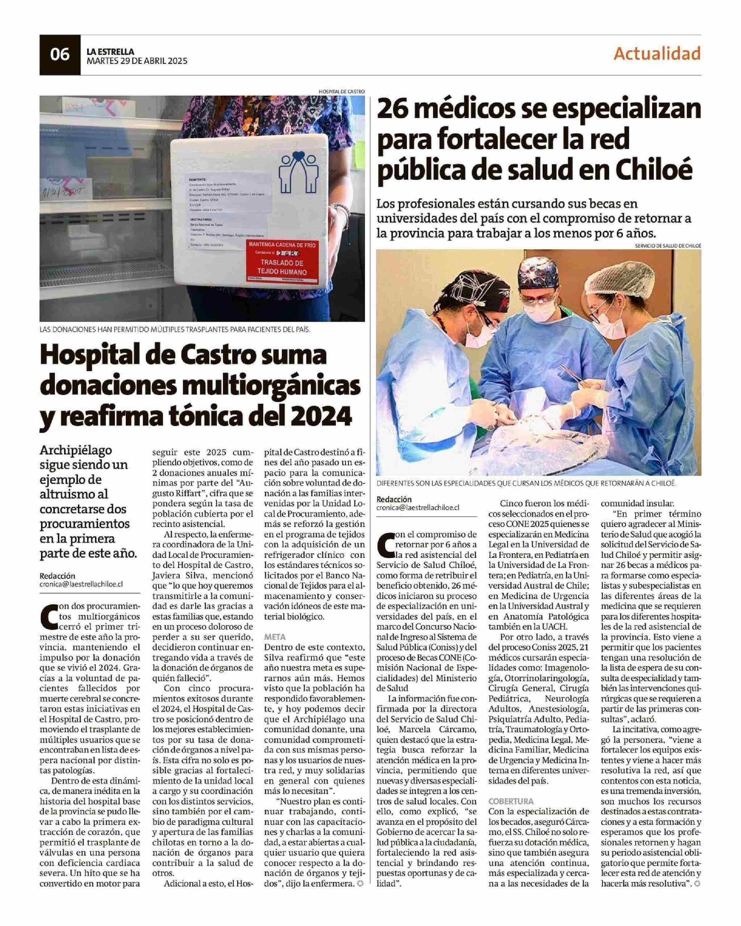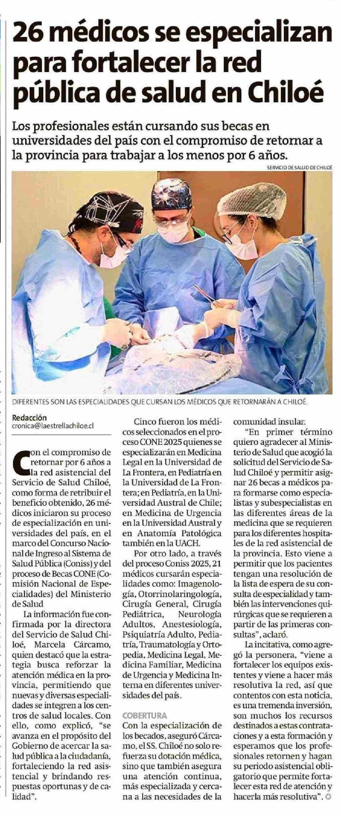 26 Médicos se especializan para fortalecer la red pública de salud en Chiloé 29-04-2025 La Estrella de Chiloé |