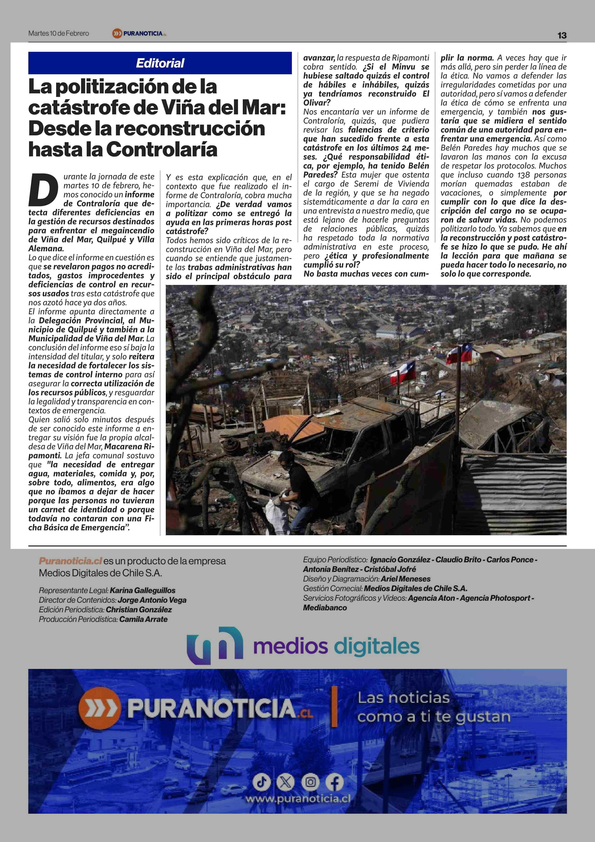EDITORIAL: La politización de la catástrofe de Viña del Mar Desde la reconstrucción hasta la Controlaría 10-02-2026 Puranoticia.cl |
