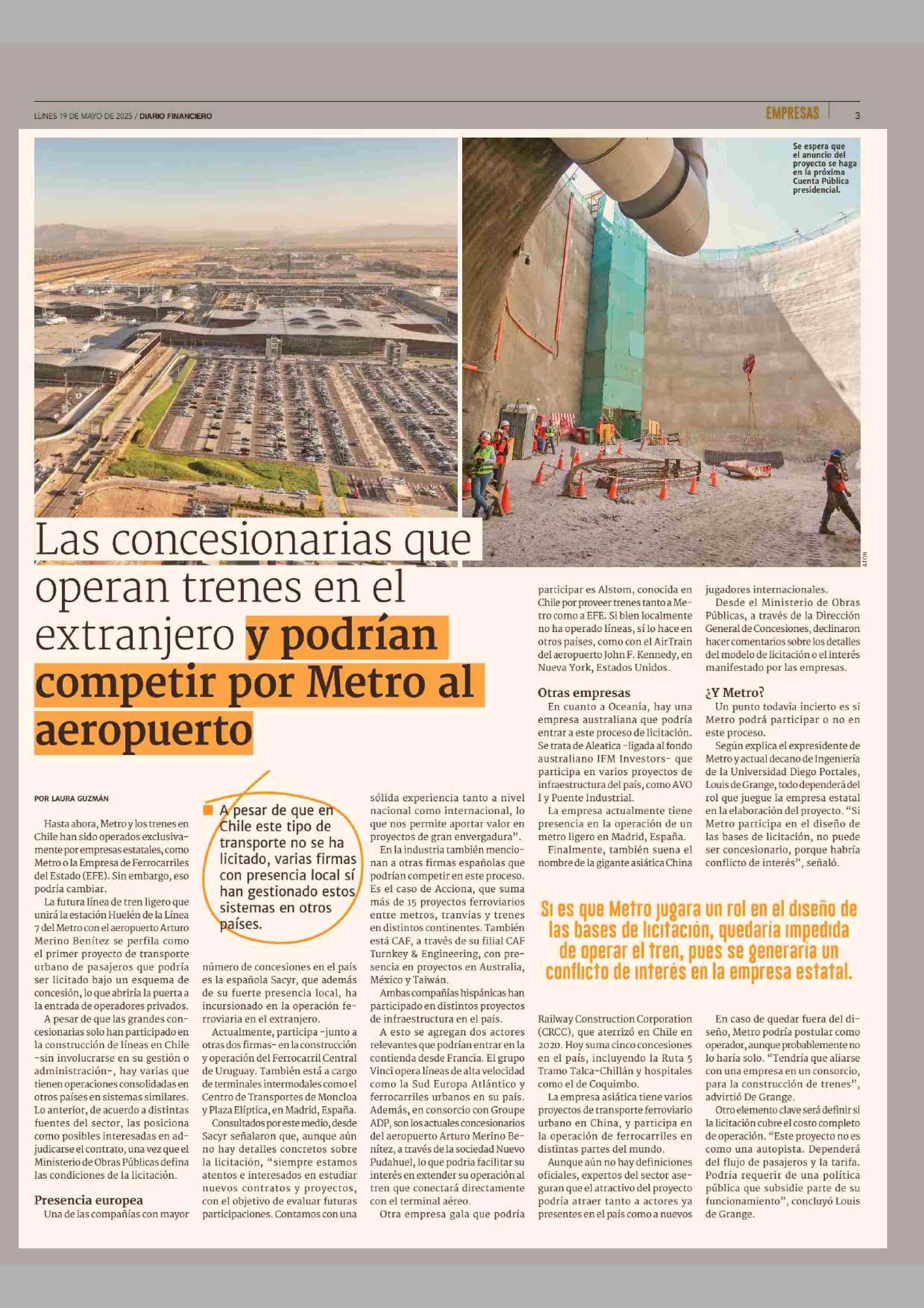 Las concesionarias que operan trenes en el extranjero y podrían competir por Metro al aeropuerto 19-05-2025 Diario Financiero |