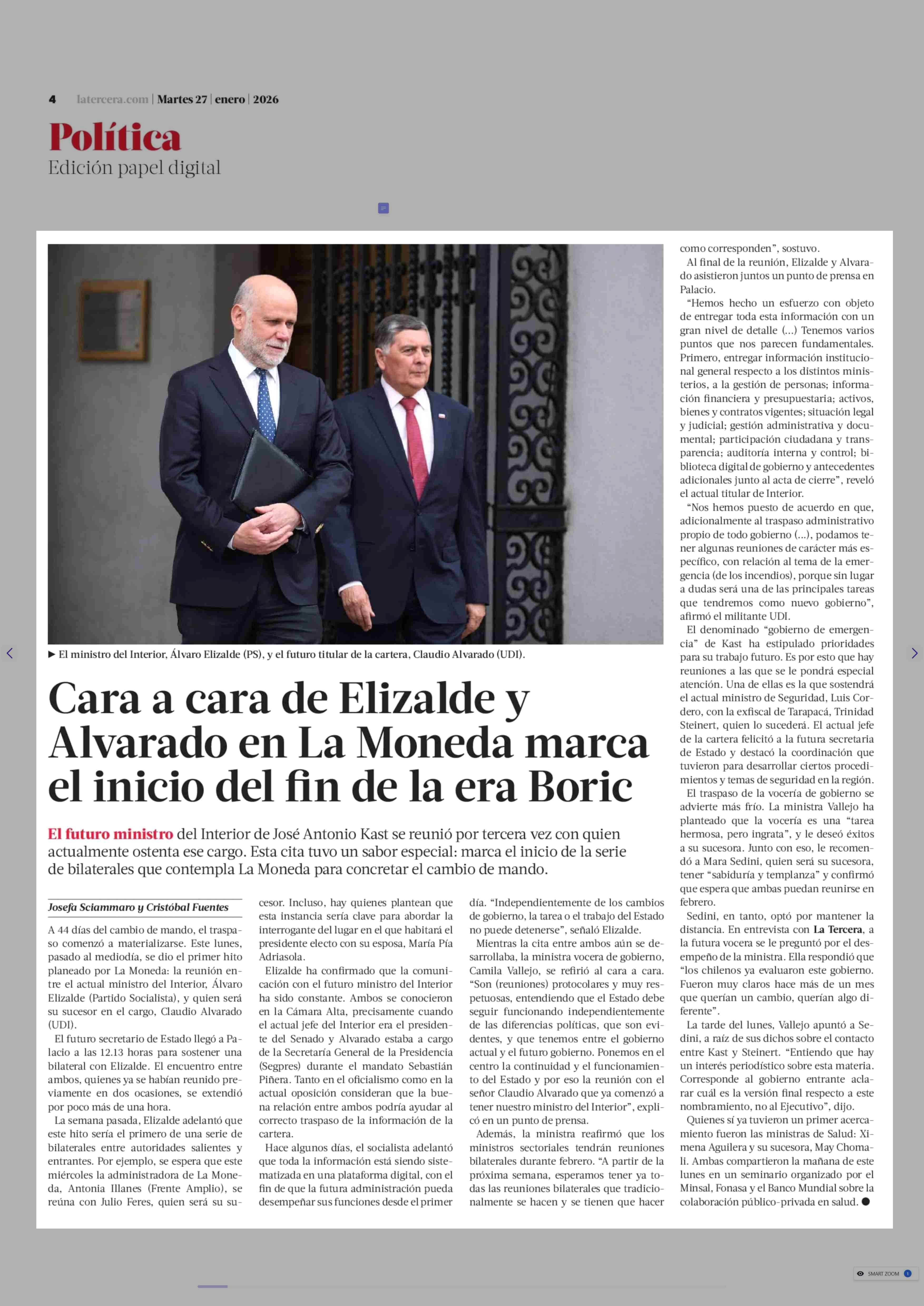 Cara a cara de Elizalde y Alvarado en La Moneda marca el inicio del fin de la era Boric 27-01-2026 La Tercera |