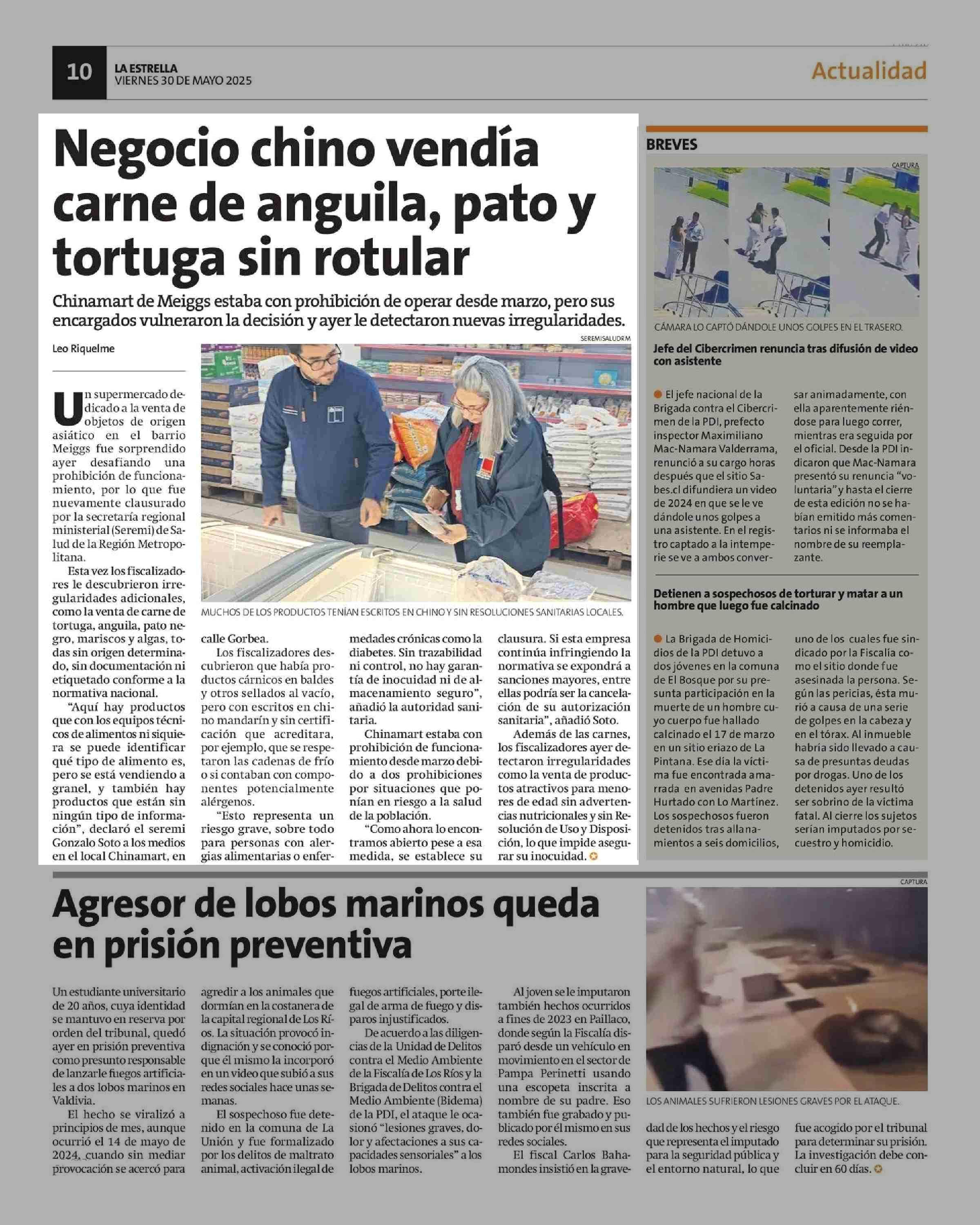 Negocio chino vendía carne de anguila, pato y tortuga sin rotular 30-05-2025 La Estrella de Concepción |