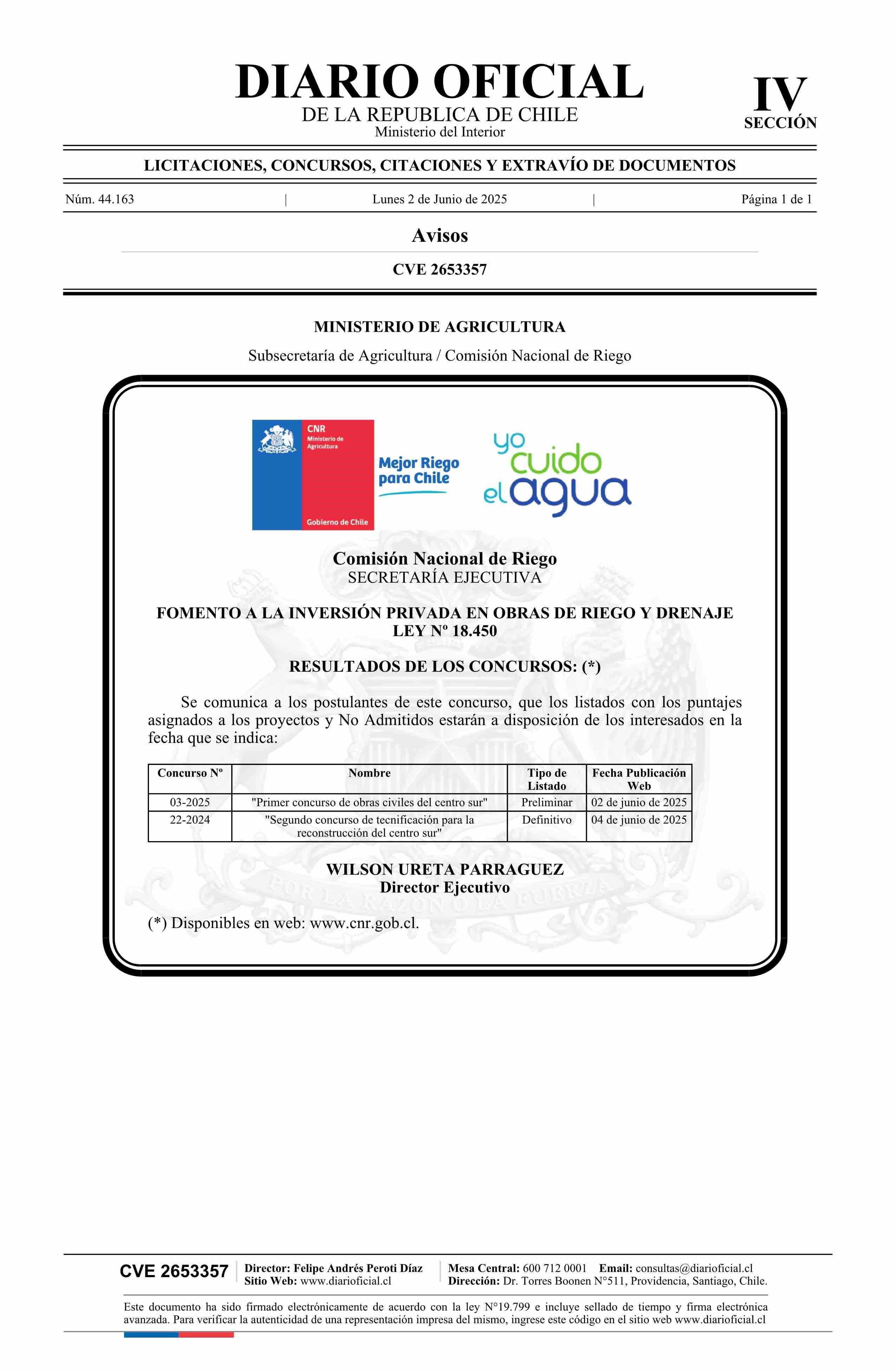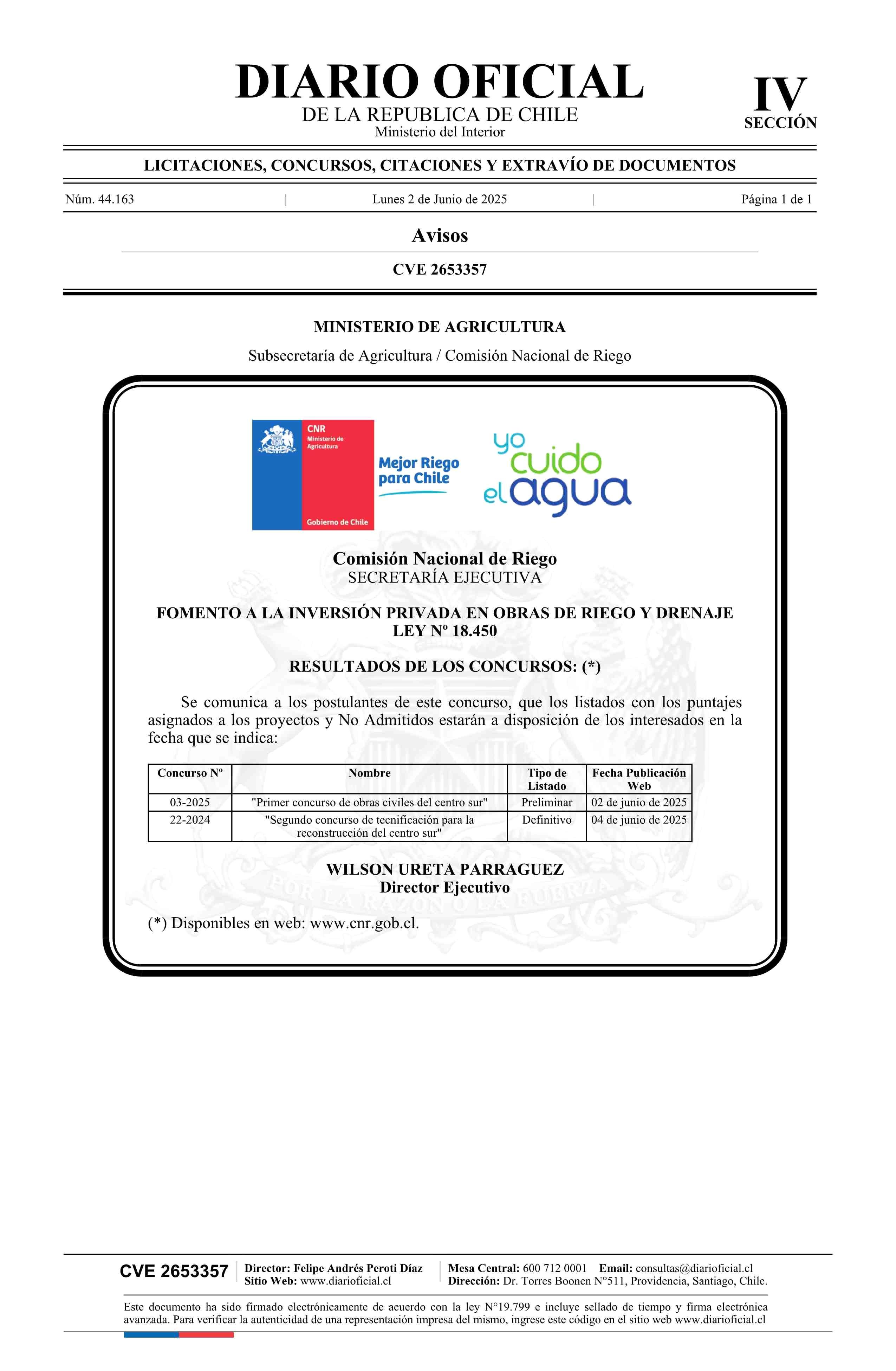 AVISO LICITACIONES: Fomento a la inversión privada en obras de riego y drenaje ley Nº 18.450 02-06-2025 Diario Oficial Edición Electrónica |