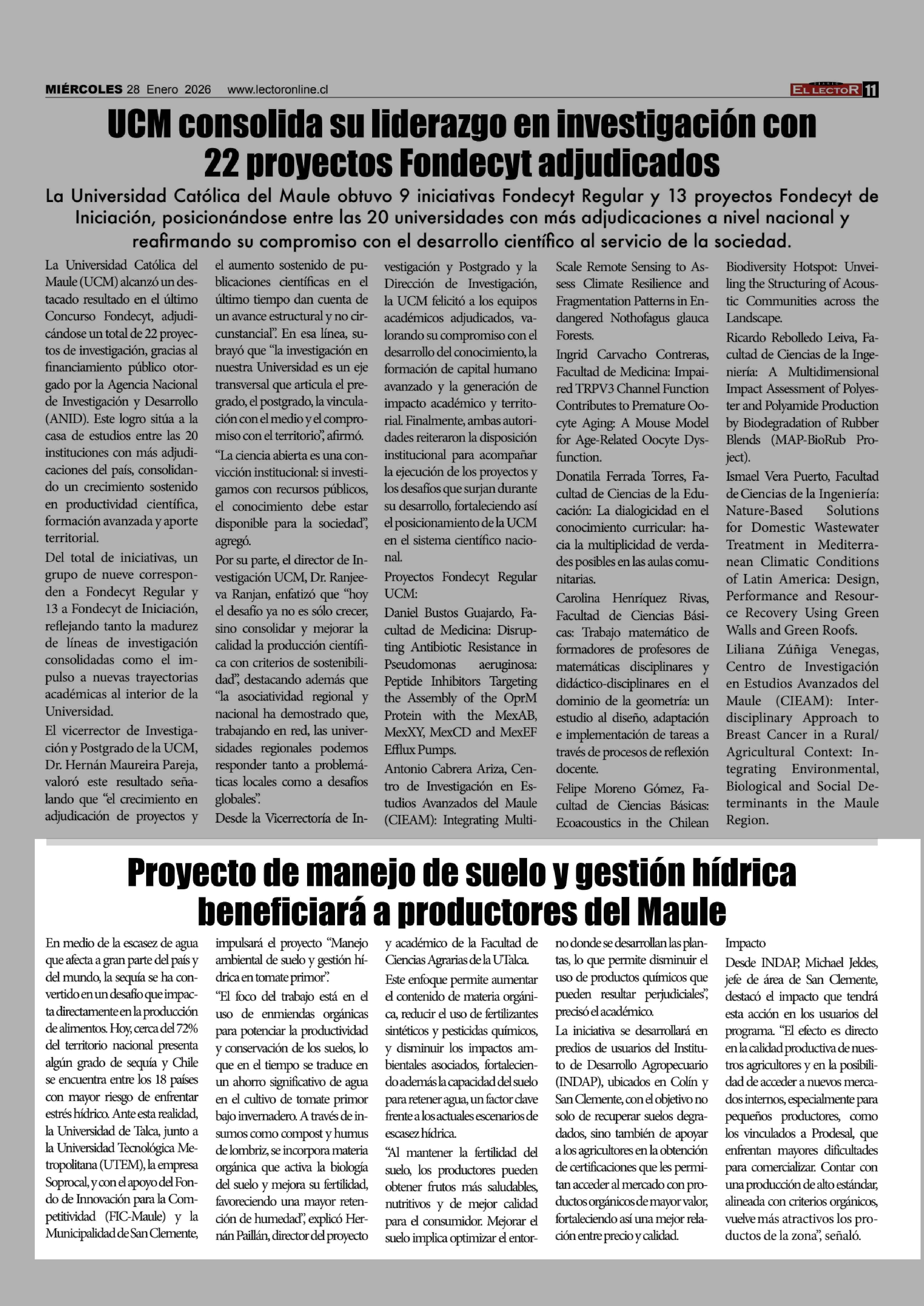 Proyecto de manejo de suelo y gestión hídrica beneficiará a productores del Maule 28-01-2026 El Lector |