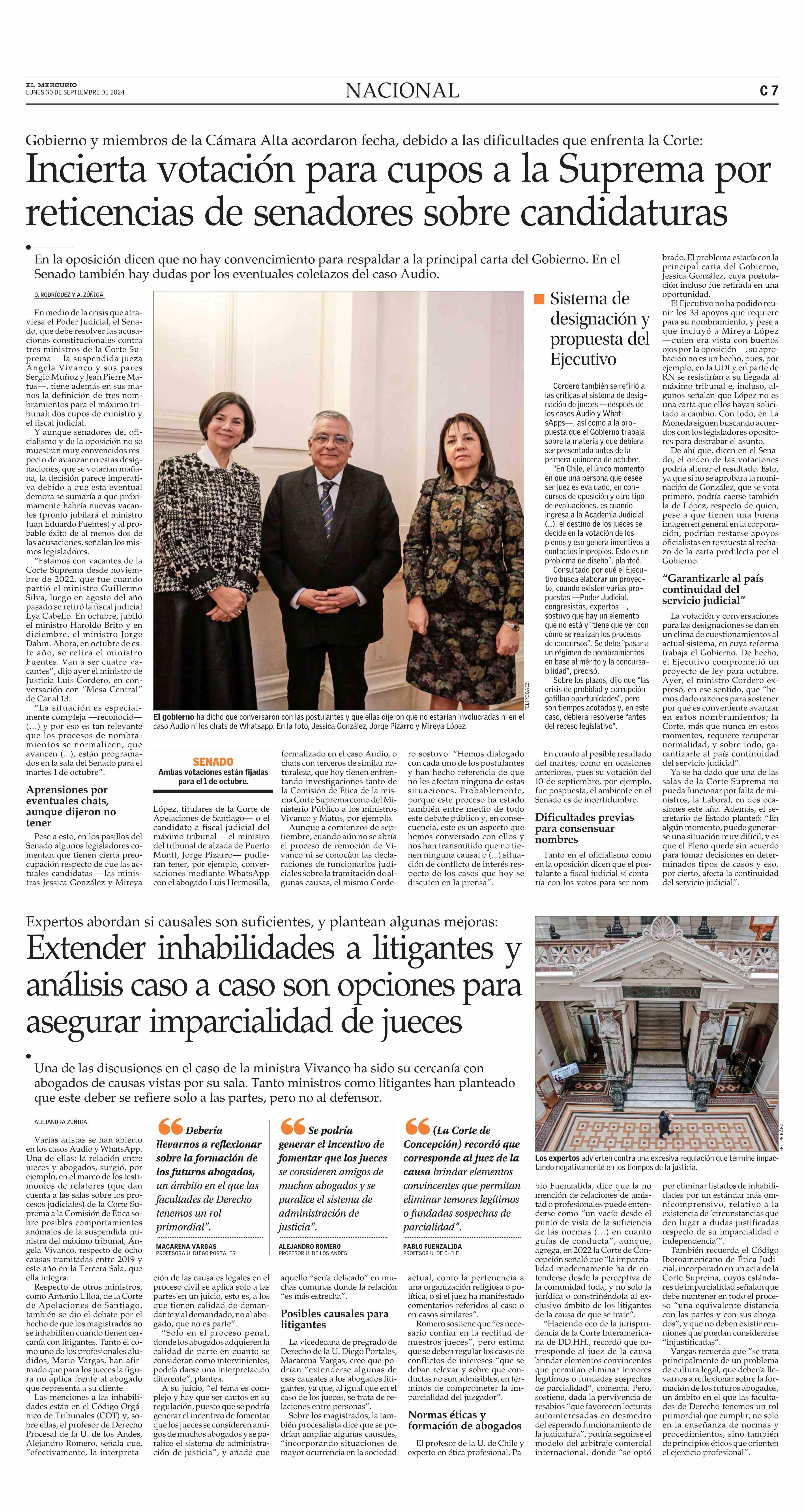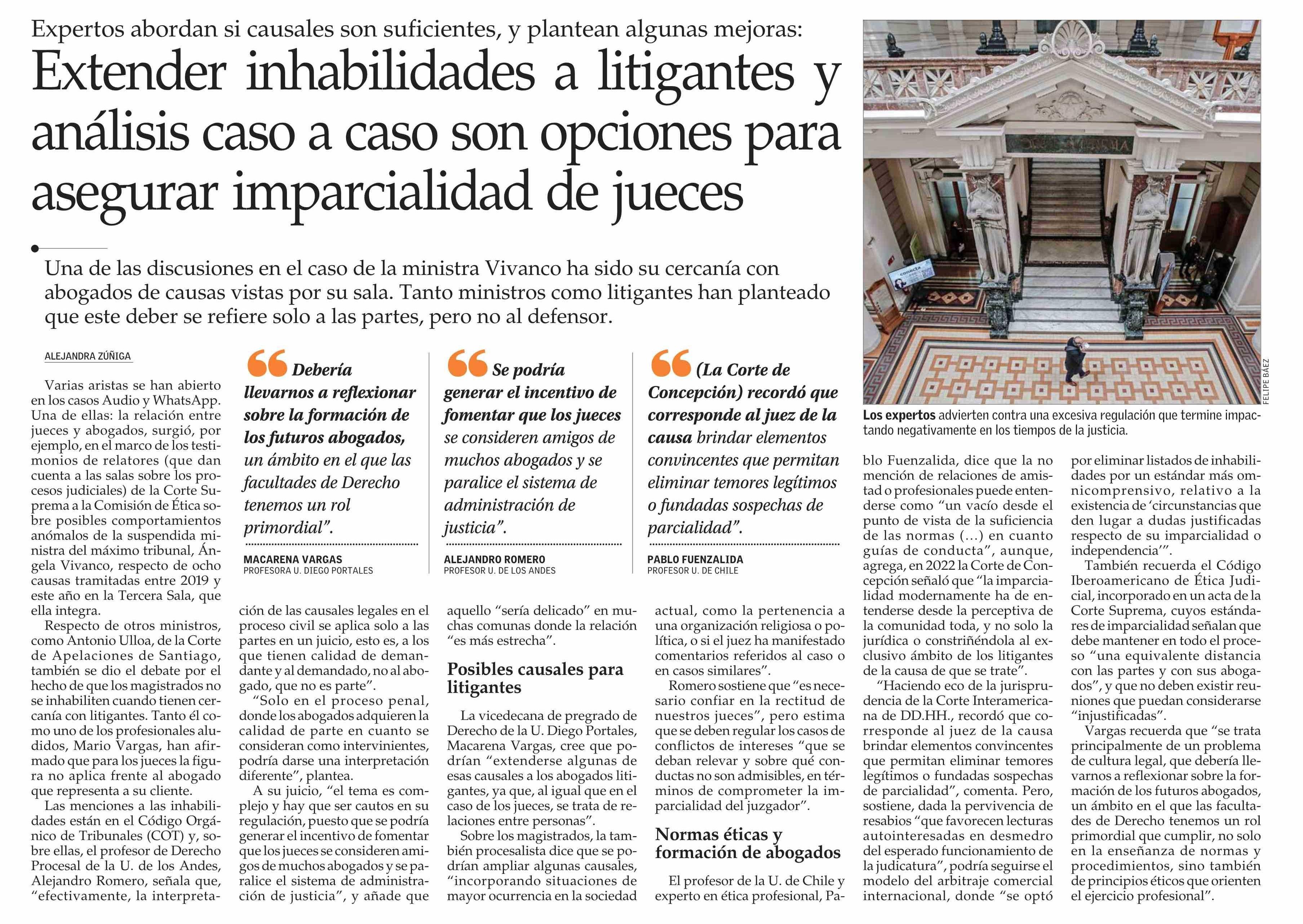 Extender inhabilidades a litigantes y análisis caso a caso son opciones para asegurar imparcialidad de jueces 30-09-2024 El Mercurio |