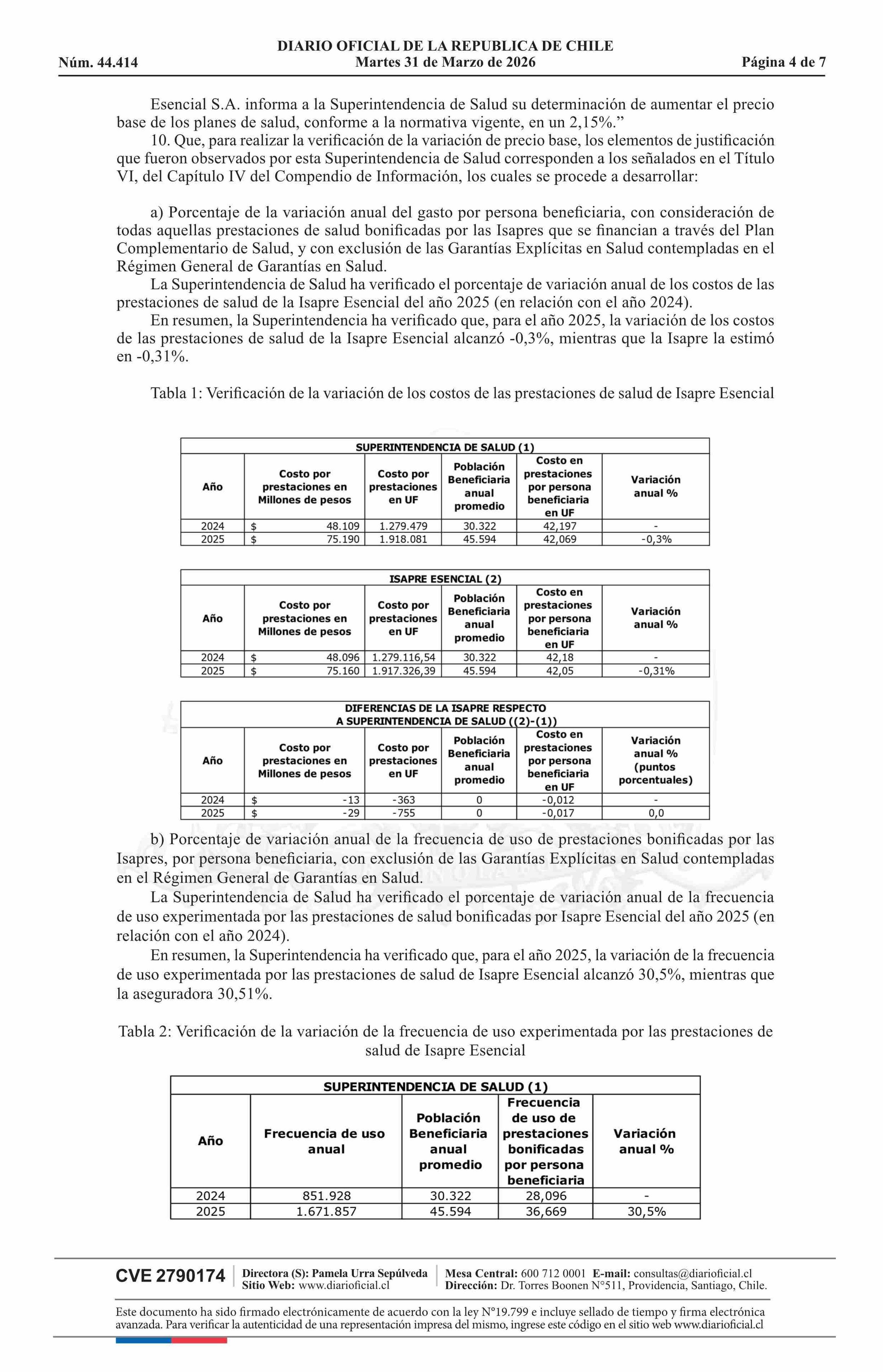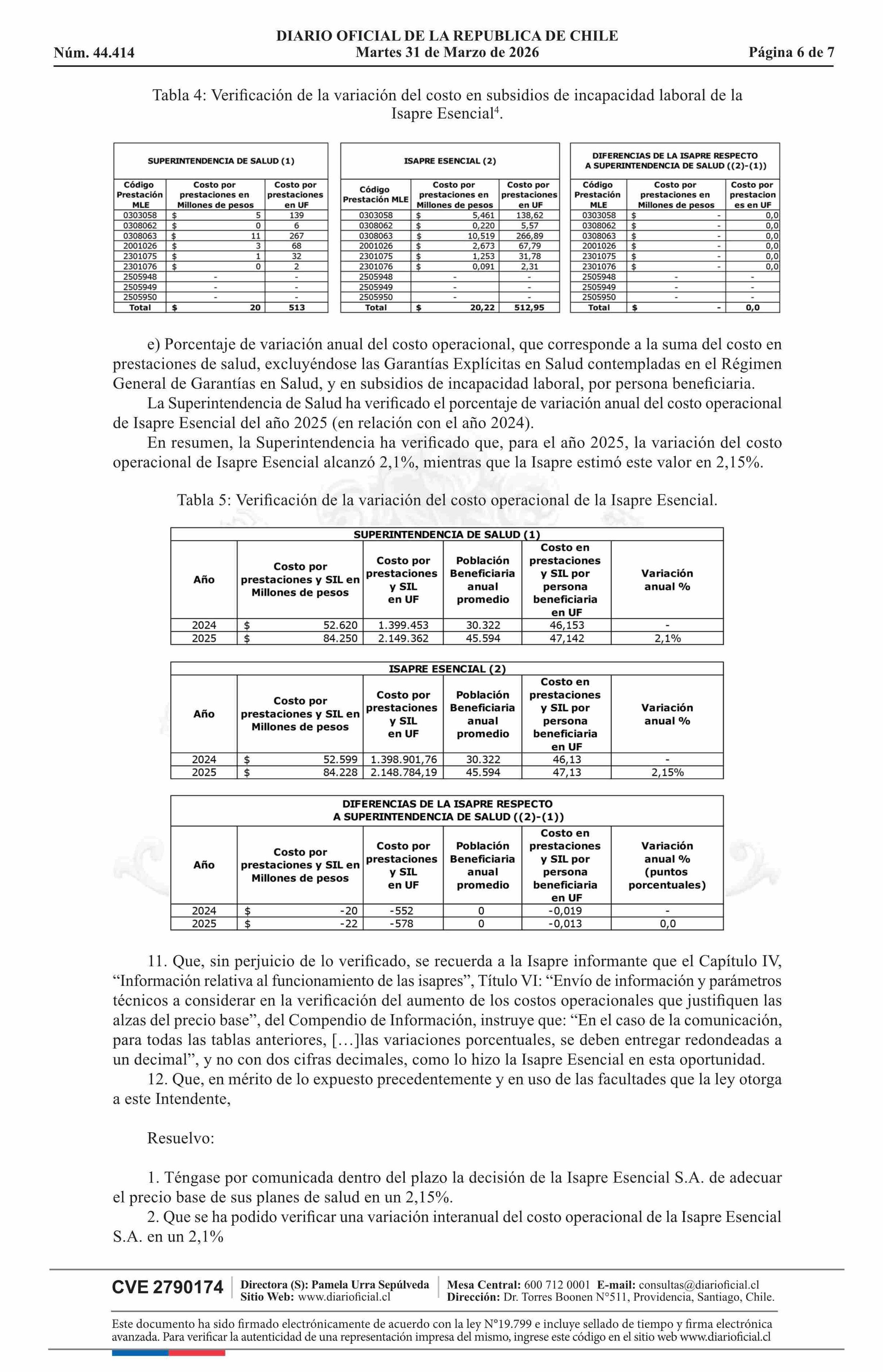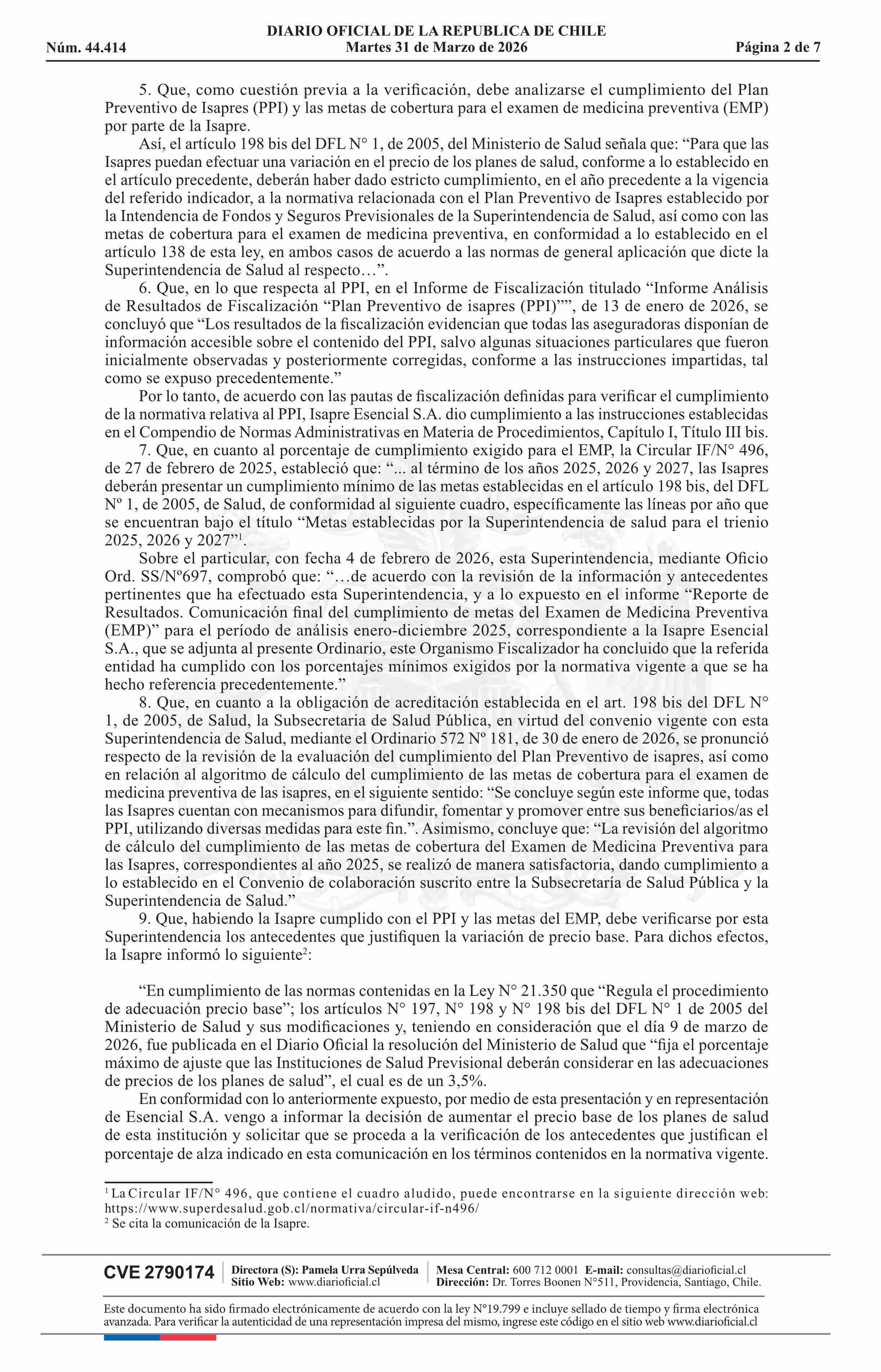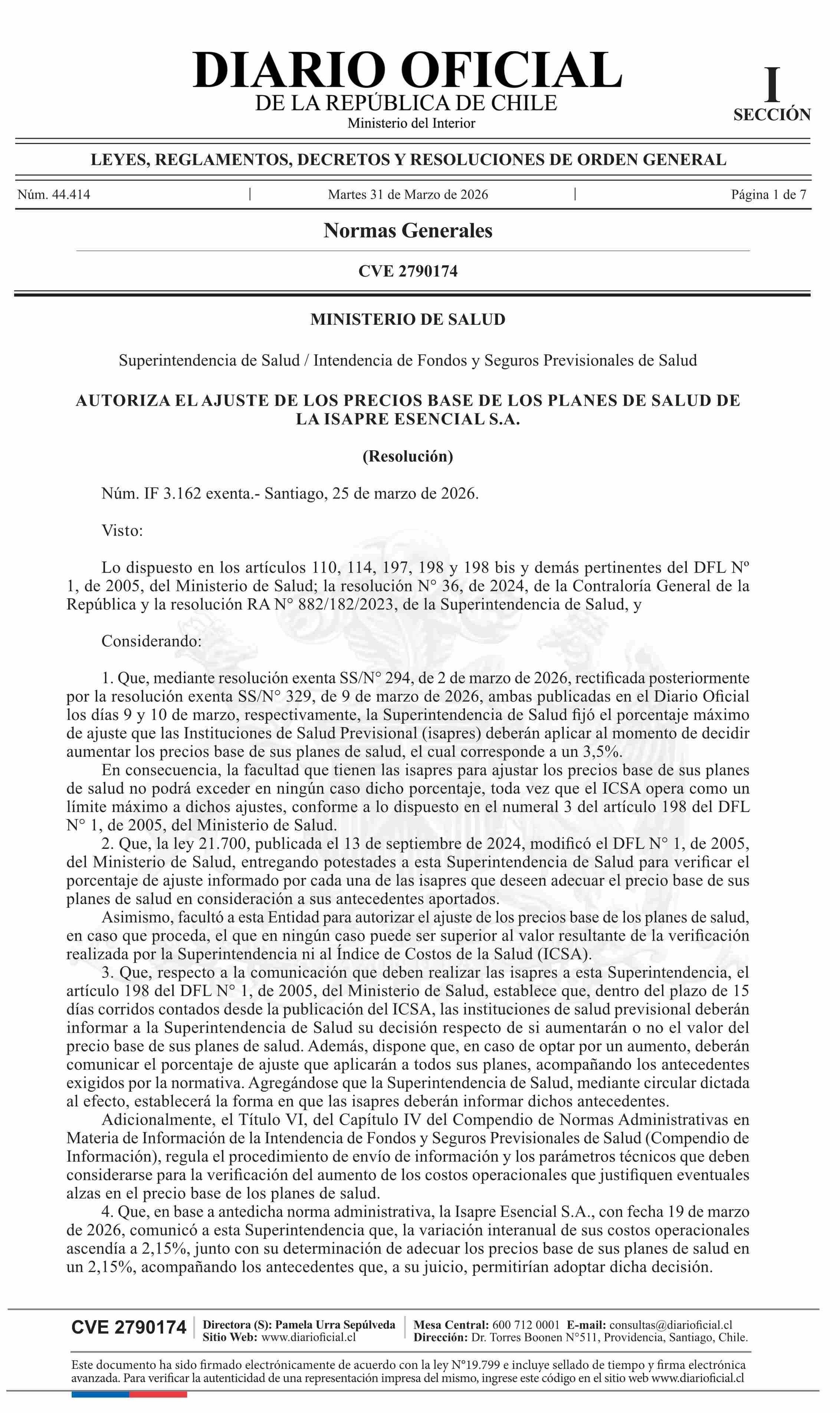 | Título: | MINISTERIO DE SALUD Superintendencia de Salud / Intendencia de Fondos y Seguros Previsionales de Salud AUTORIZA EL AJUSTE DE LOS PRECIOS BASE DE LOS PLANES DE SALUD DE LA ISAPRE ESENCIAL S.A. |