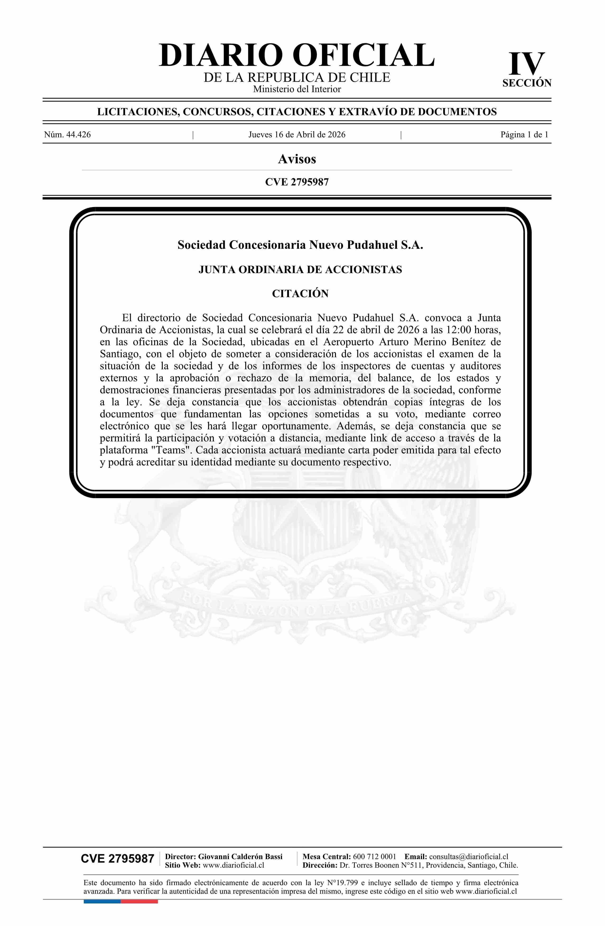 Título: AVISO LICITACIONES: Sociedad Concesionaria Nuevo Pudahuel S.A.