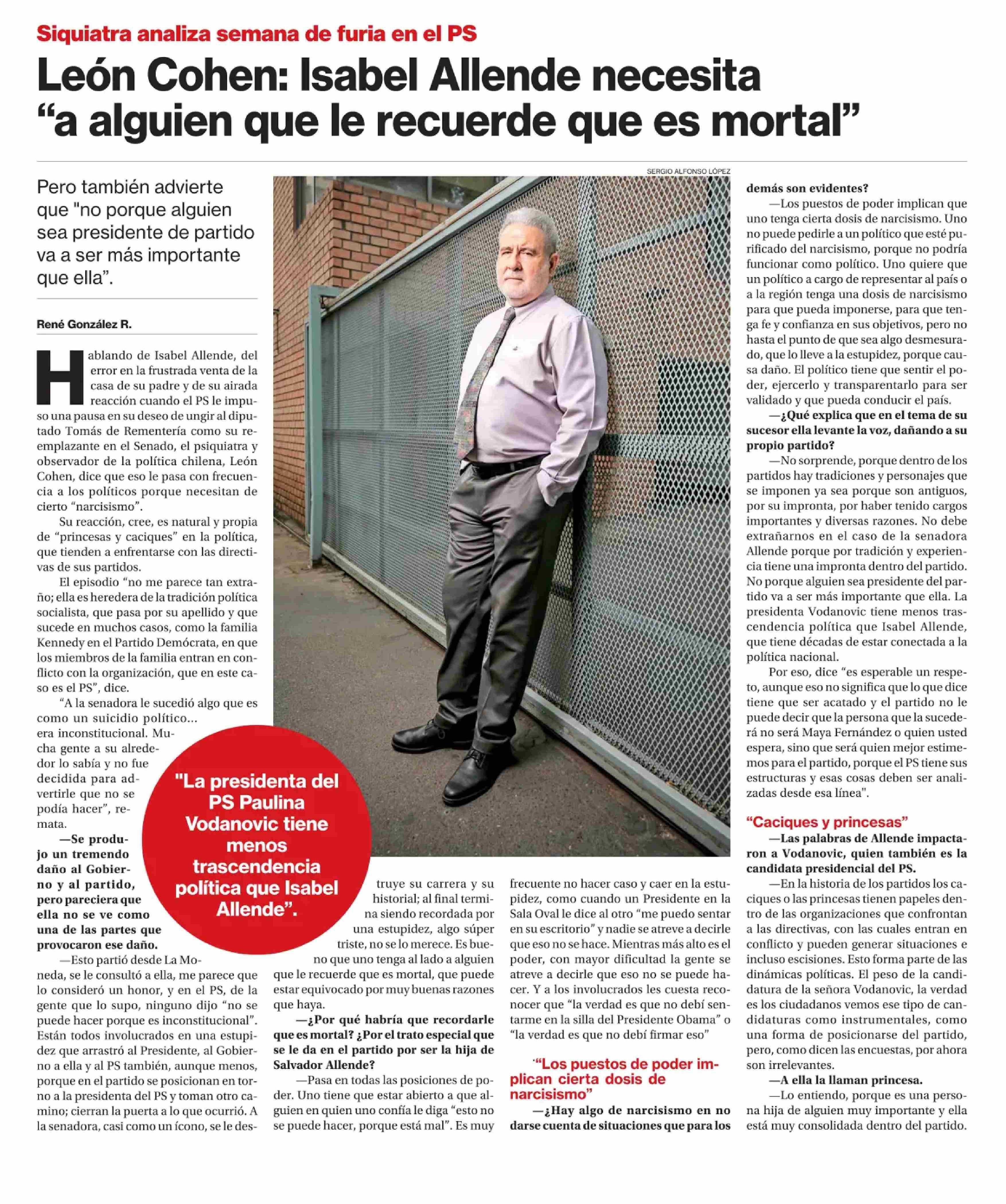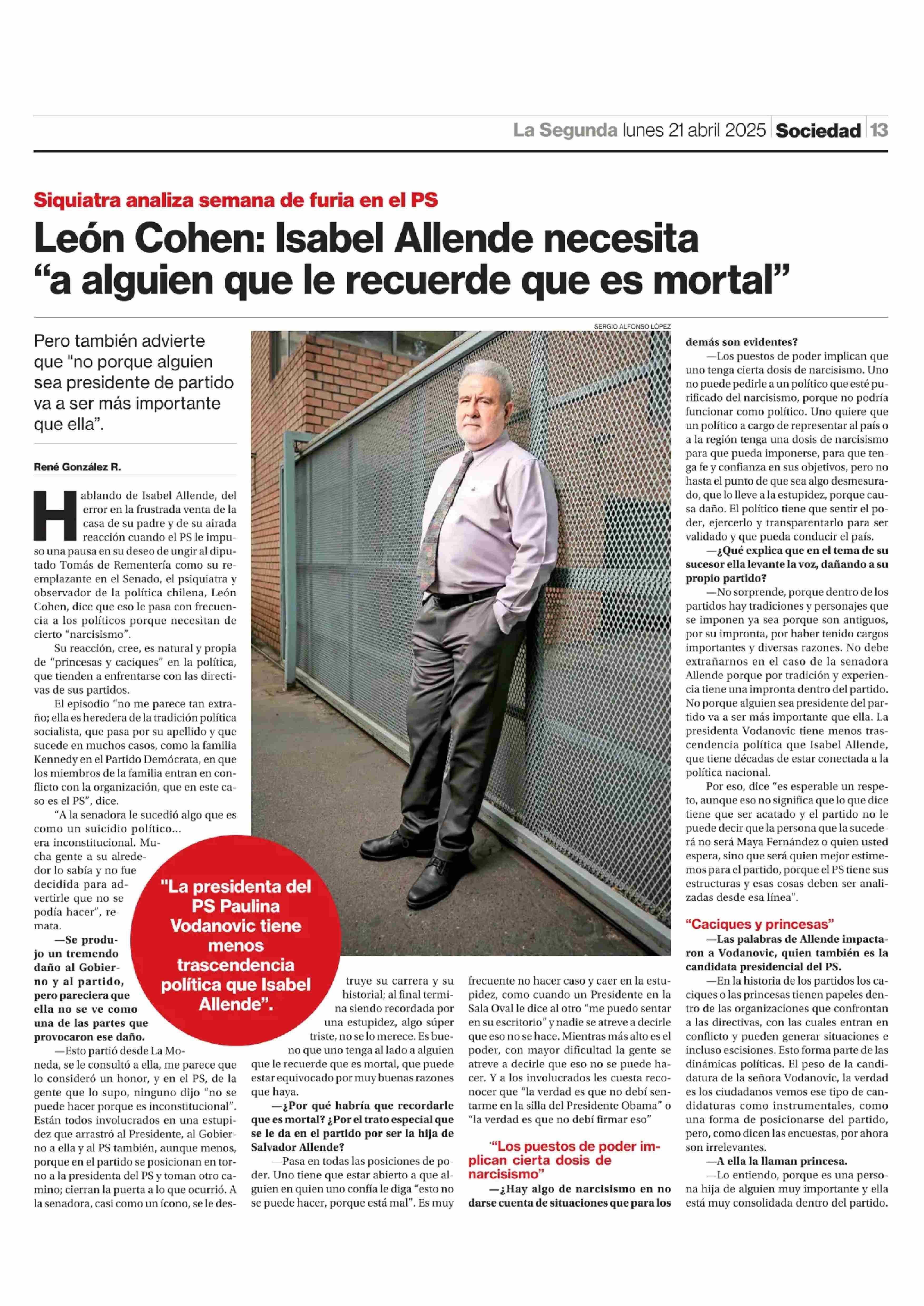León Cohen: Isabel Allende necesita "a alguien que le recuerde que es mortal" 21-04-2025 La Segunda |