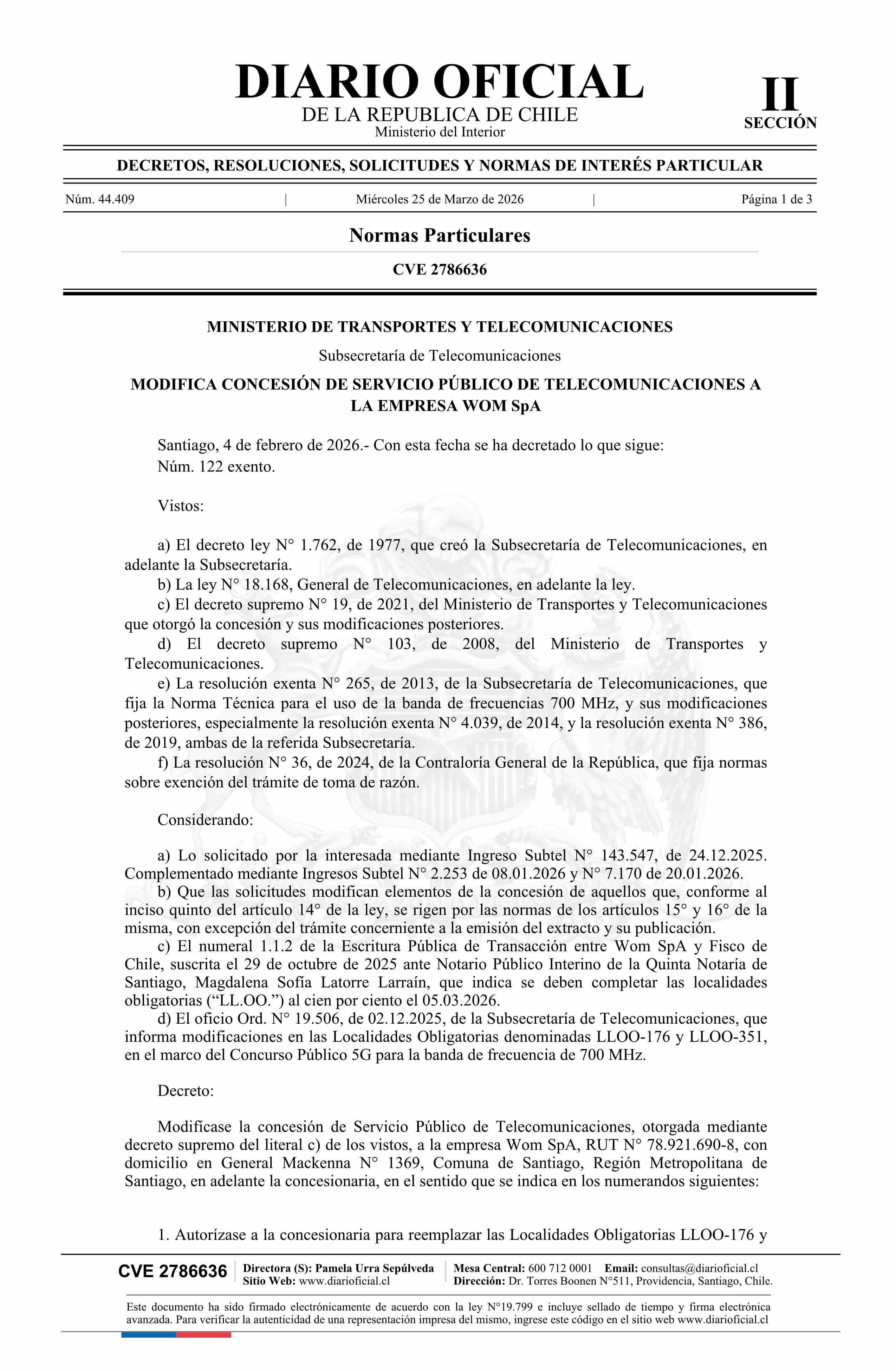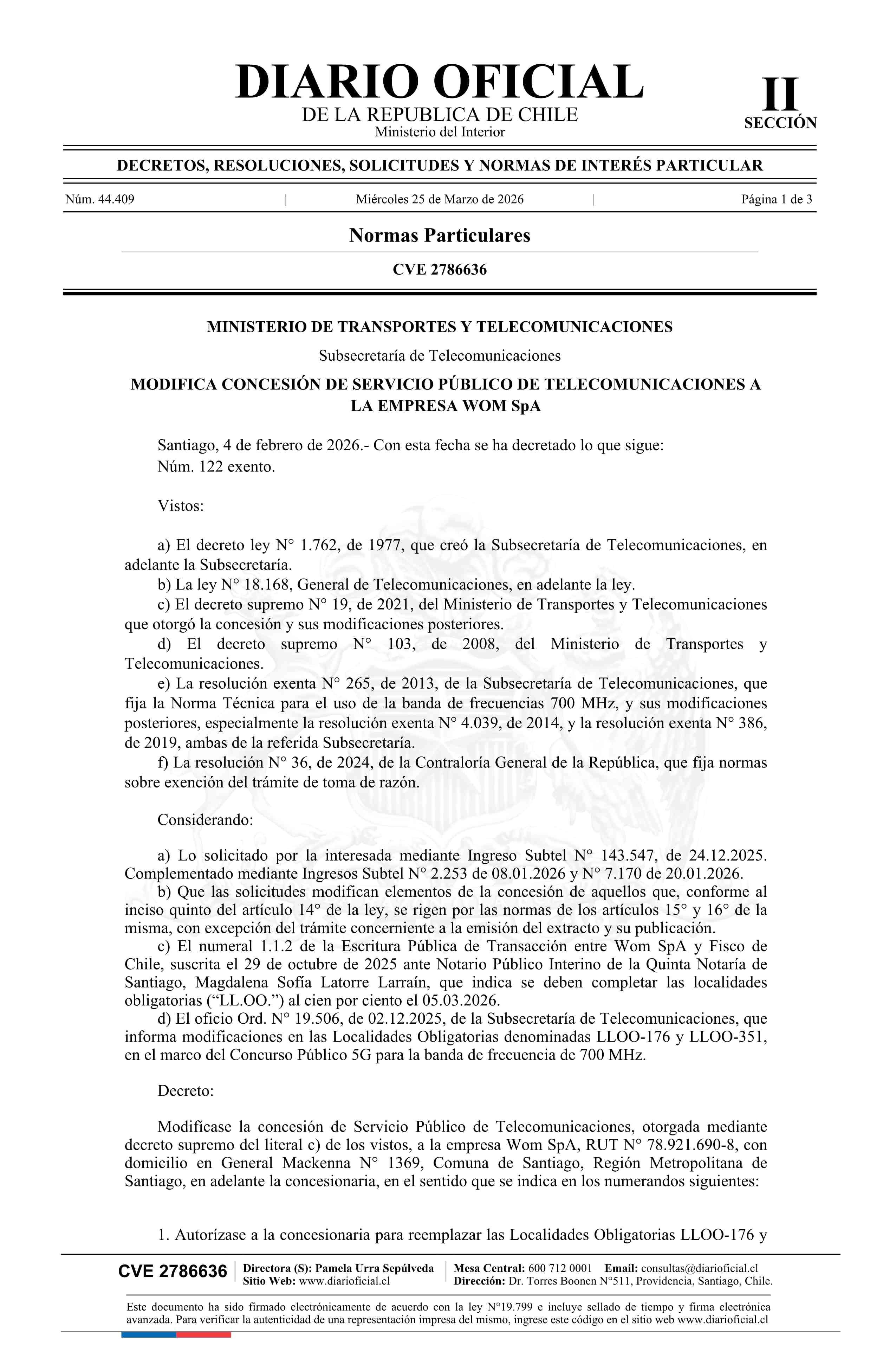 Decreto exento número 122, de 2026.- Modifica concesión de servicio público de telecomunicaciones a la empresa Wom SpA 25-03-2026 Diario Oficial Edición Electrónica |