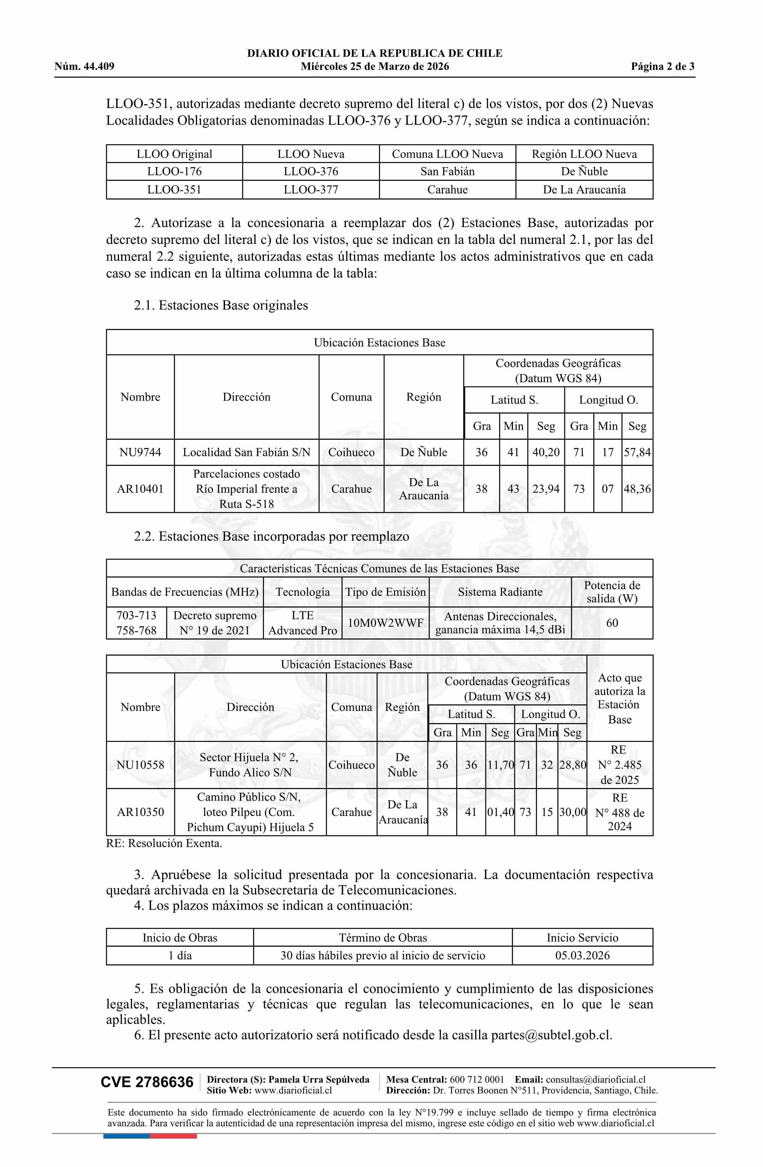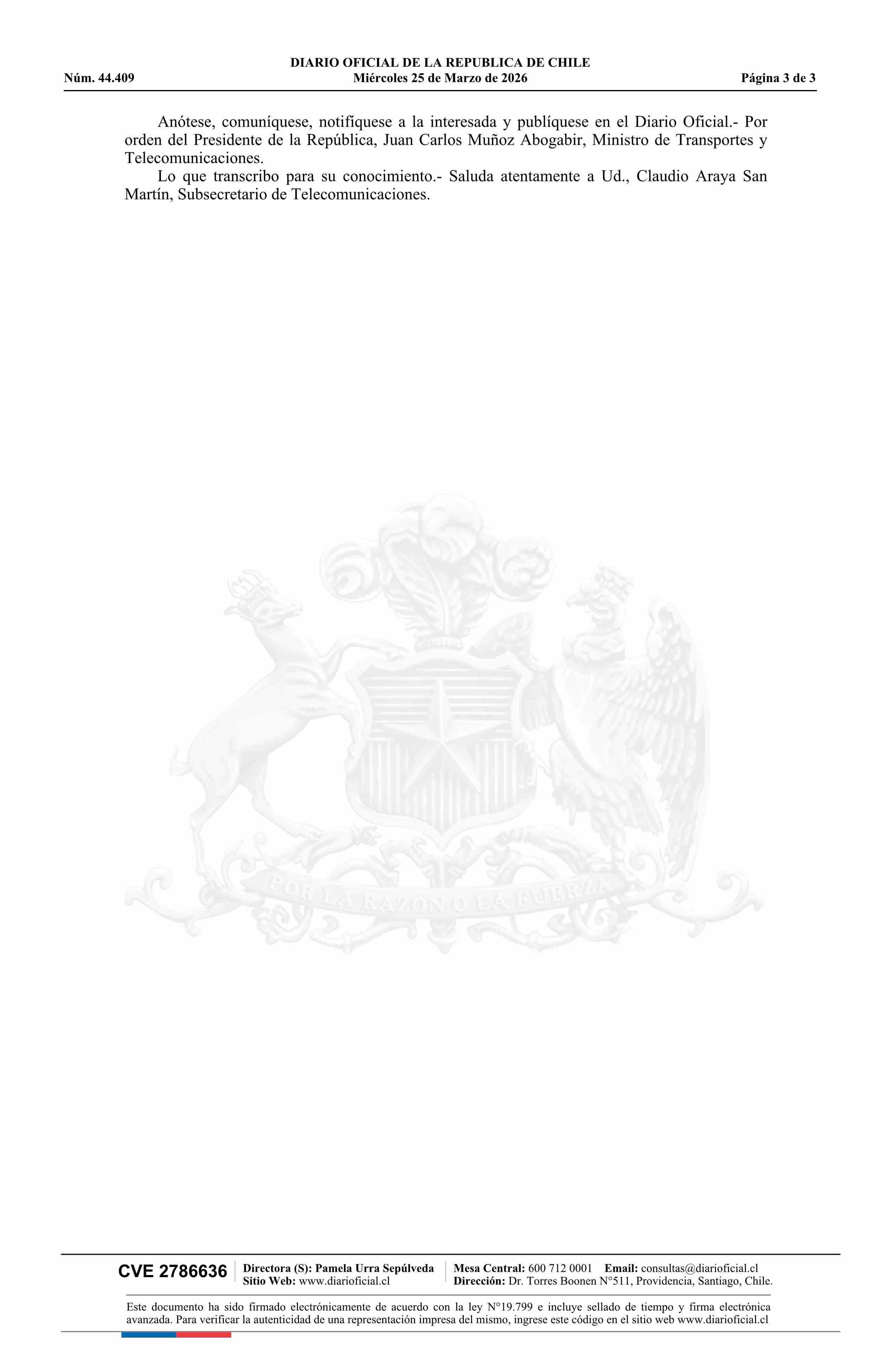 | Título: | Decreto exento número 122, de 2026.- Modifica concesión de servicio público de telecomunicaciones a la empresa Wom SpA |