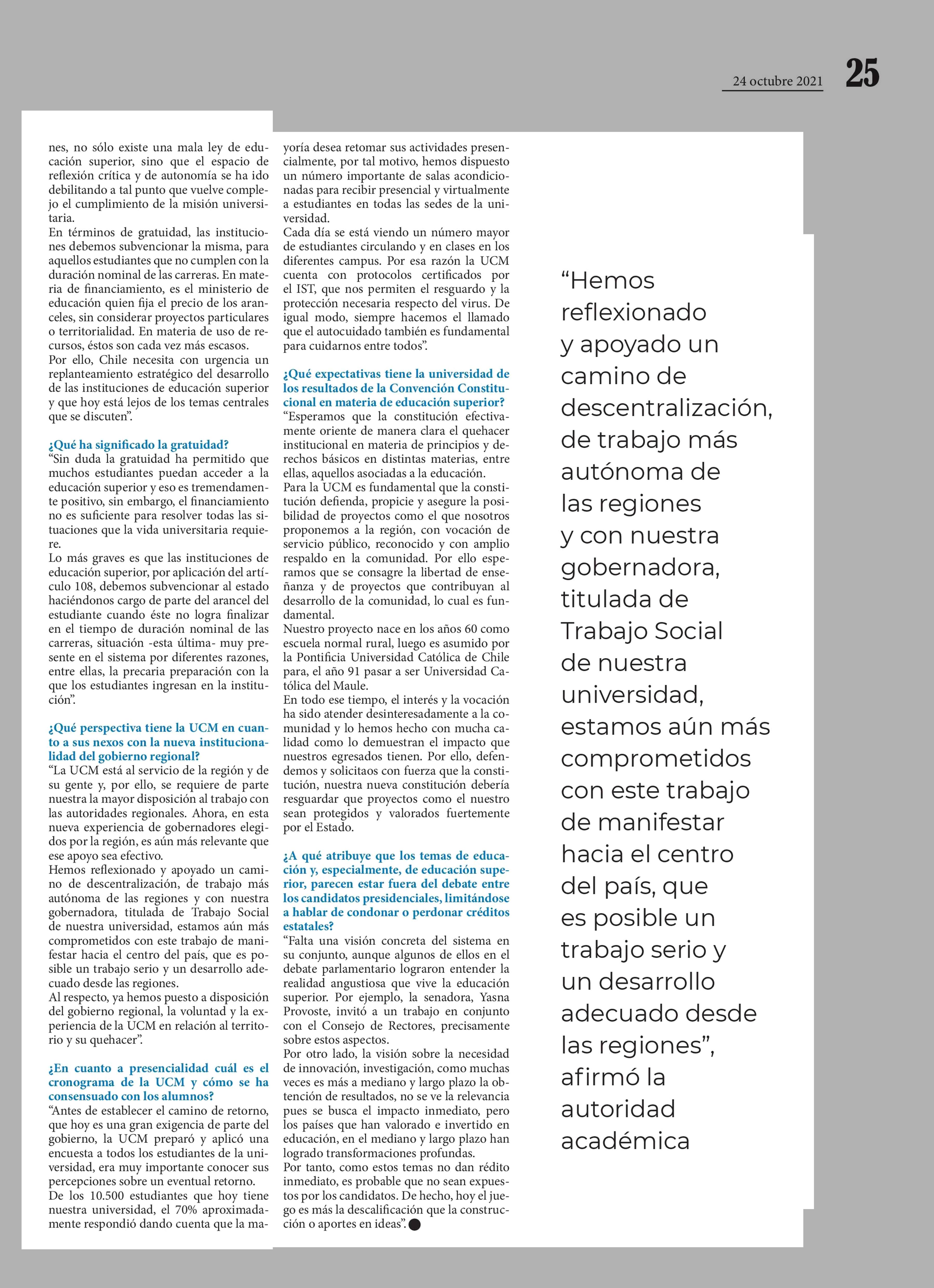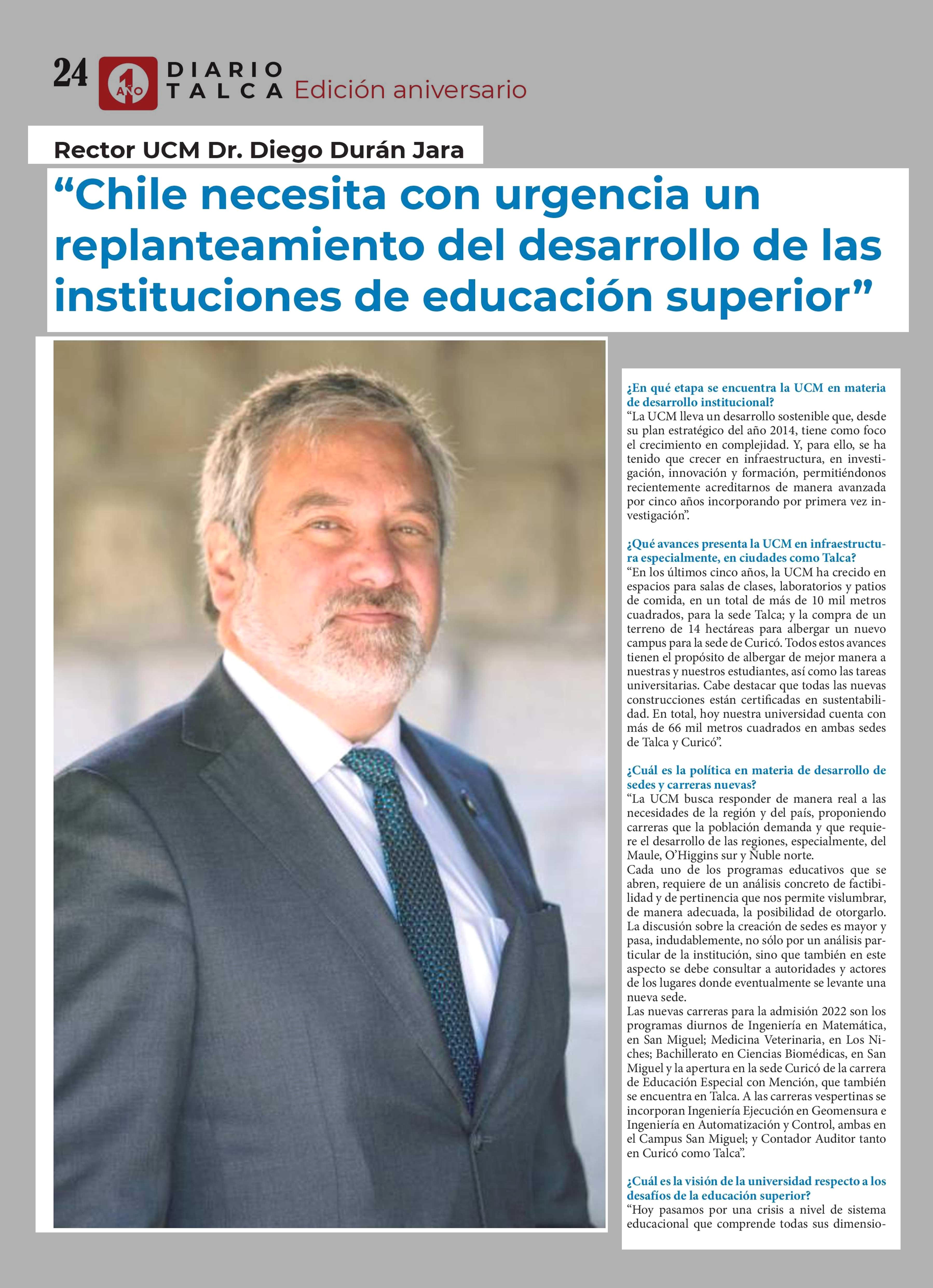 “Chile necesita con urgencia un replanteamiento del desarrollo de las instituciones de educación superior” 24-10-2021 Diario Talca |