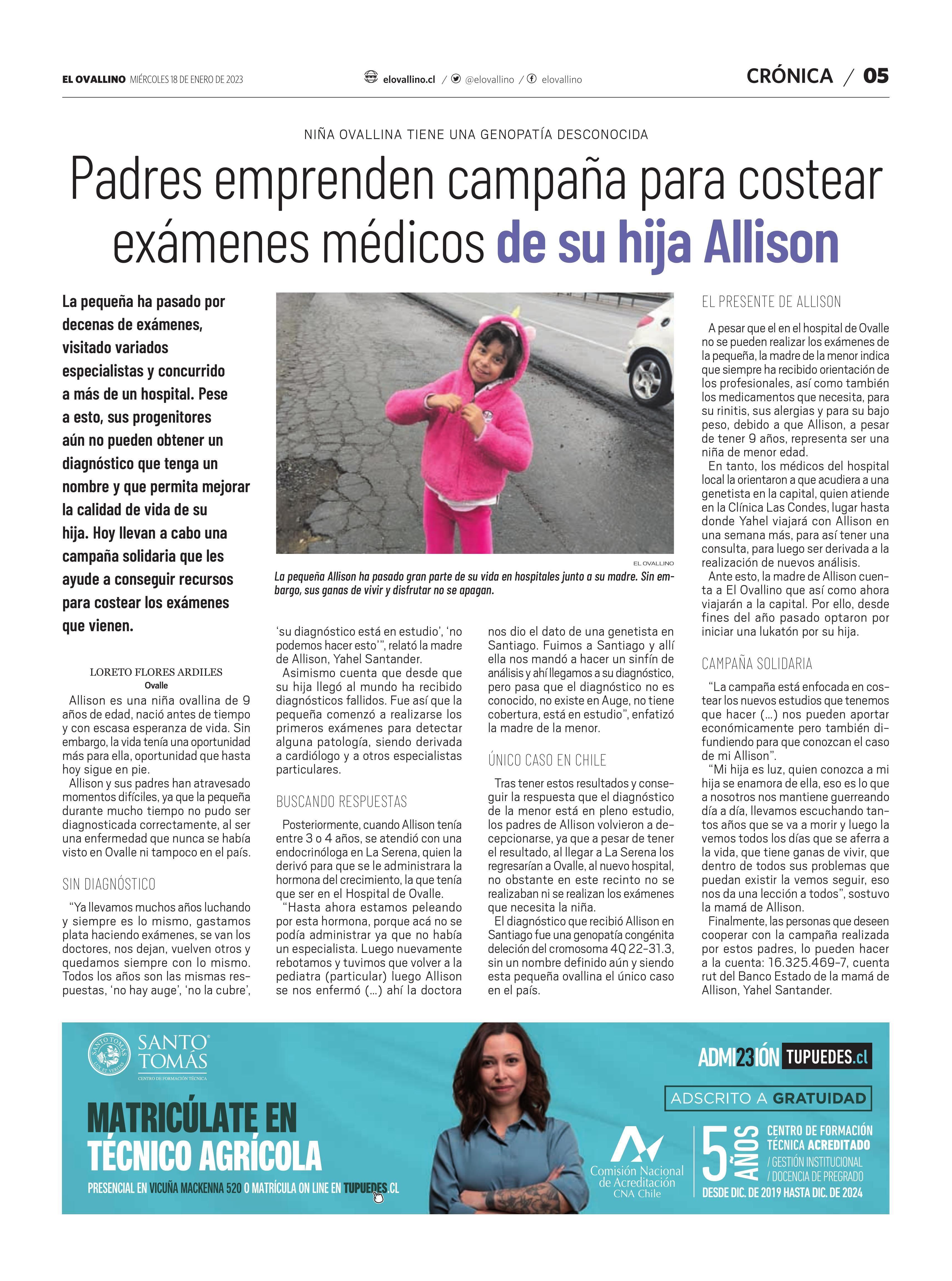 Padres emprenden campaña para costear exámenes médicos de su hija Allison 18-01-2023 El Ovallino |