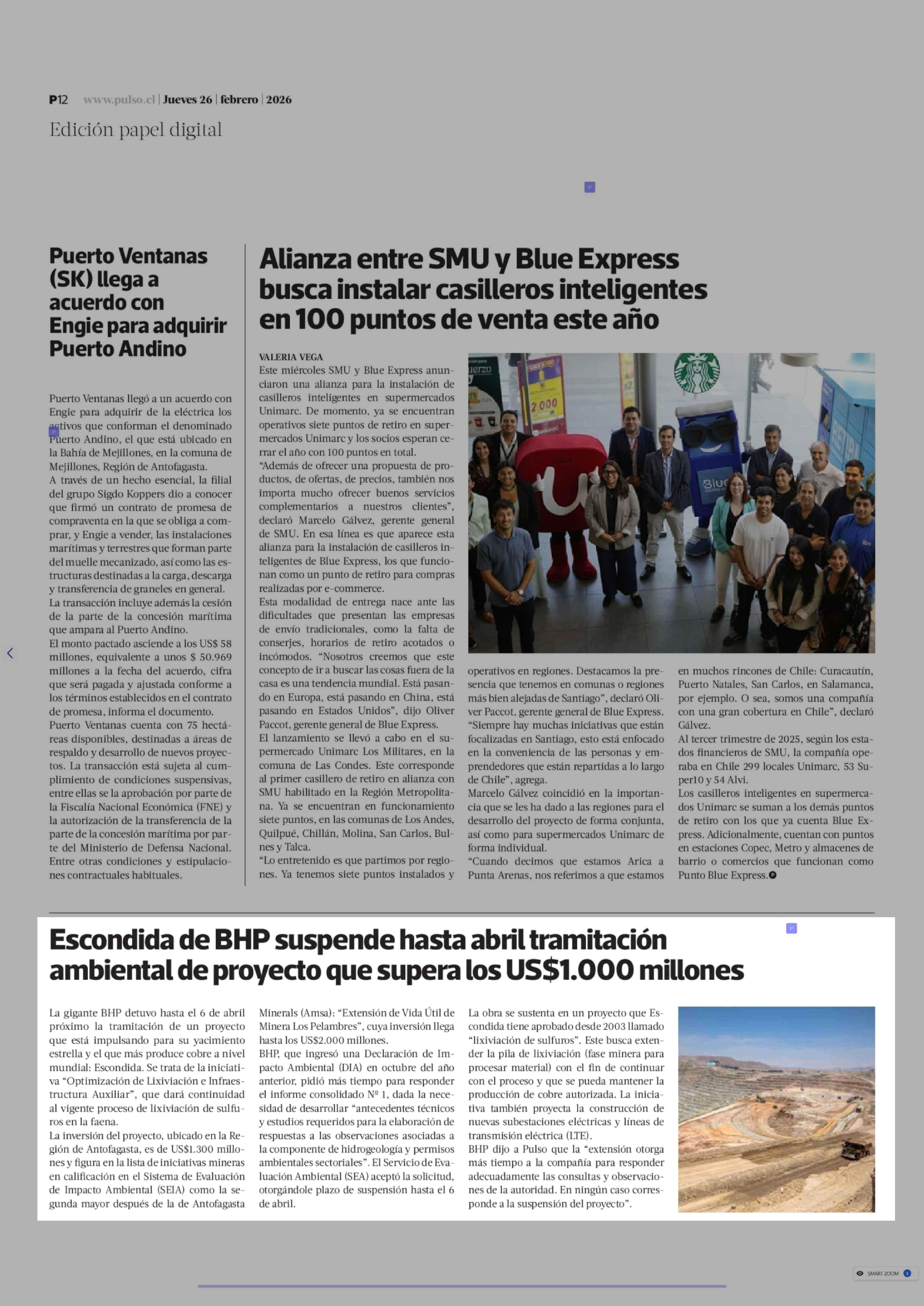 Escondida de BHP suspende hasta abril tramitación ambiental de proyecto que supera los US$1.000 millones 26-02-2026 La Tercera |