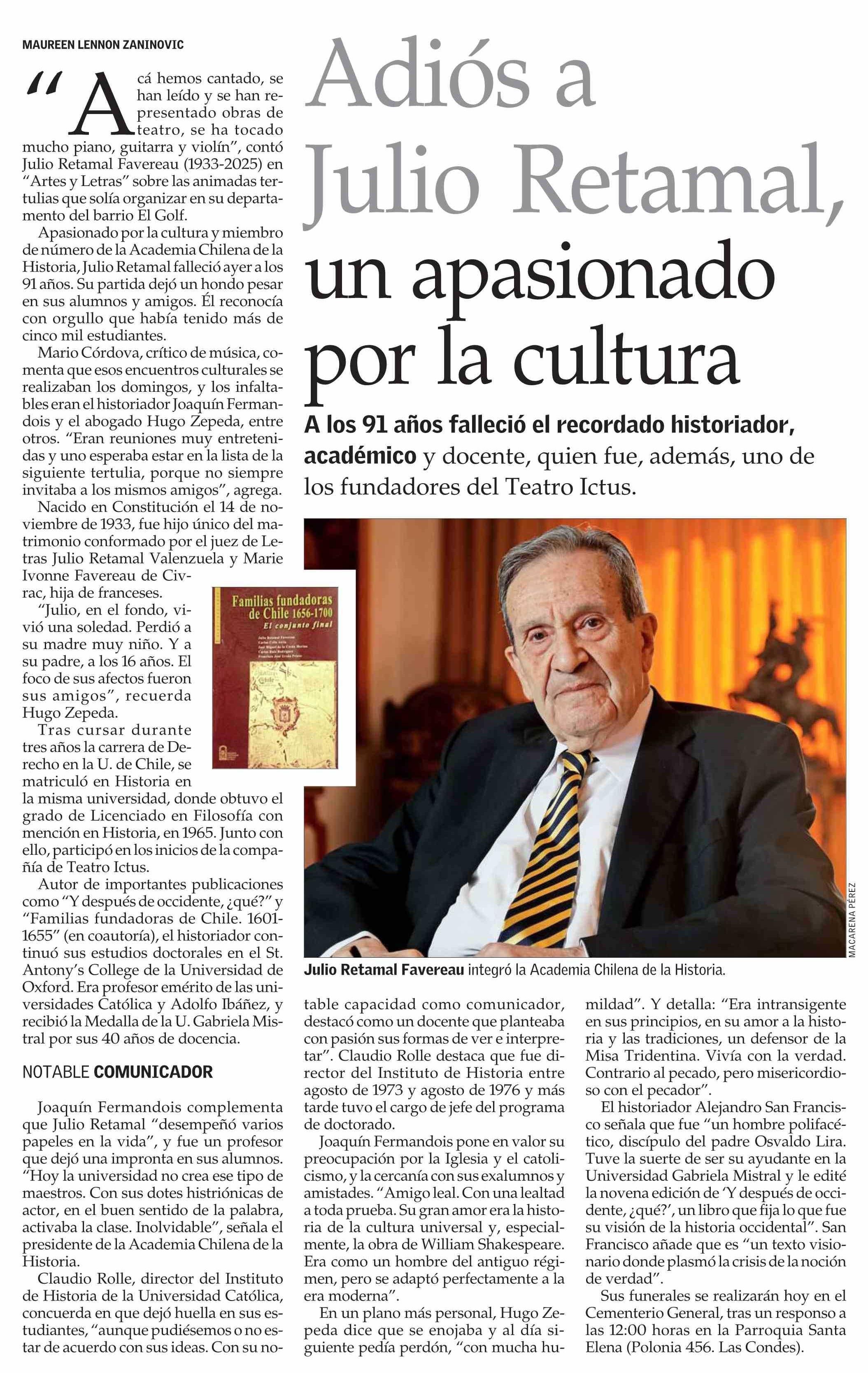 Adiós a Julio Retamal, un apasionado por la cultura 17-06-2025 El Mercurio |