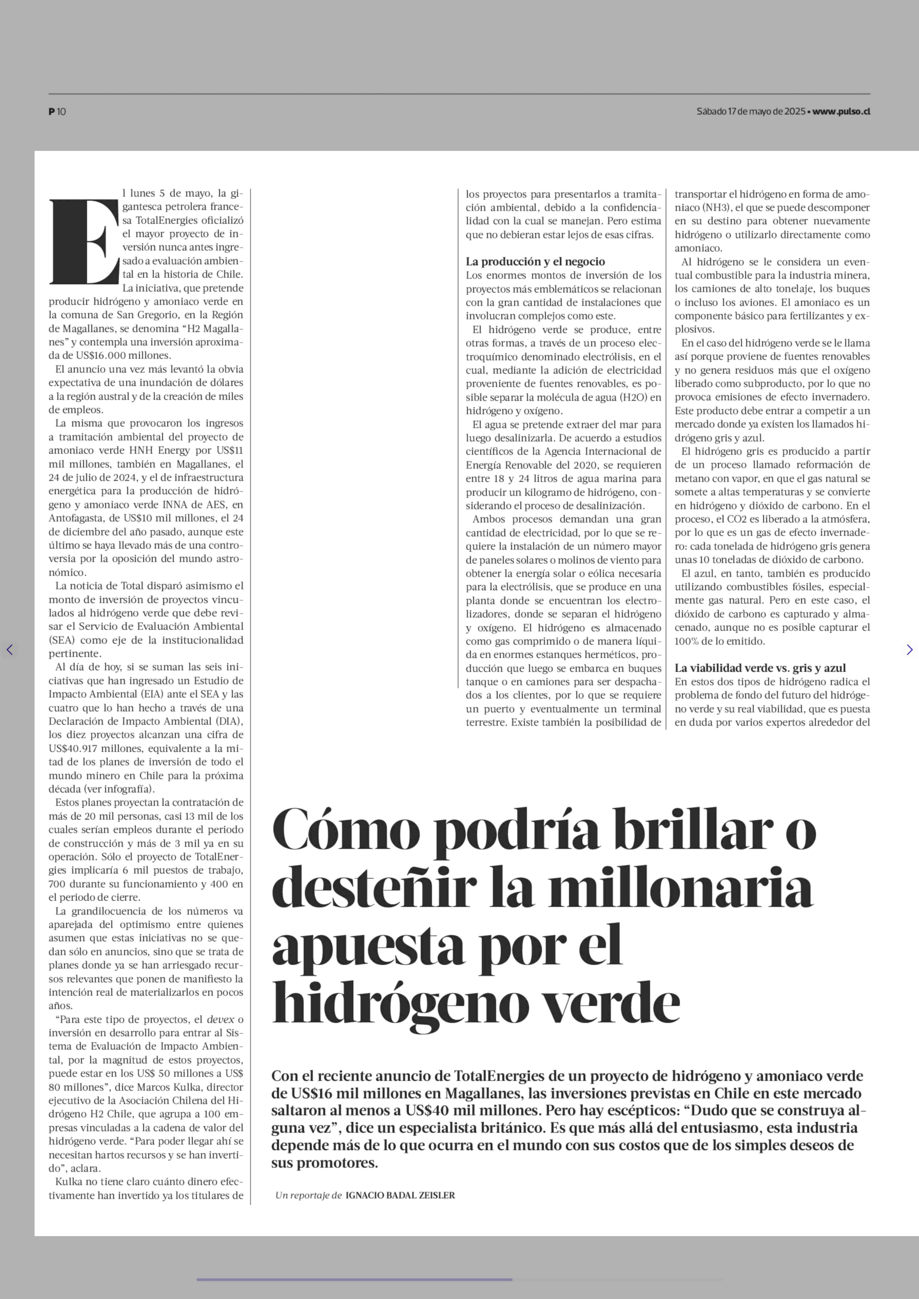 Cómo podría brillar o desteñir la millonaria apuesta por el hidrógeno verde 17-05-2025 La Tercera |