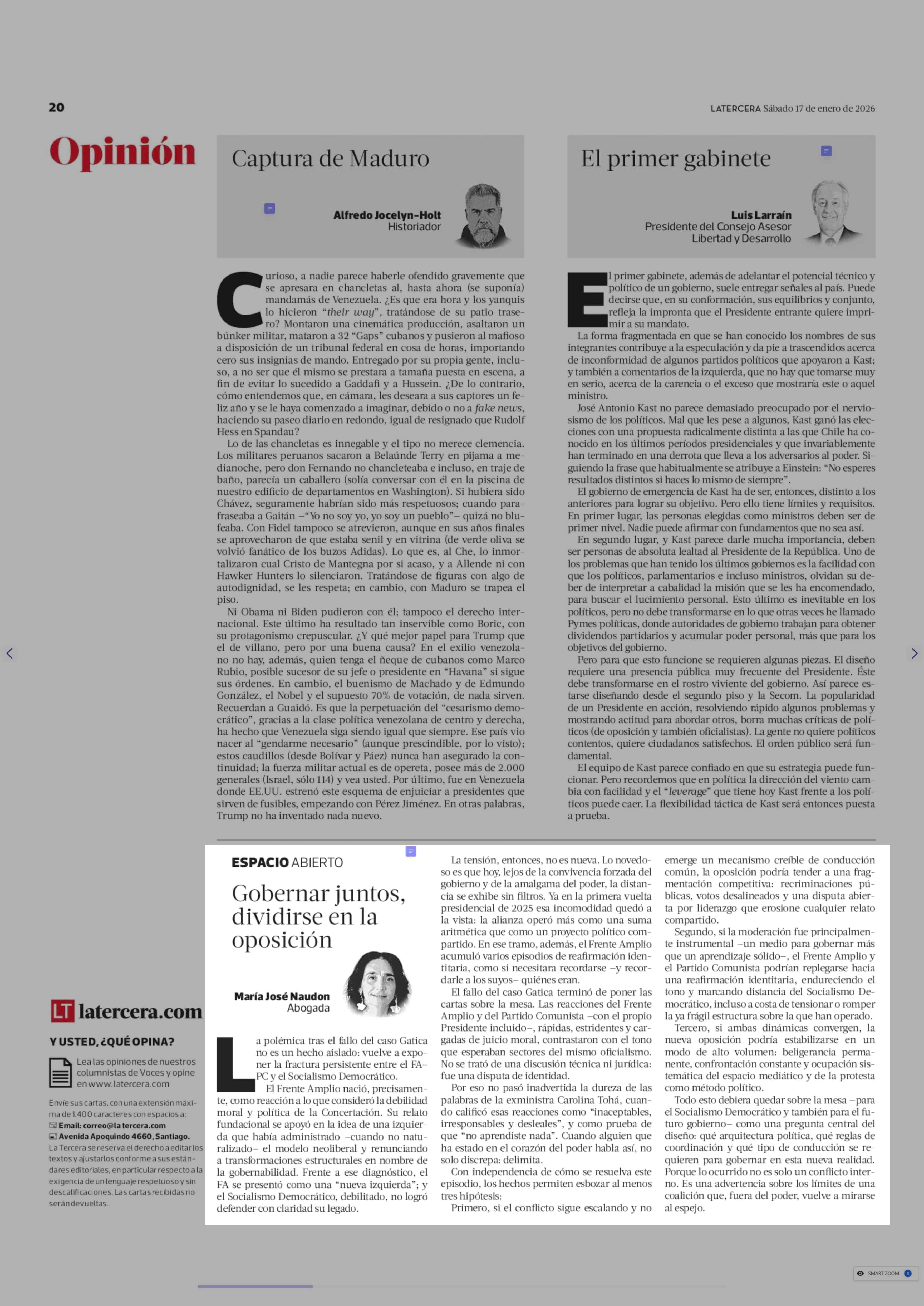 Columnas de Opinión: Gobernar juntos, dividirse en la oposición 17-01-2026 La Tercera |