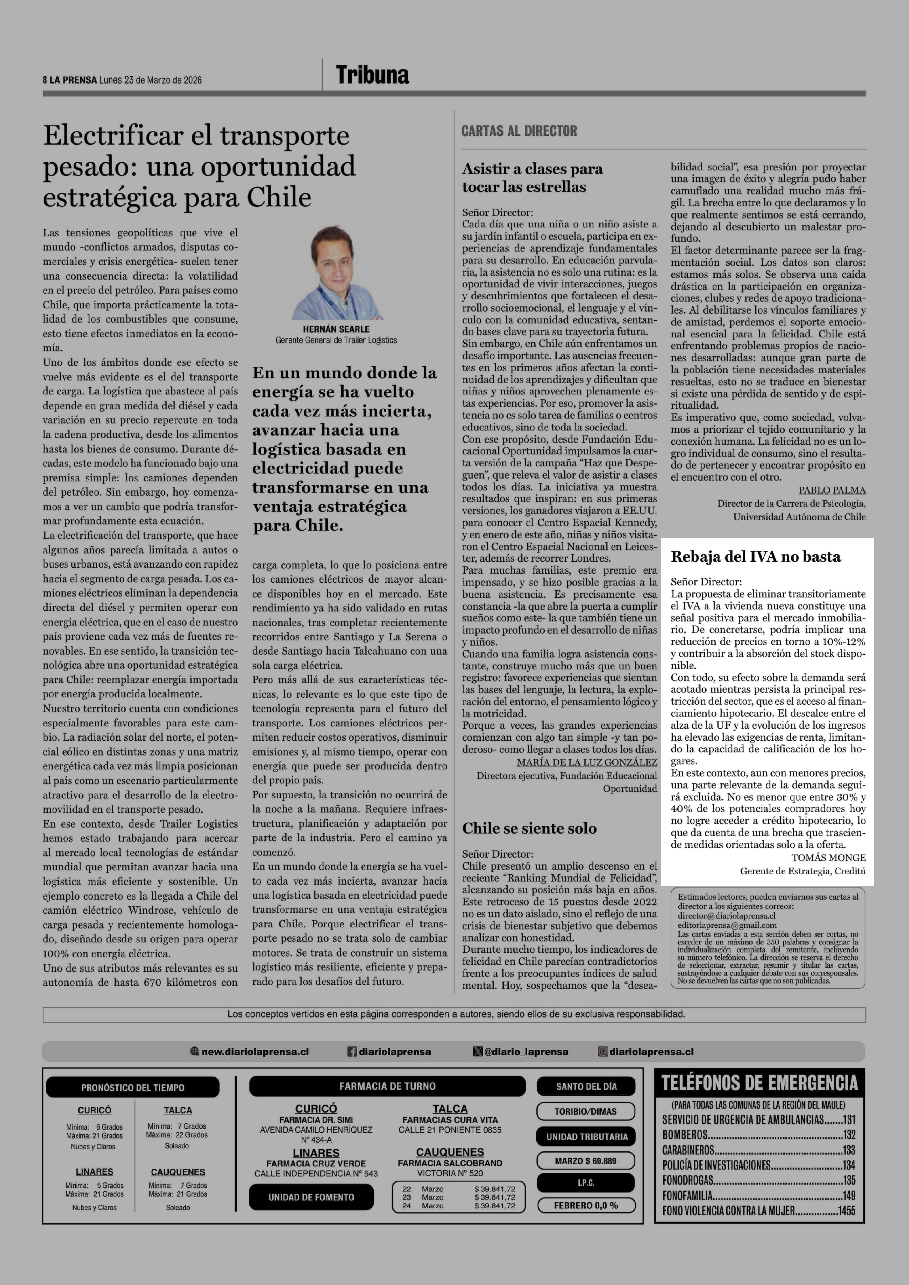 Cartas: Rebaja del IVA no basta 23-03-2026 La Prensa de Curicó |