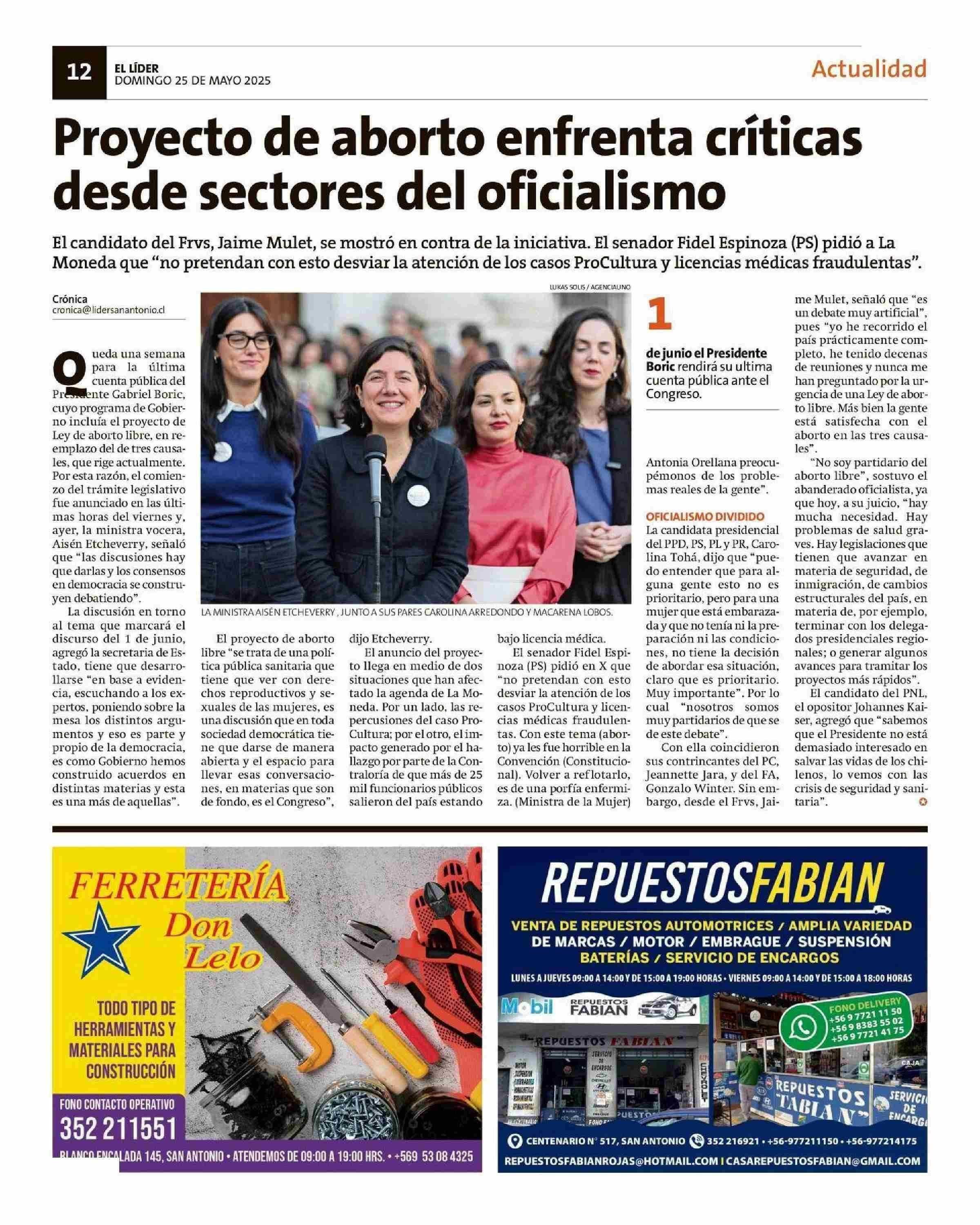 Proyecto de aborto enfrenta criticas desde sectores del oficialismo 25-05-2025 El Líder |