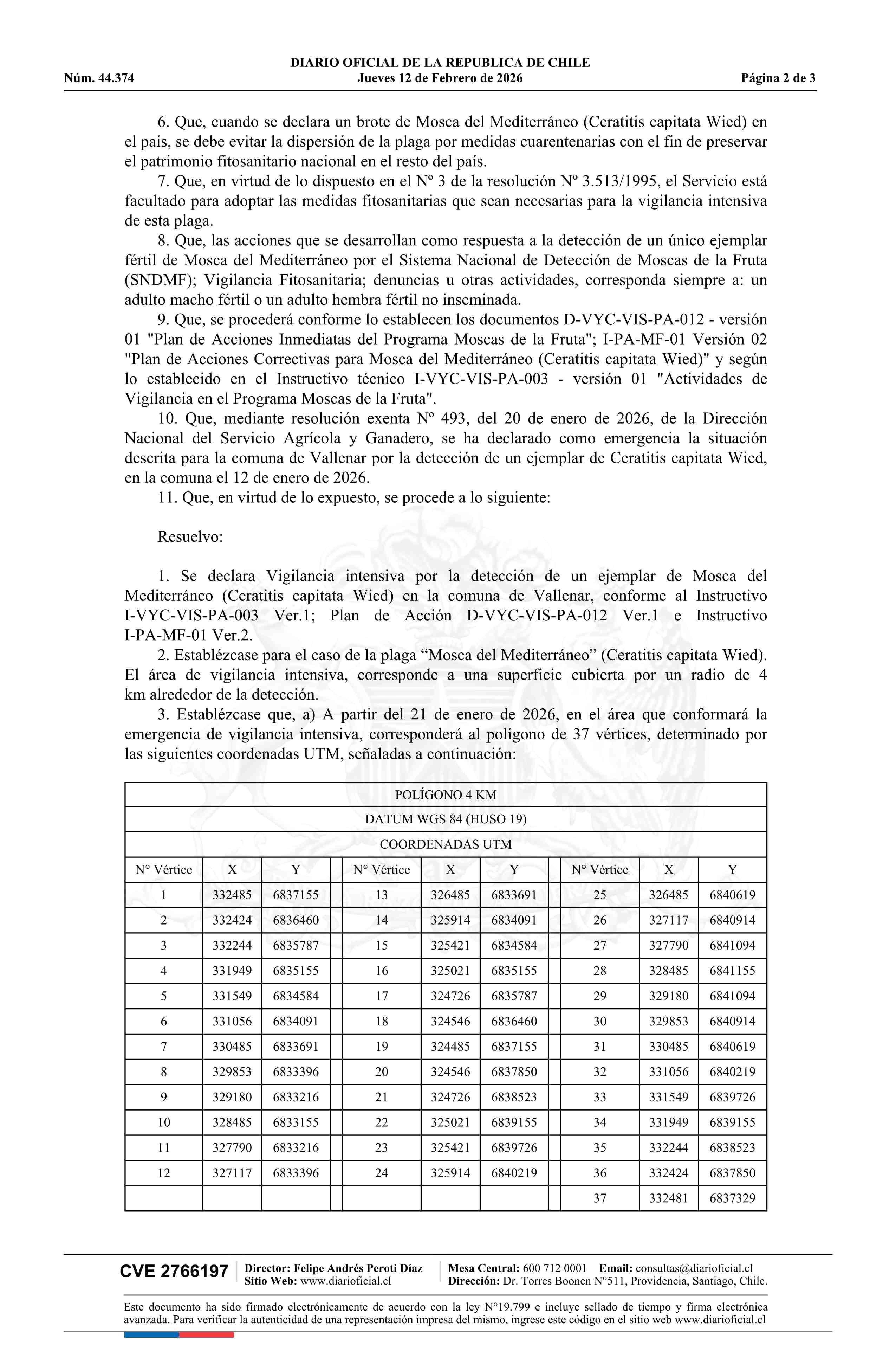 Resolución exenta número 27, de 2026.- Activa vigilancia intensiva ante la detección de un ejemplar adulto de Mosca del Mediterráneo (Ceratitis capitata Wied.) en la comuna de Vallenar 12-02-2026 Diario Oficial Edición Electrónica |