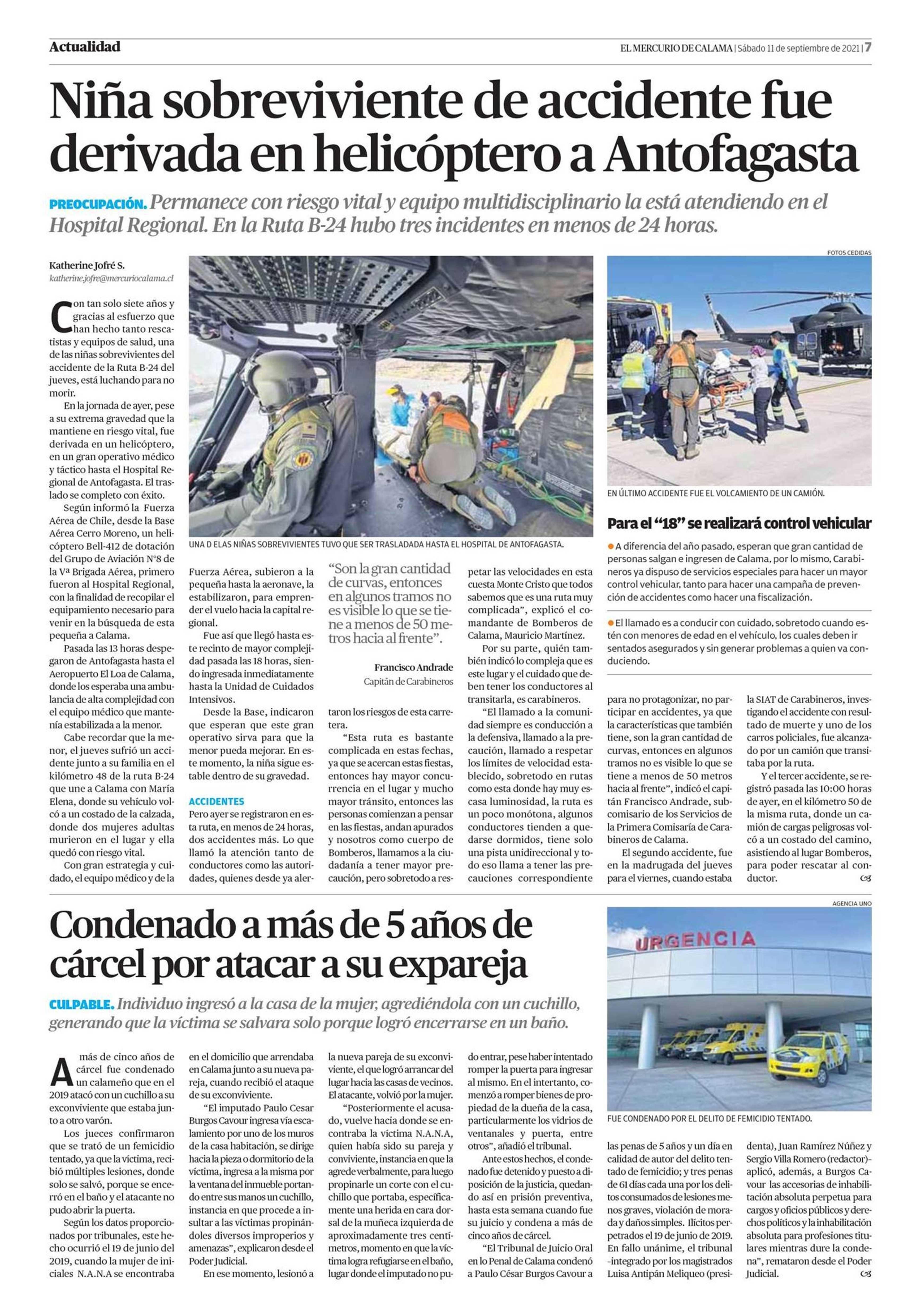 Niña sobreviviente de accidente fue derivada en helicóptero a Antofagasta 11-09-2021 El Mercurio de Calama |