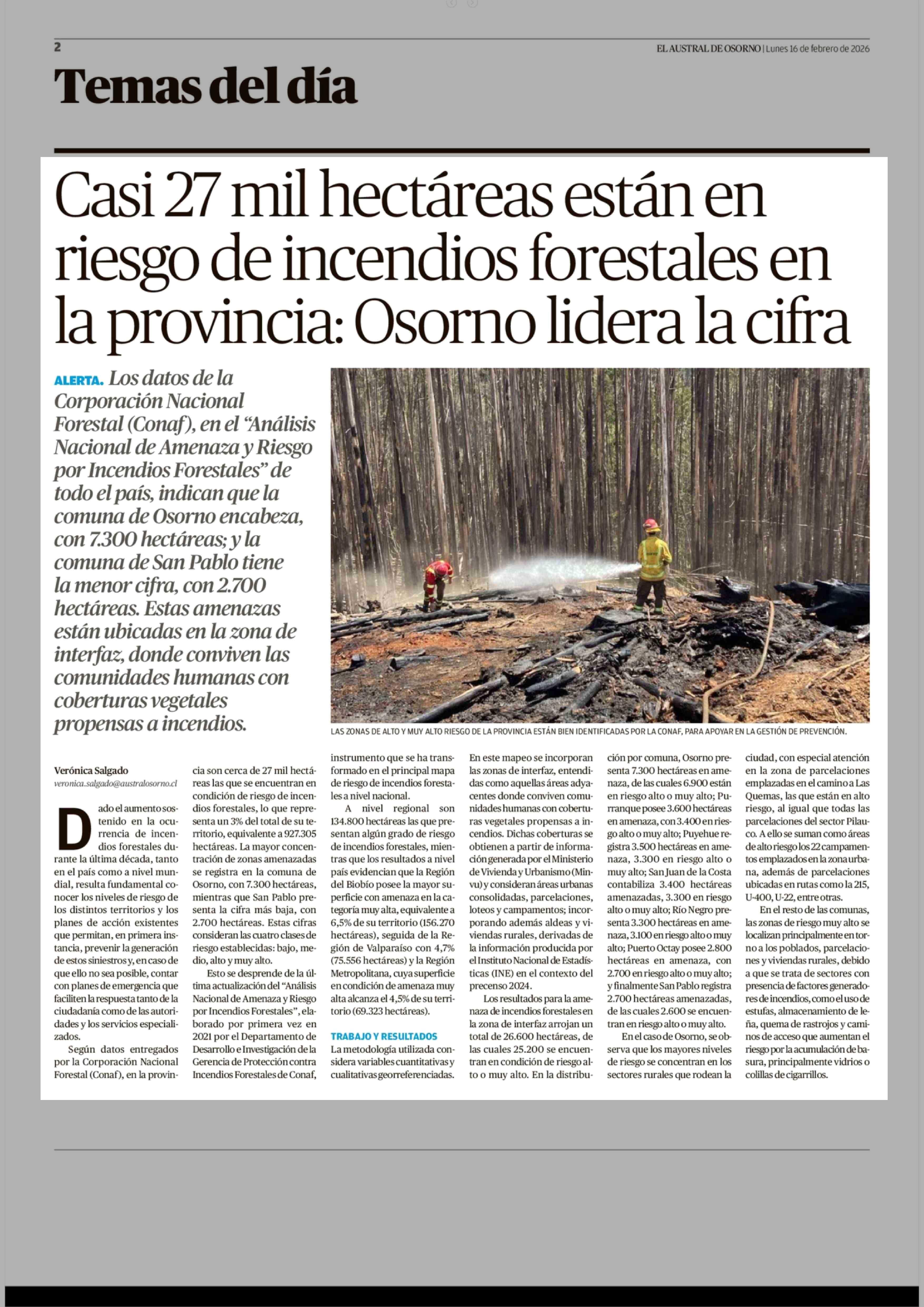 Título: Casi 27 mil hectáreas están en riesgo de incendios forestales en la provincia: Osorno lidera la cifra