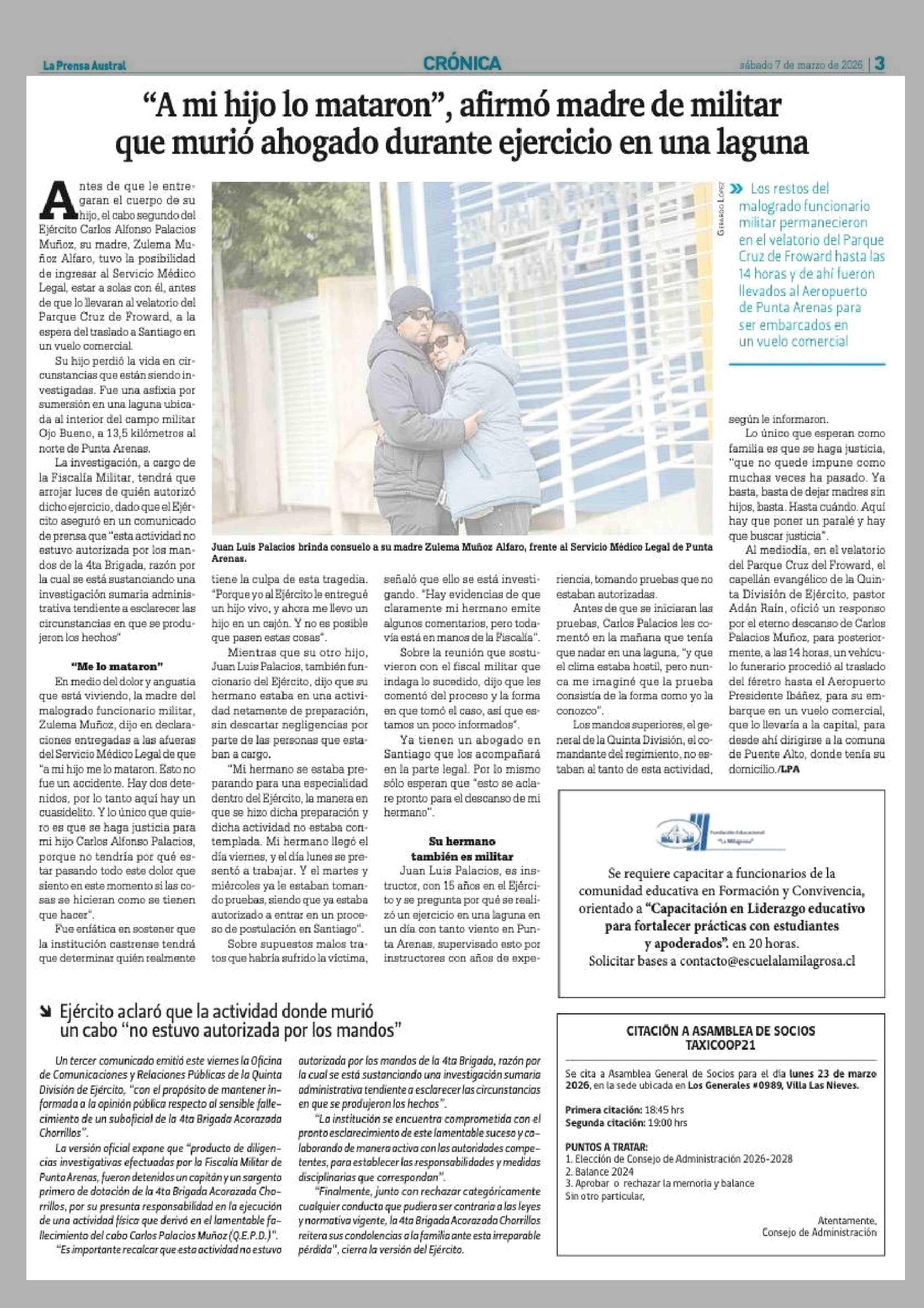 "A mi hijo lo mataron", afirmó madre de militar que murió ahogado durante ejercicio en una laguna 07-03-2026 La Prensa Austral |