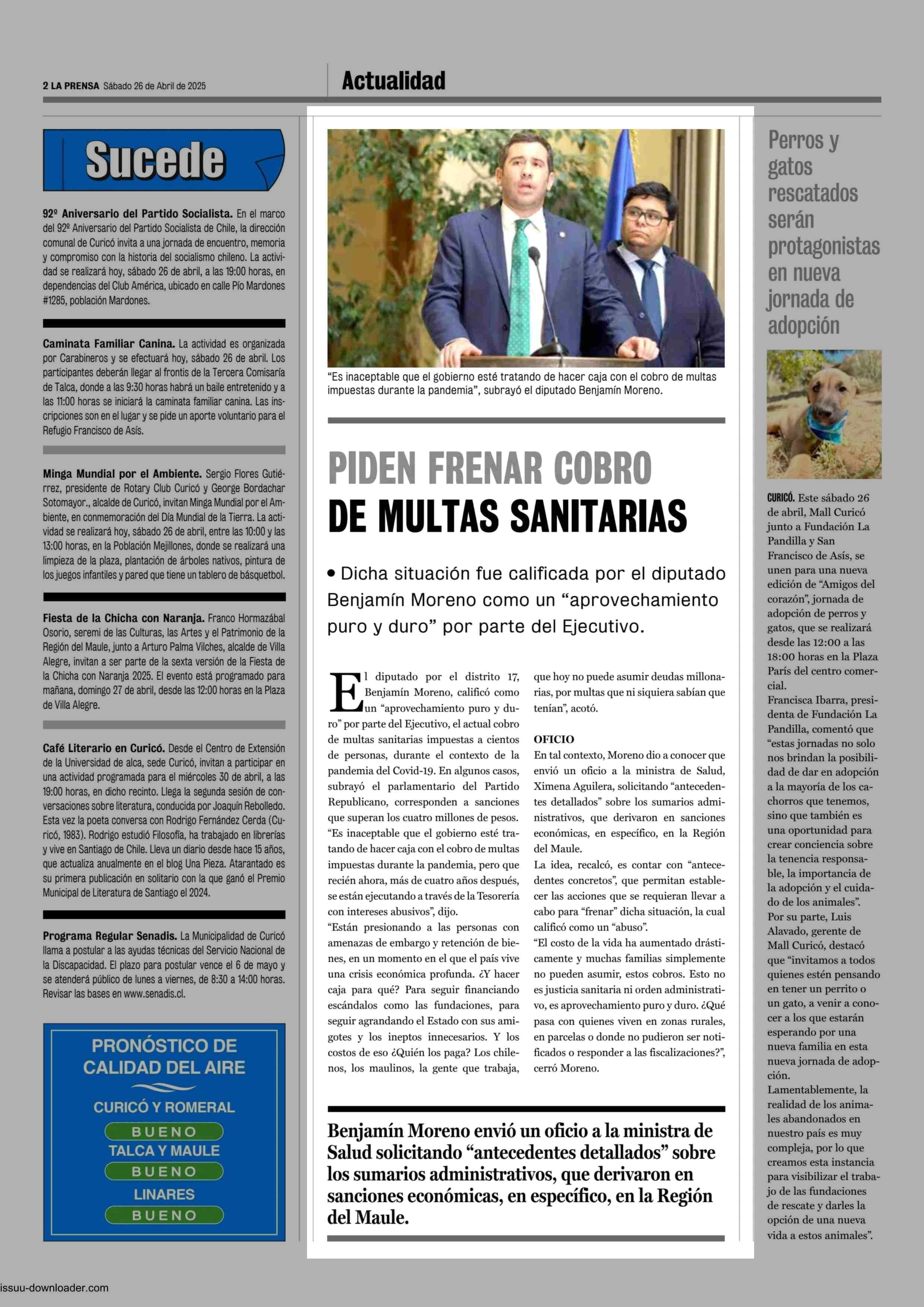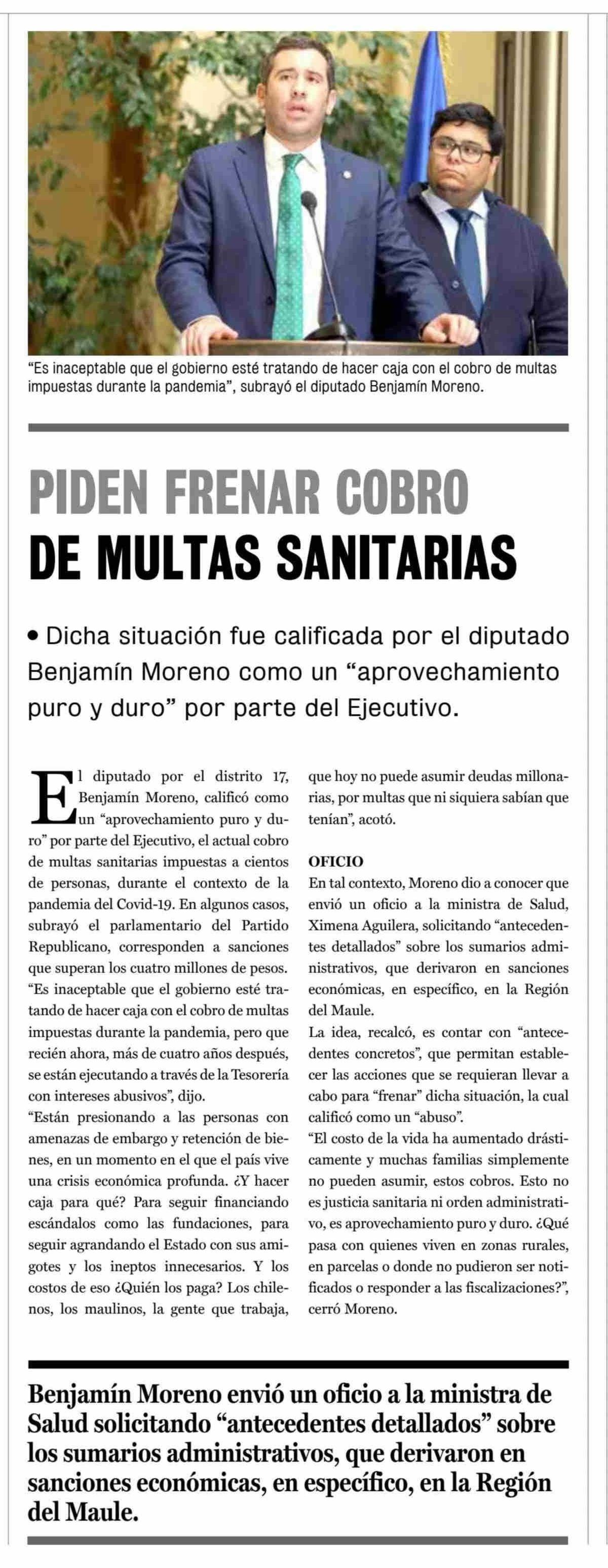 PIDEN FRENAR COBRO DE MULTAS SANITARIAS 26-04-2025 La Prensa de Curicó |